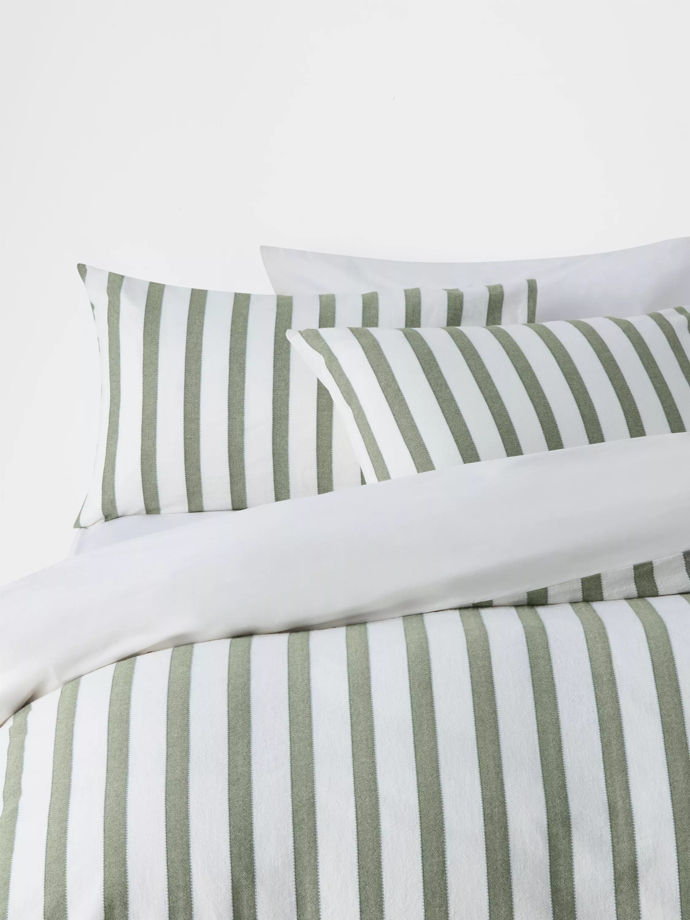 This bedding is made from cotton fabric which is naturally breathable and has beautifully woven stripe details enhanced with a running stitch embroidery. The reverse is plain for a fresh and airy look and feel.