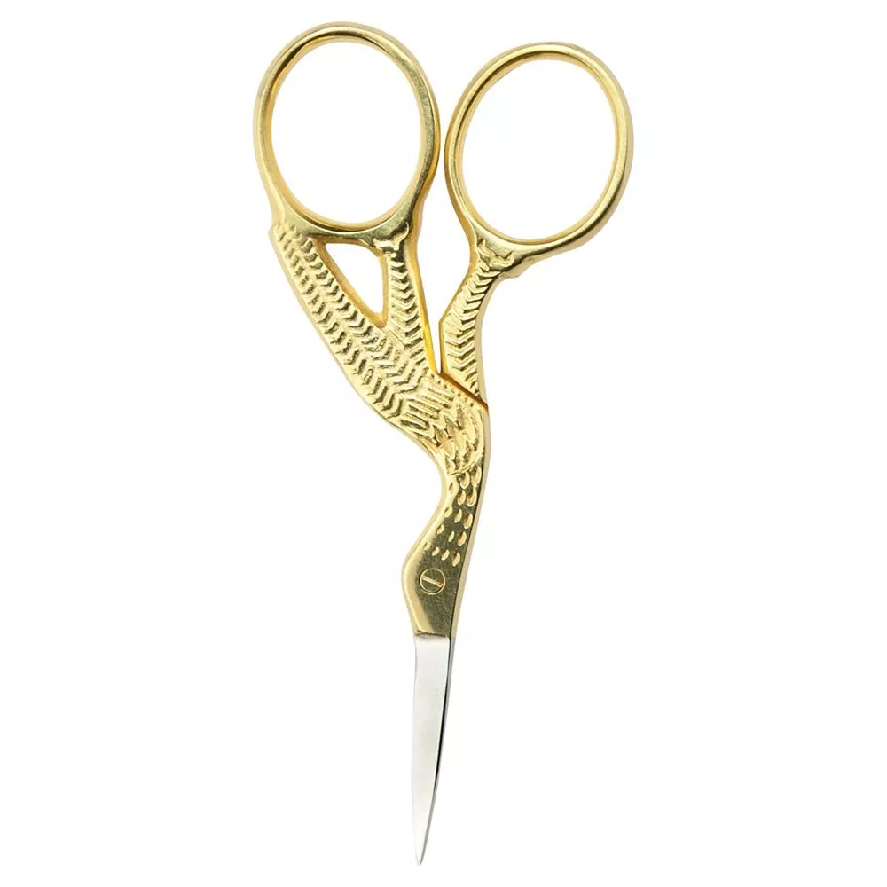 A traditional design of embroidery scissor, where the head and beak of the stork make up the blades and hinge, and the feet make up the handles.