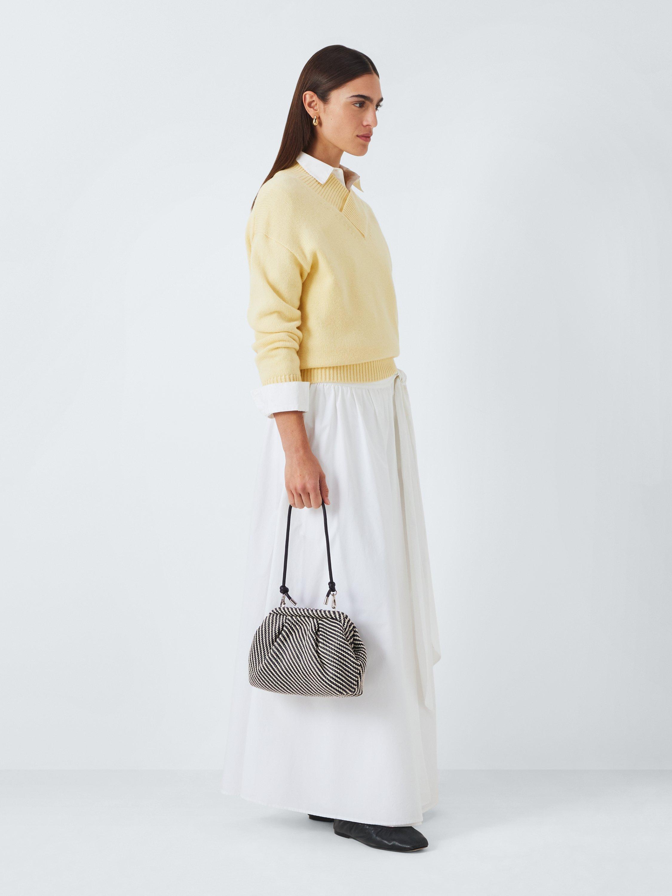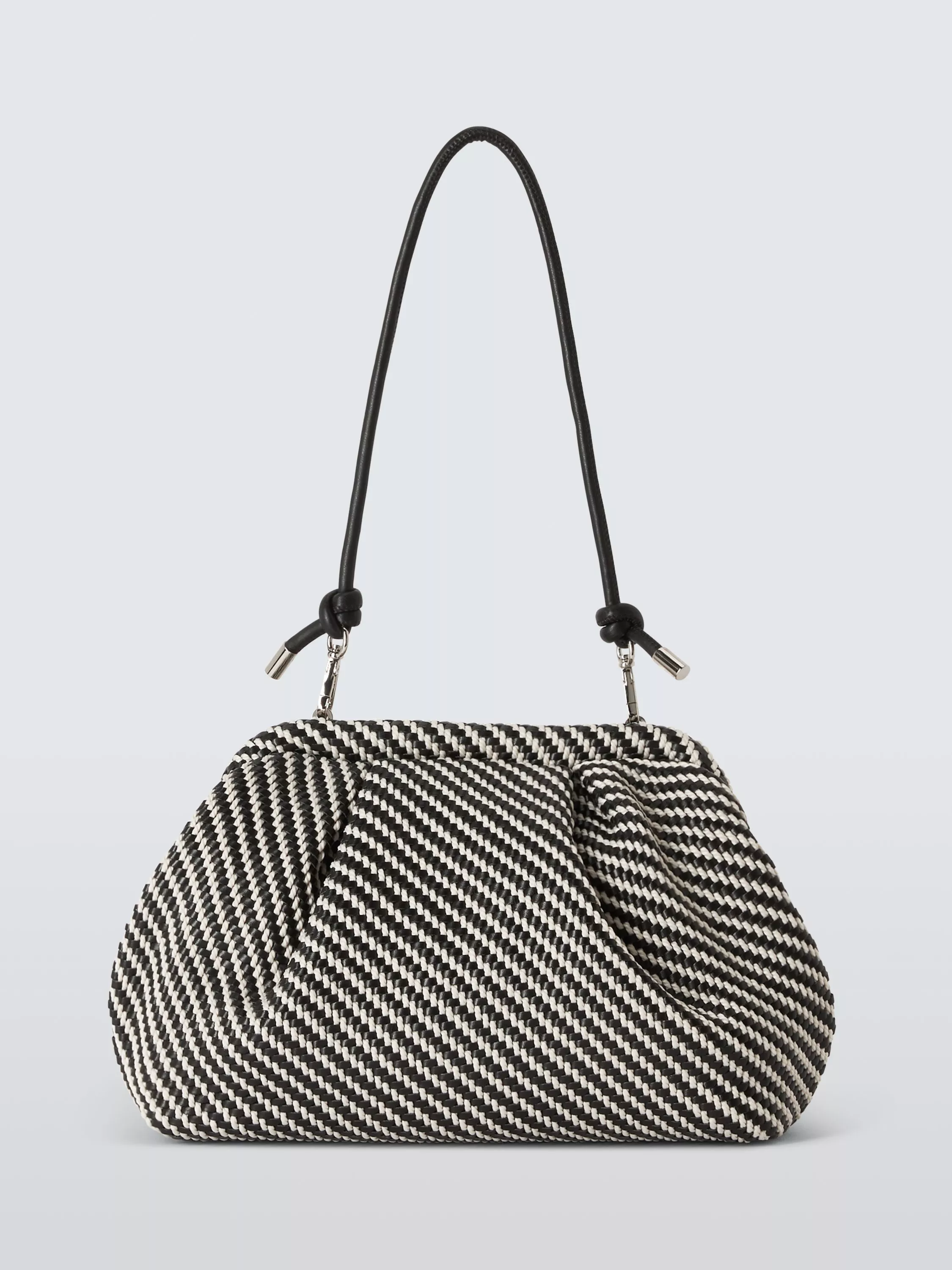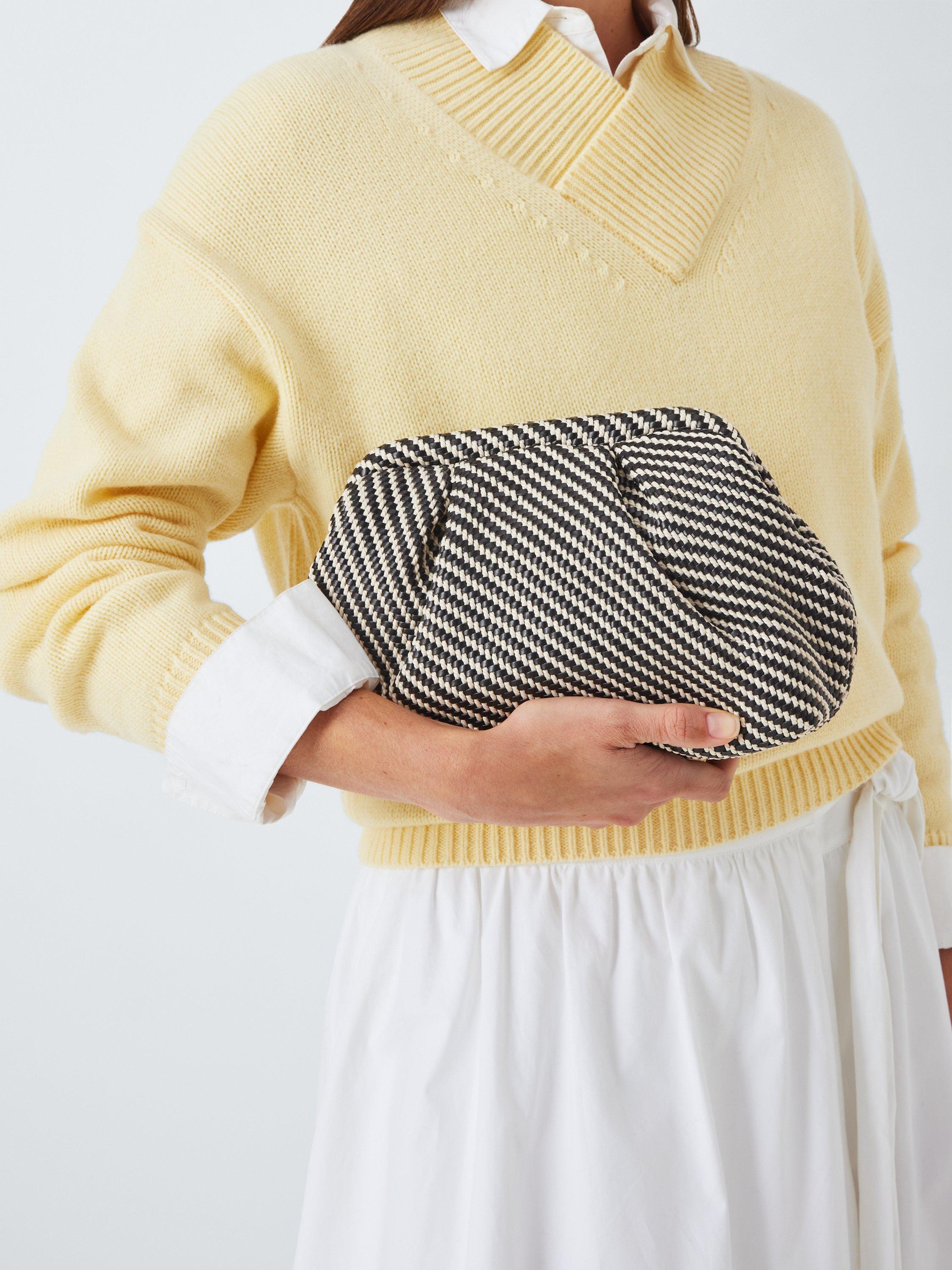Hold it on your hand or go hands-free with the knotted artisinal-style strap on our striped clutch bag. With a clear black and white pattern, this style will add texture and interest to your outfit and it will also hold its shape when you put it down.