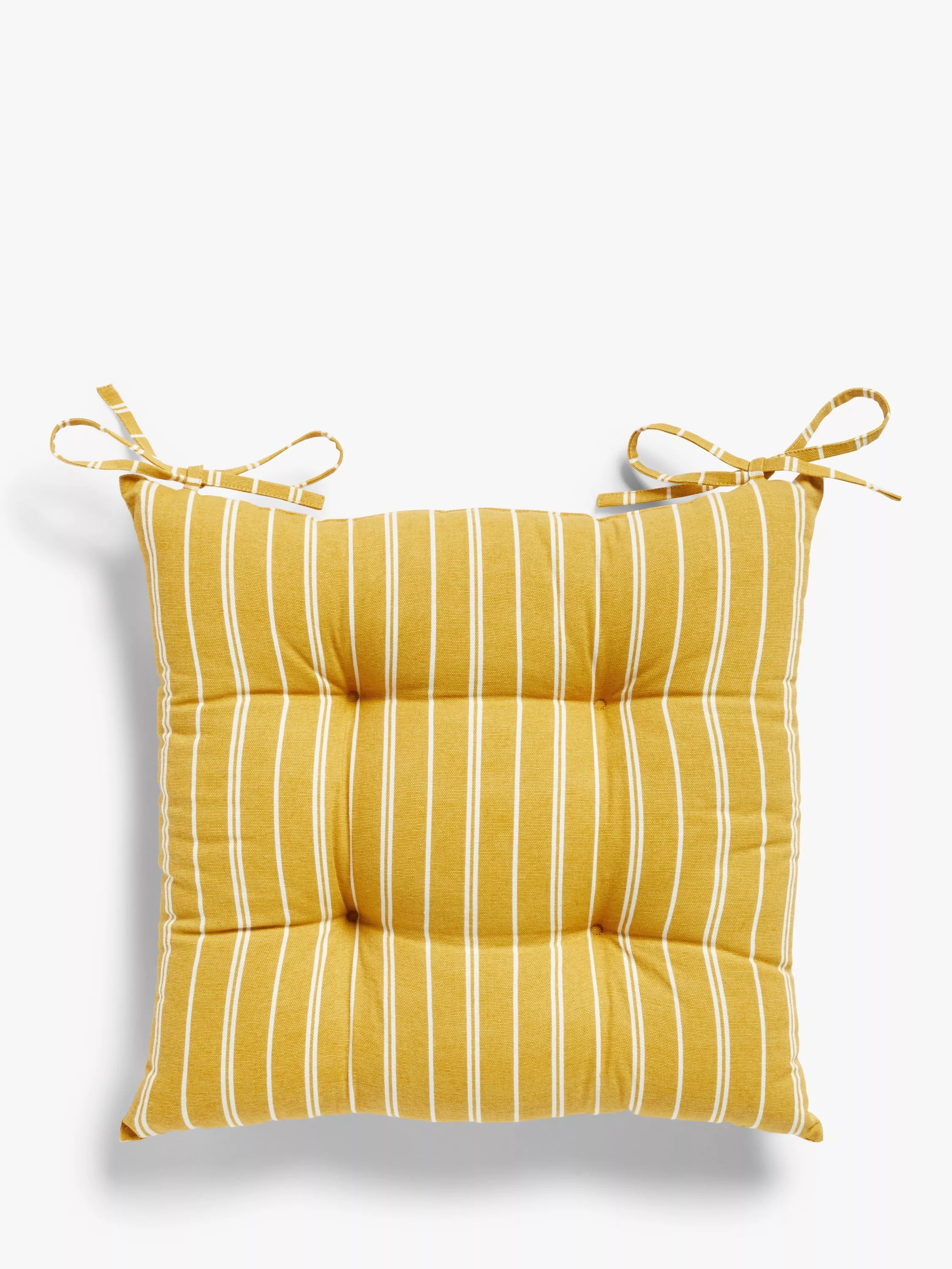 A striped seat pad with a comfy polyester filling and cotton ties. Available in two on-trend colours for spring.