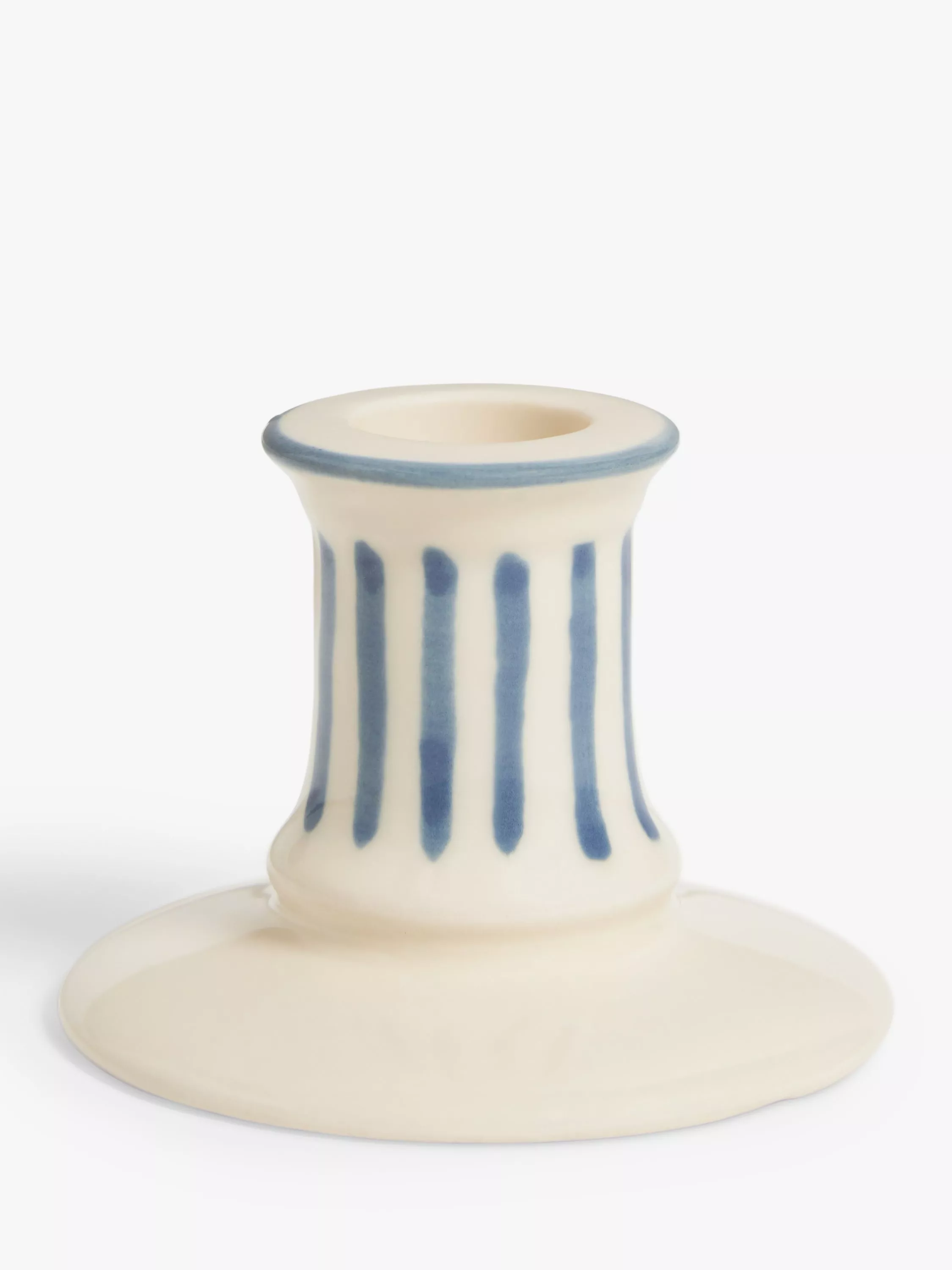 Vintage-inspired candlestick holder made from durable stoneware. Hand-painted stripes add a unique touch.