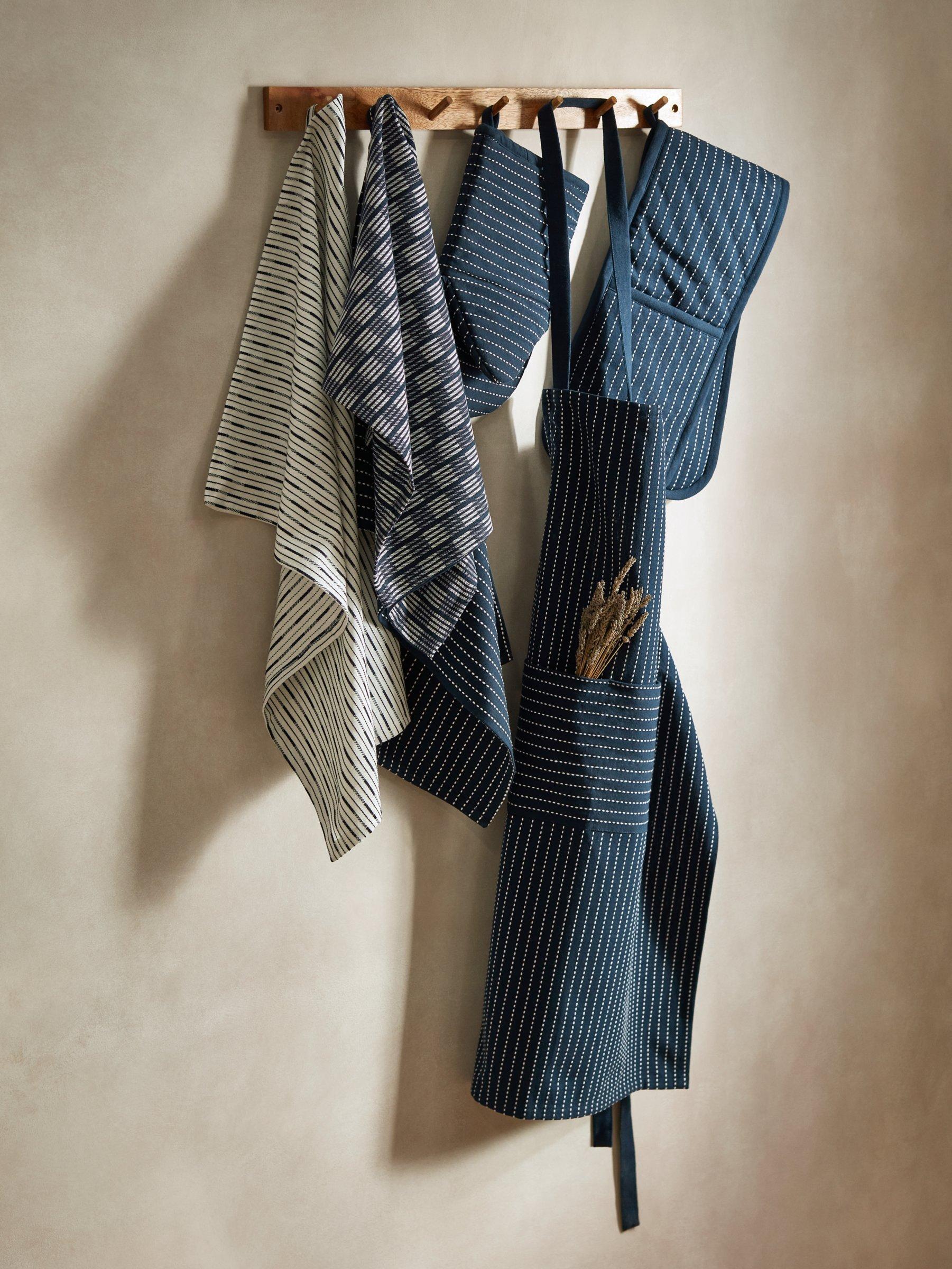 Classic stripe kitchen apron. Designed with a neck loop, adjustable ties, a hanging-up hook and a handy front pocket for small utensils, barbecue tools or your phone. Made of pure cotton, it's durable, machine washable and coordinates with the matching striped oven gloves and tea towels.
