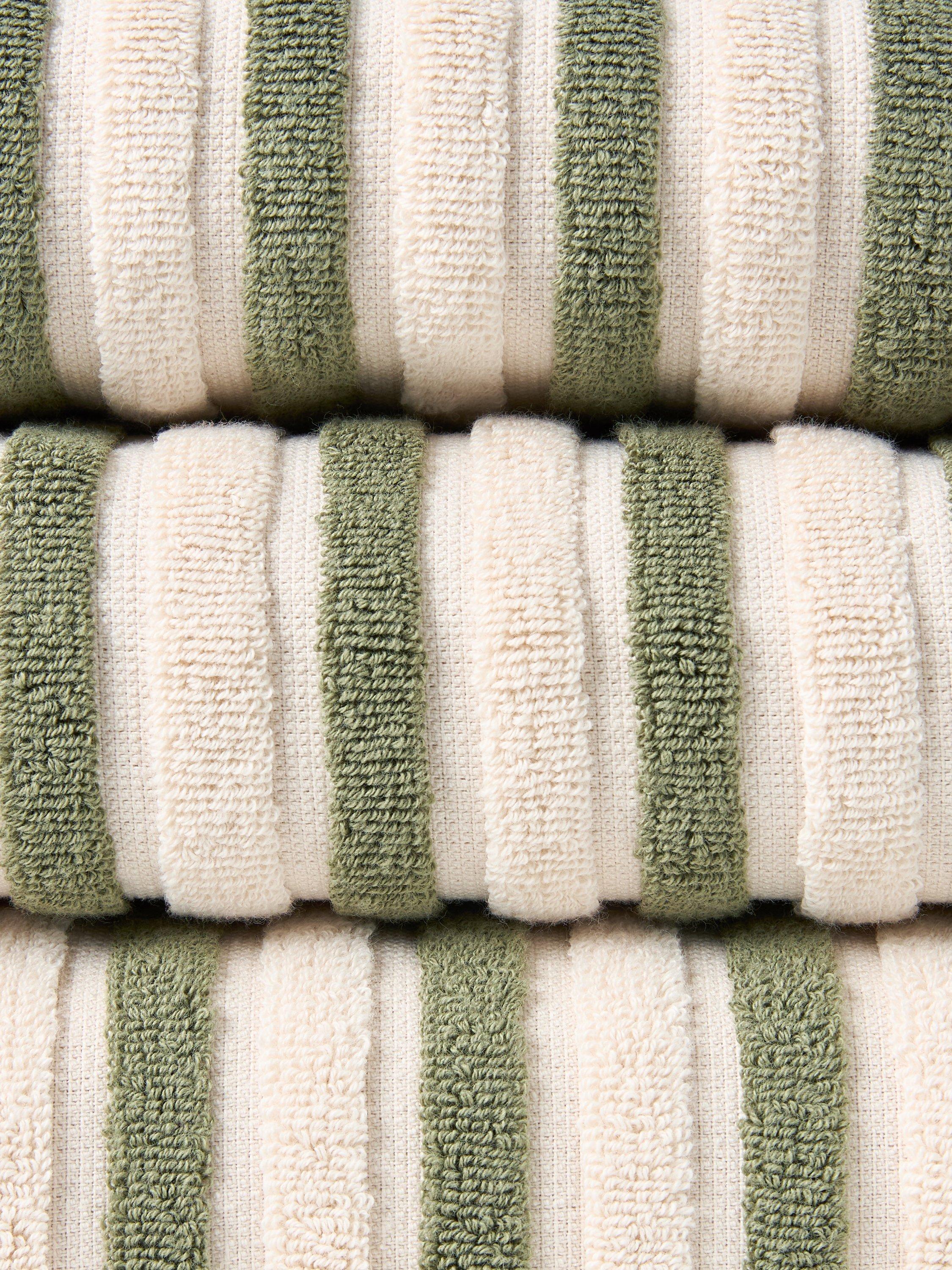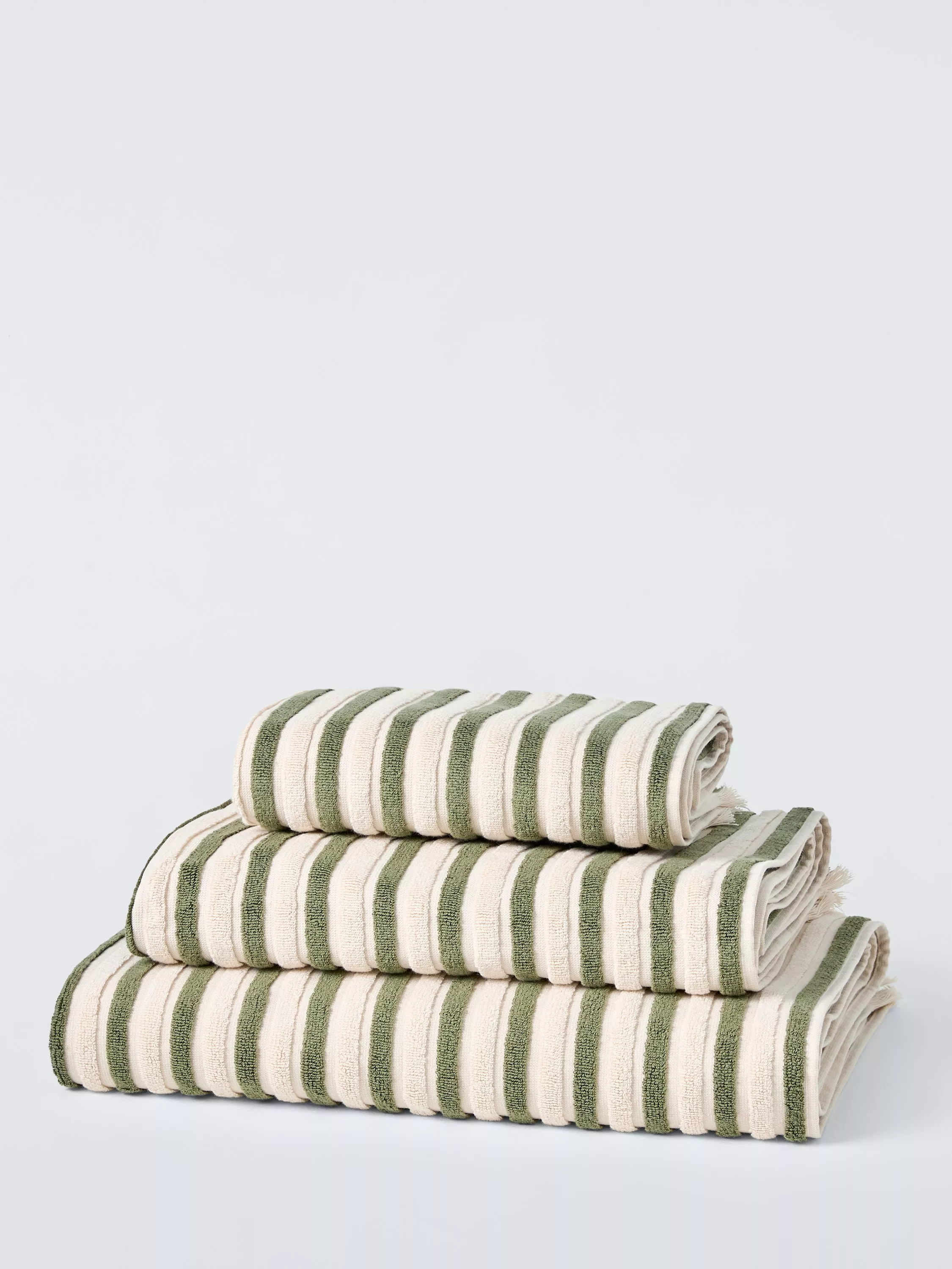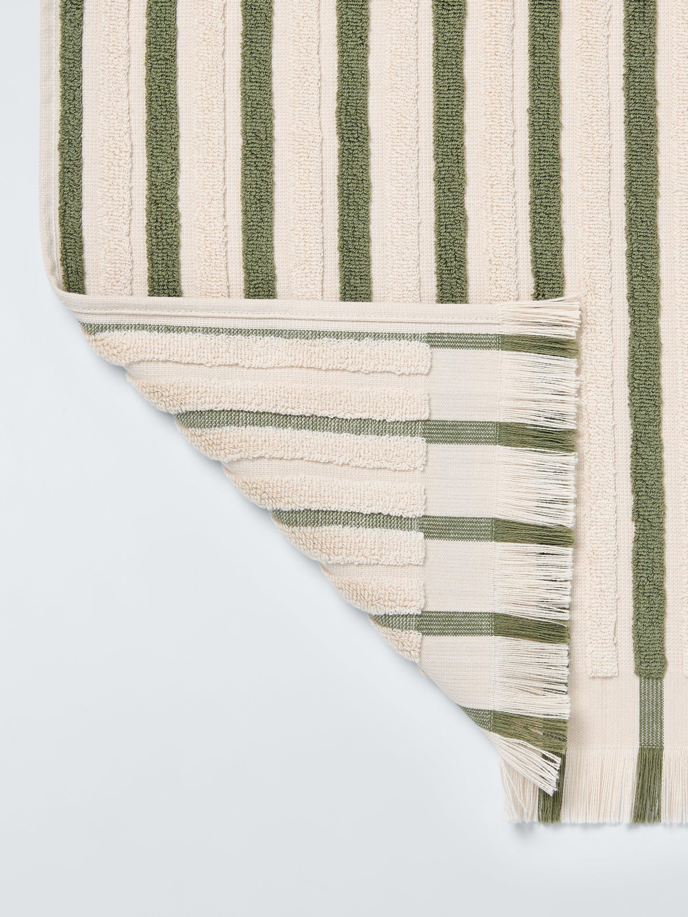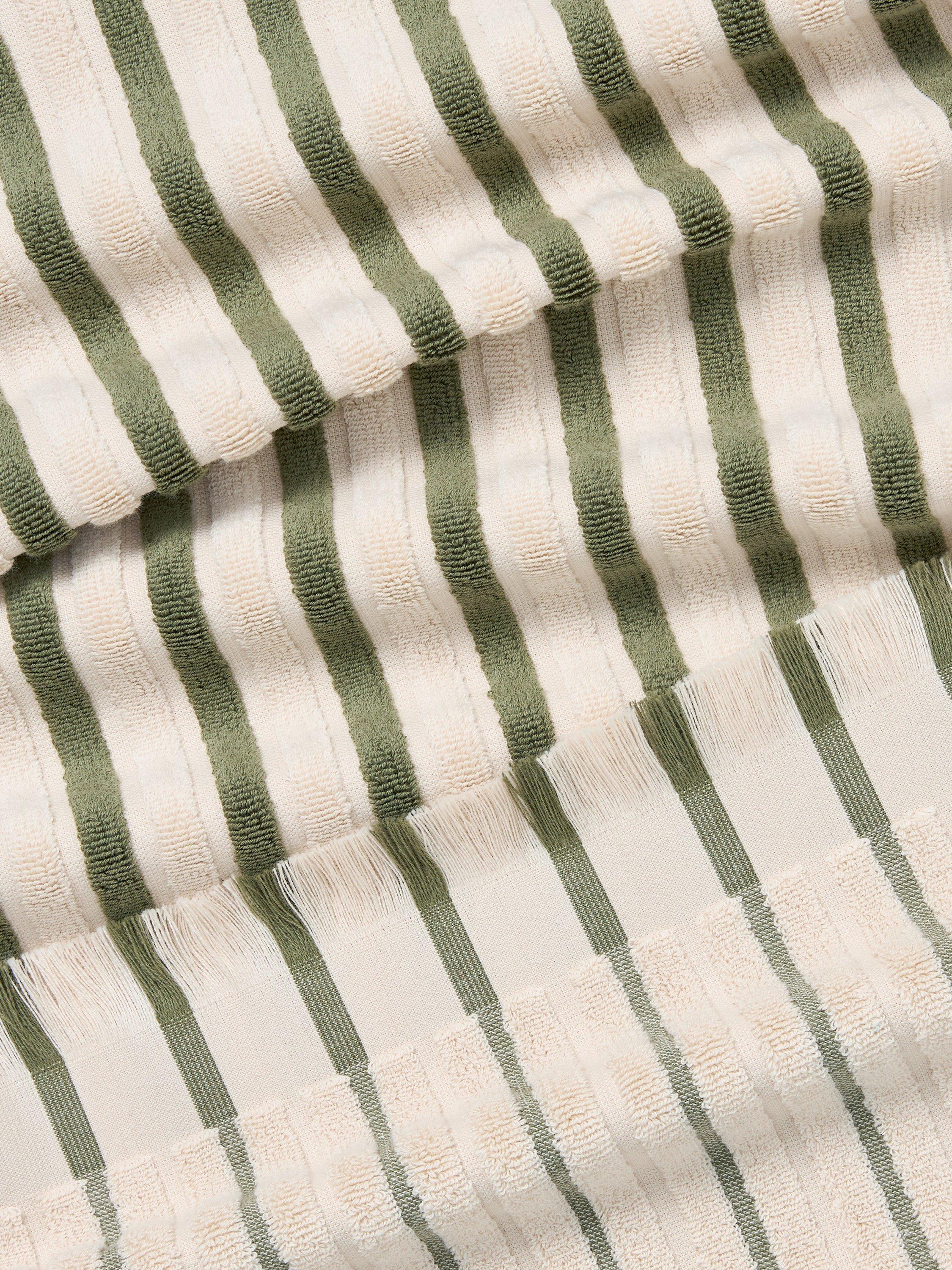 A smart, sculpted stripe and soft fringe combine in these looped pile towels.
