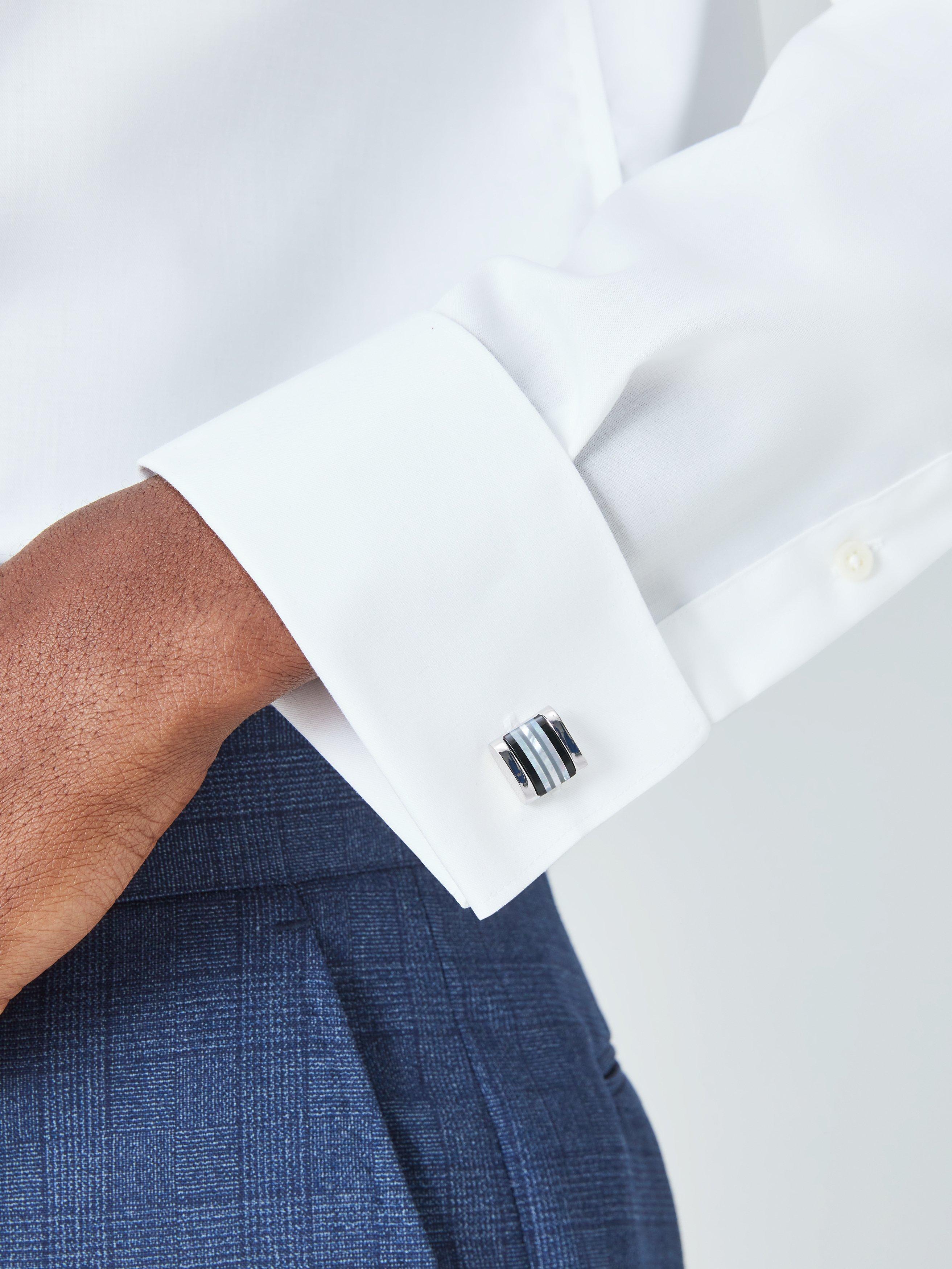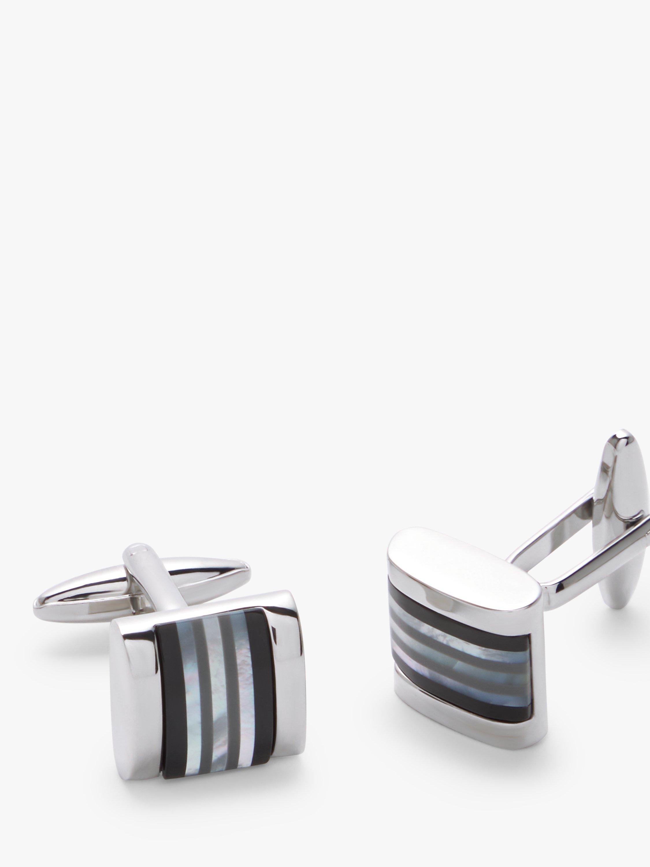 Complete your formal attire with these debonair cufflinks, featuring elegant striped semi-precious stone design comprised of mother of pearl, onyx and hematite.