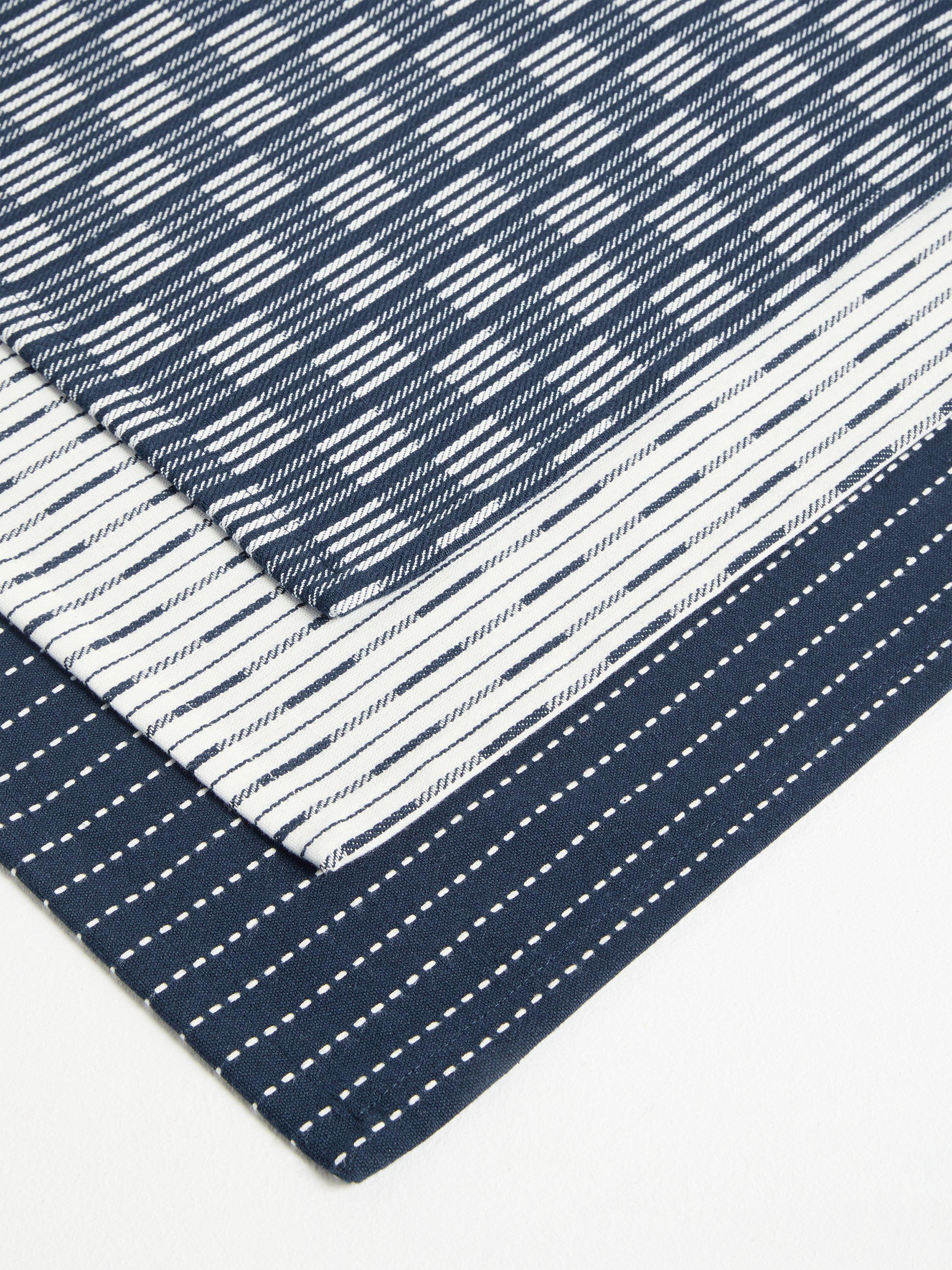 This pack of three tea towels includes two contemporary variations on classics stripes. Made of pure cotton, they're durable, machine washable and coordinate with the matching oven gloves and kitchen apron.