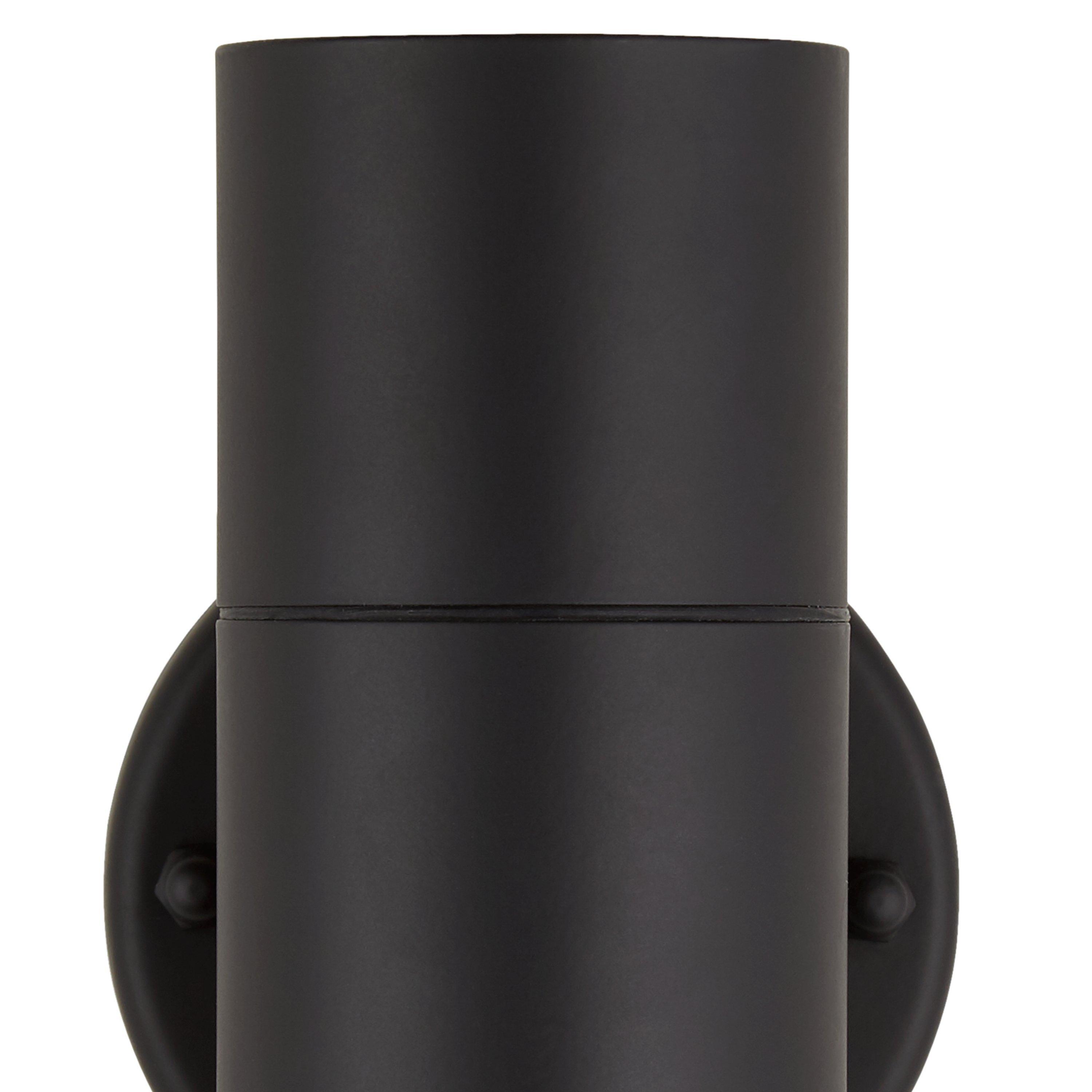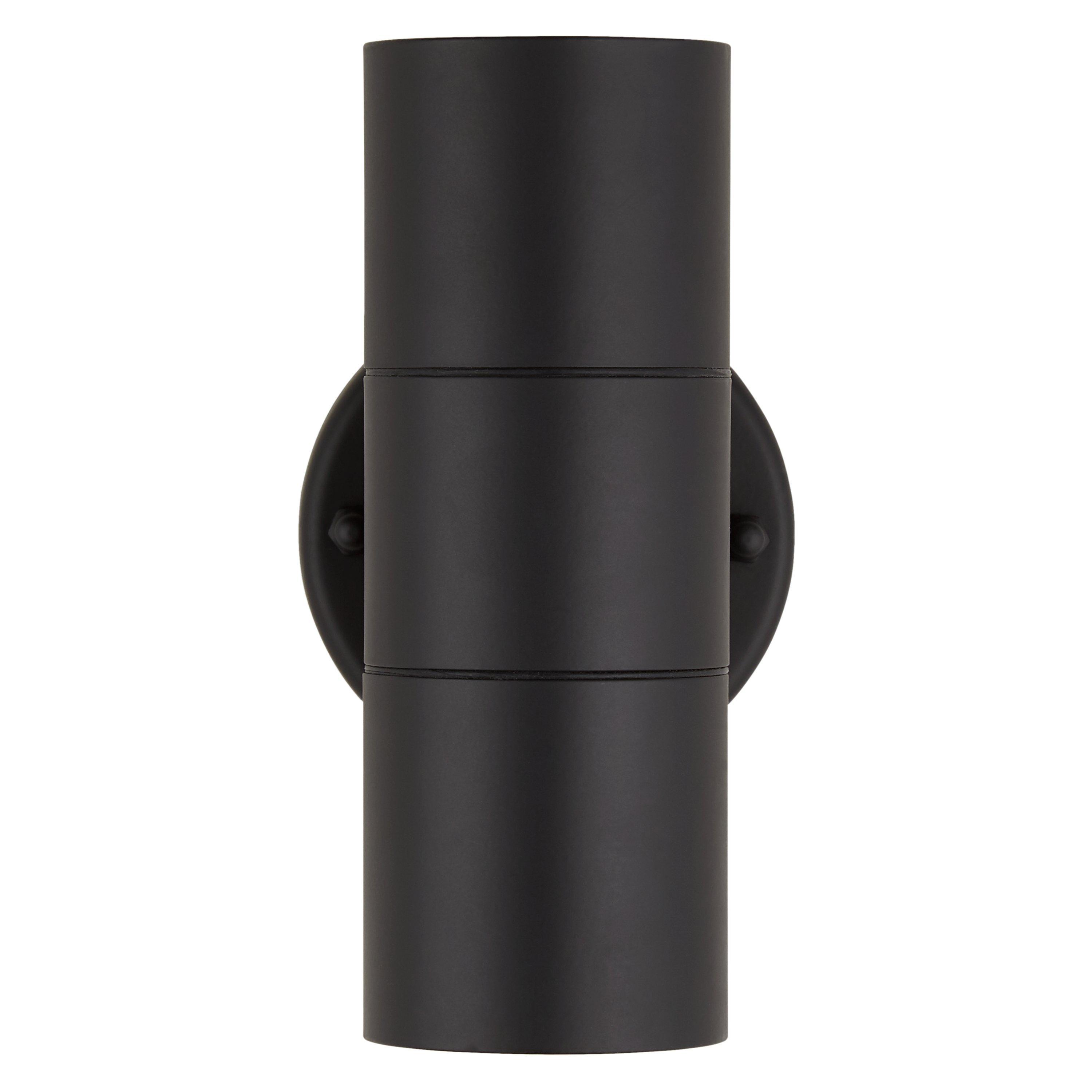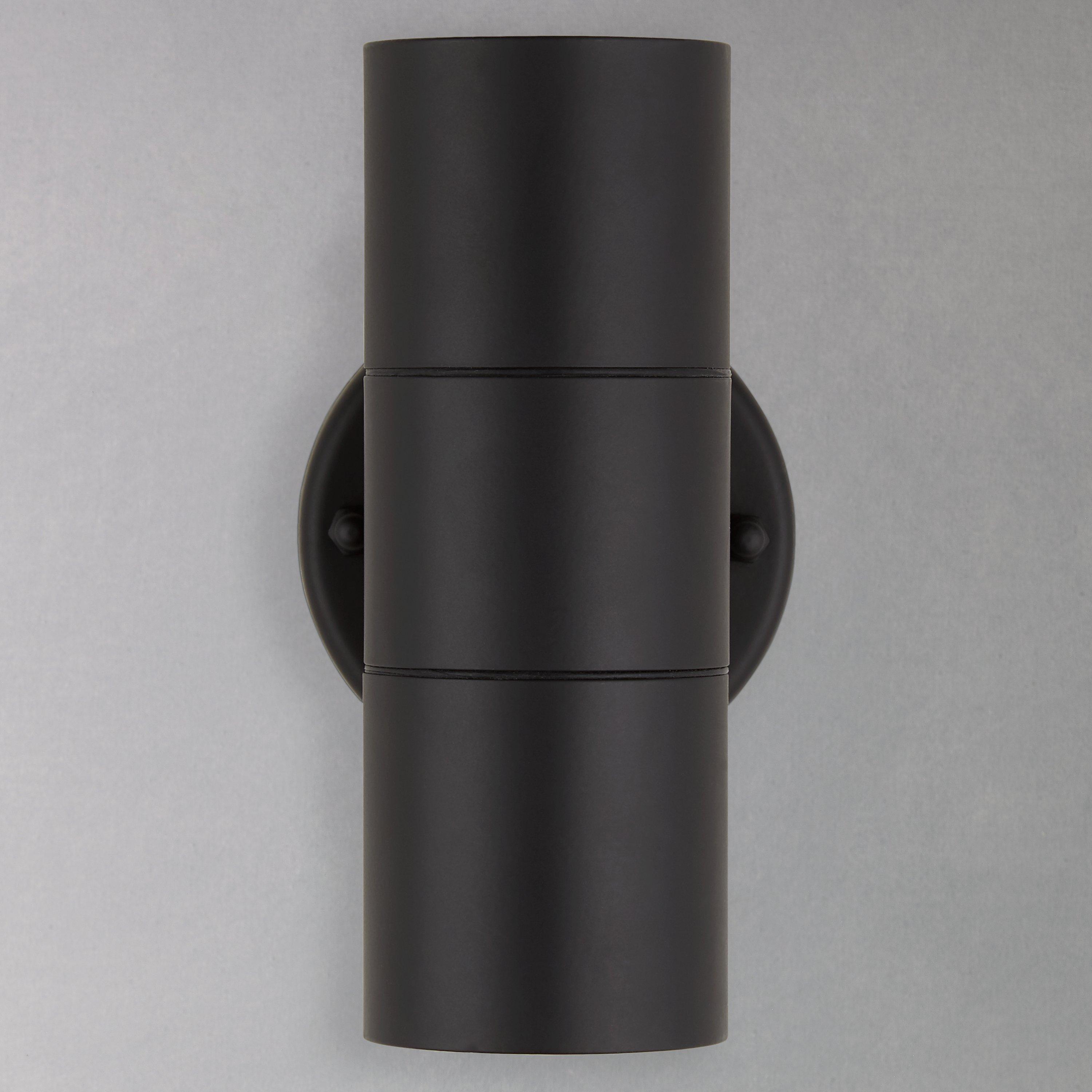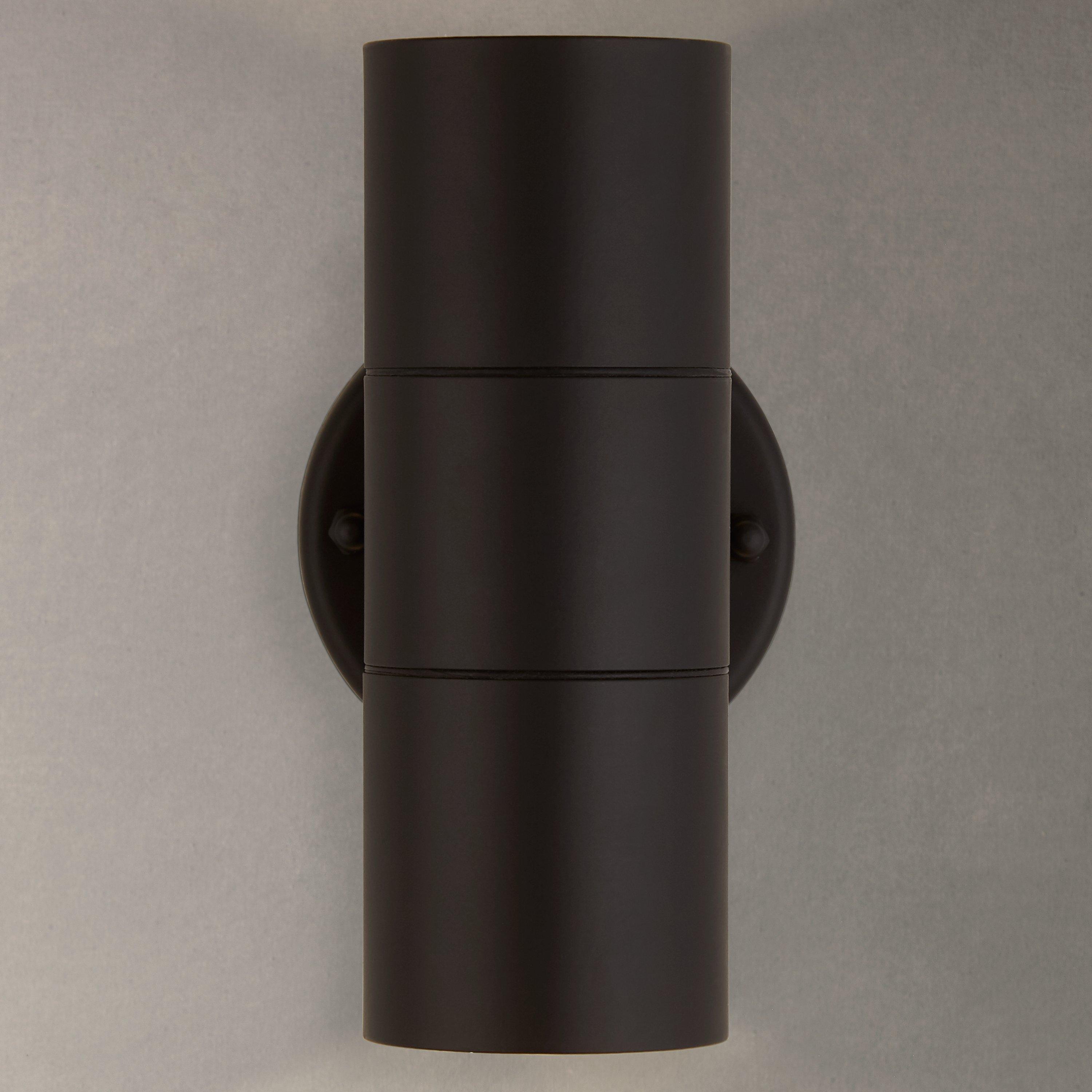 A sleek, metal outdoor wall light that washes both up and down. It comes complete with long-lasting, replaceable LED bulbs.