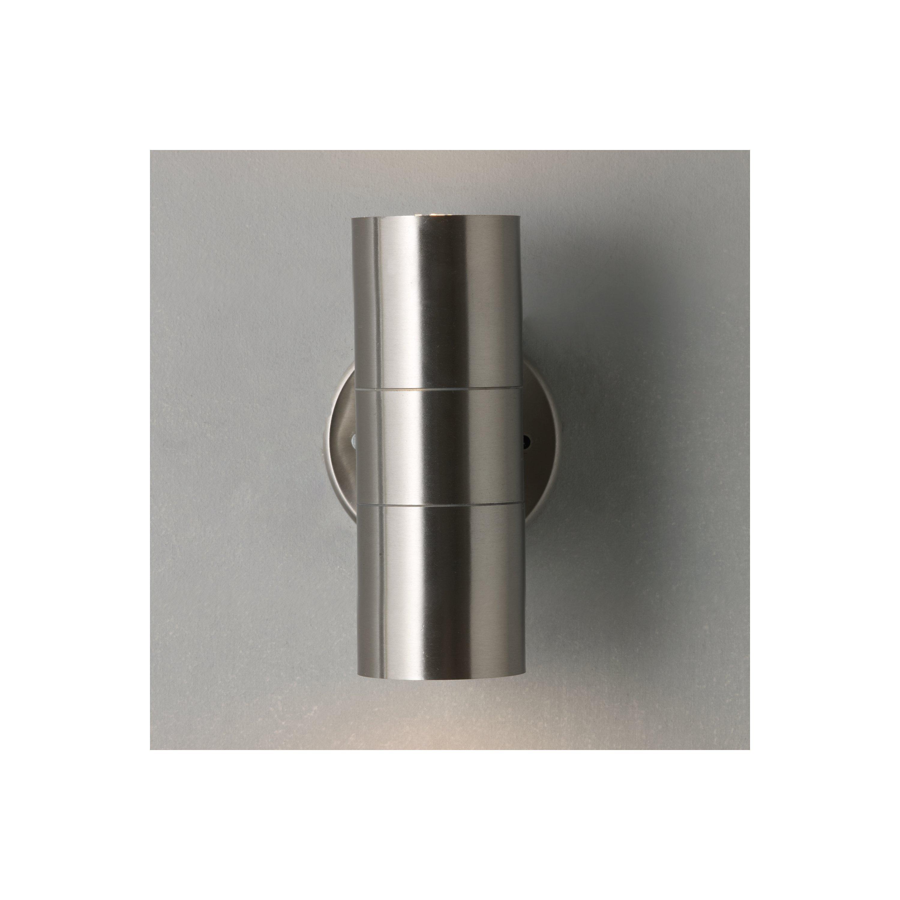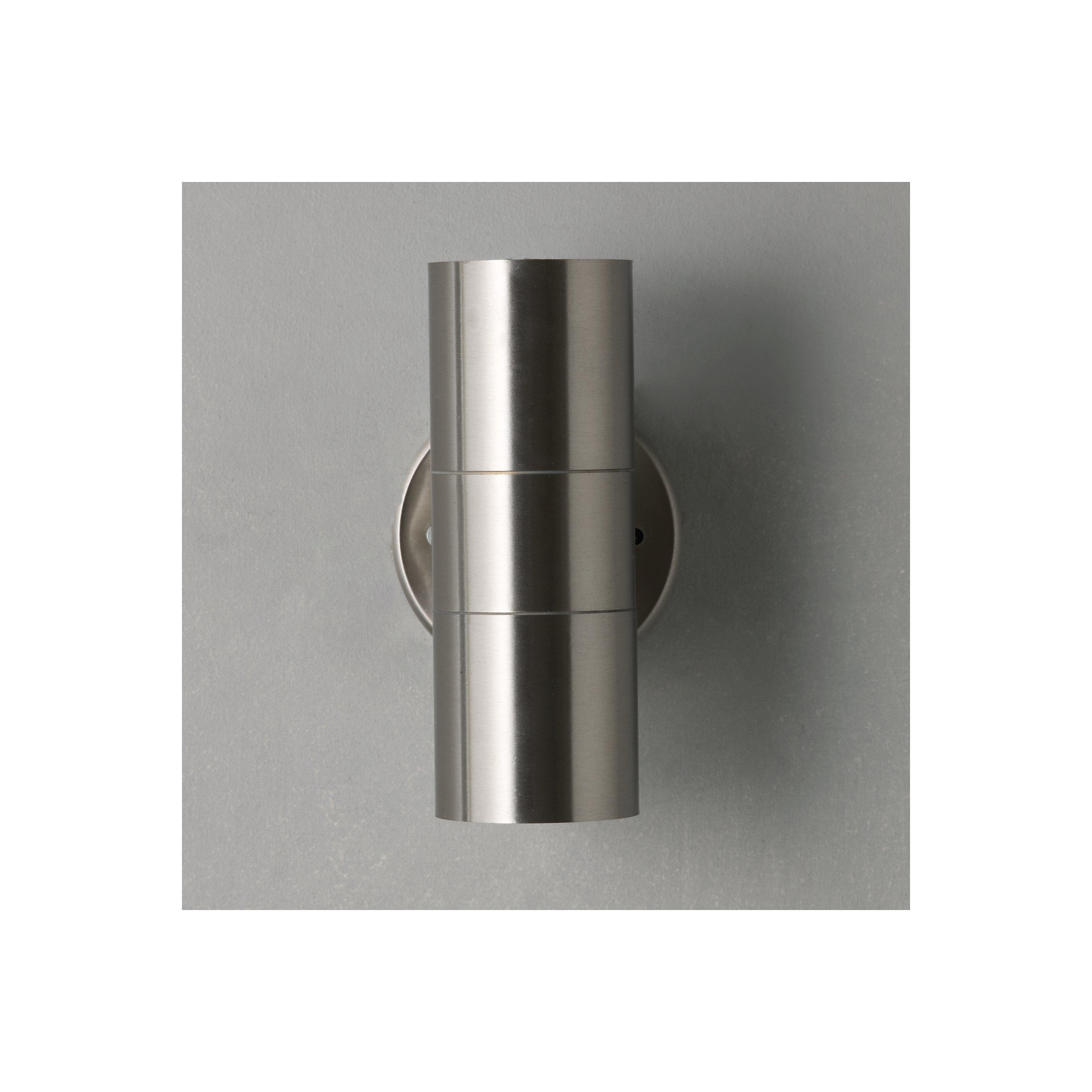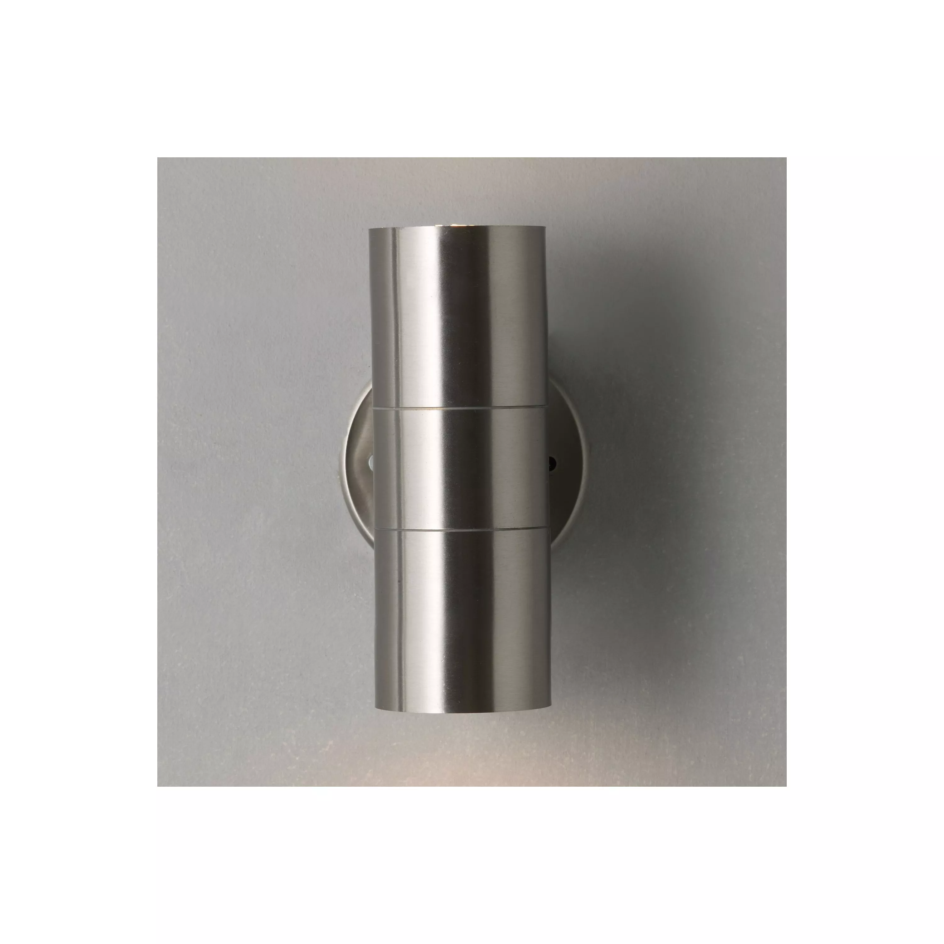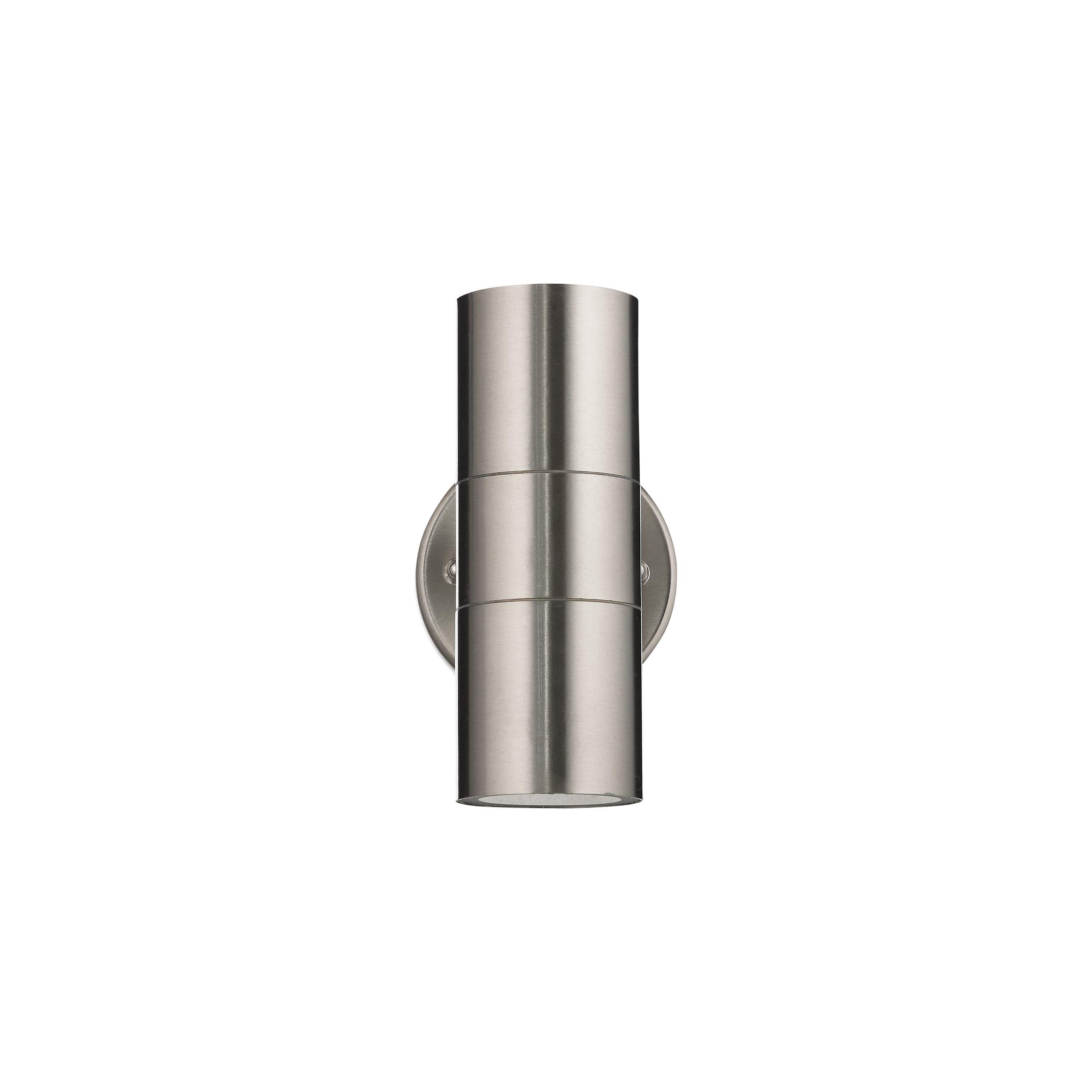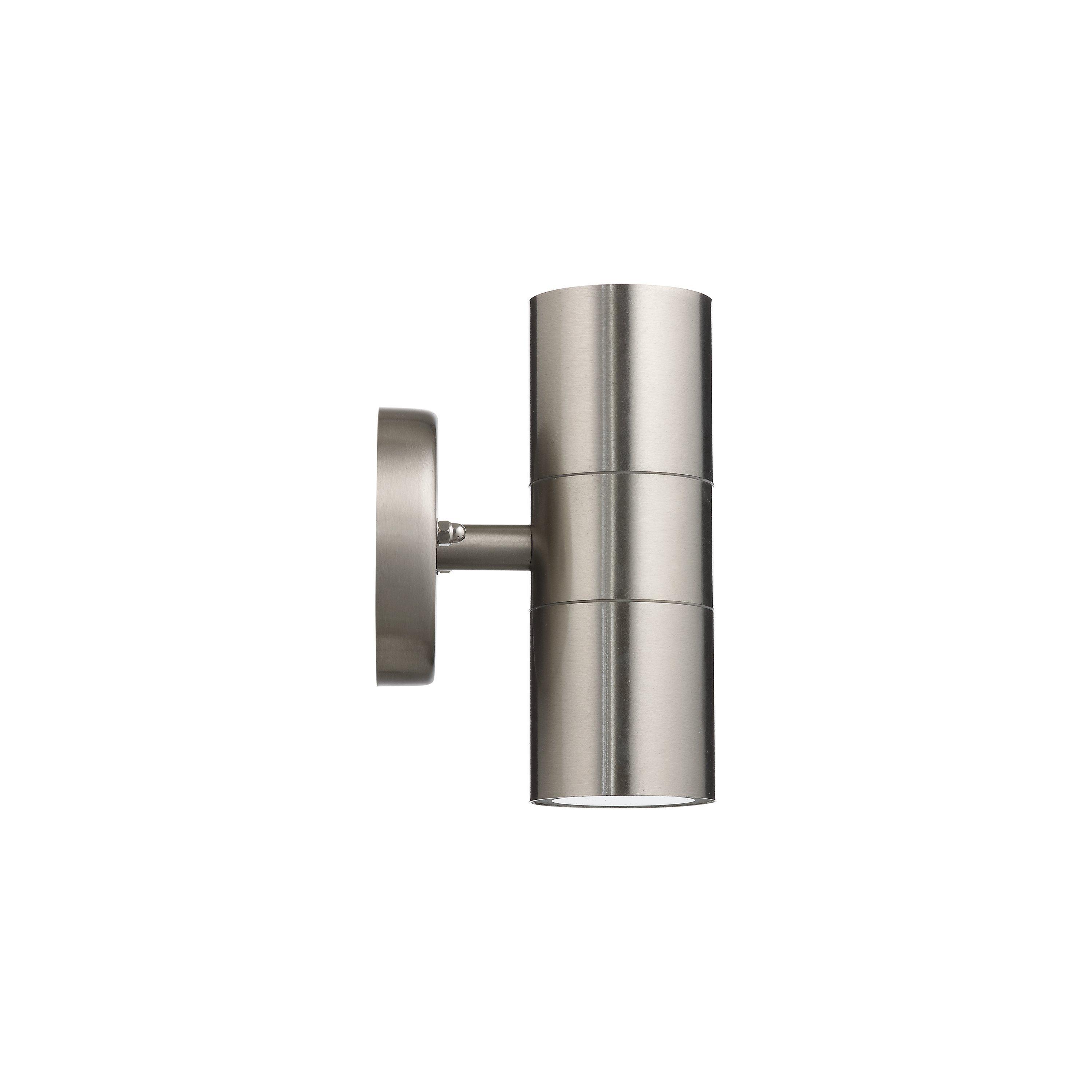 A sleek, metal outdoor wall light that washes both up and down. It comes complete with long-lasting, replaceable LED bulbs.