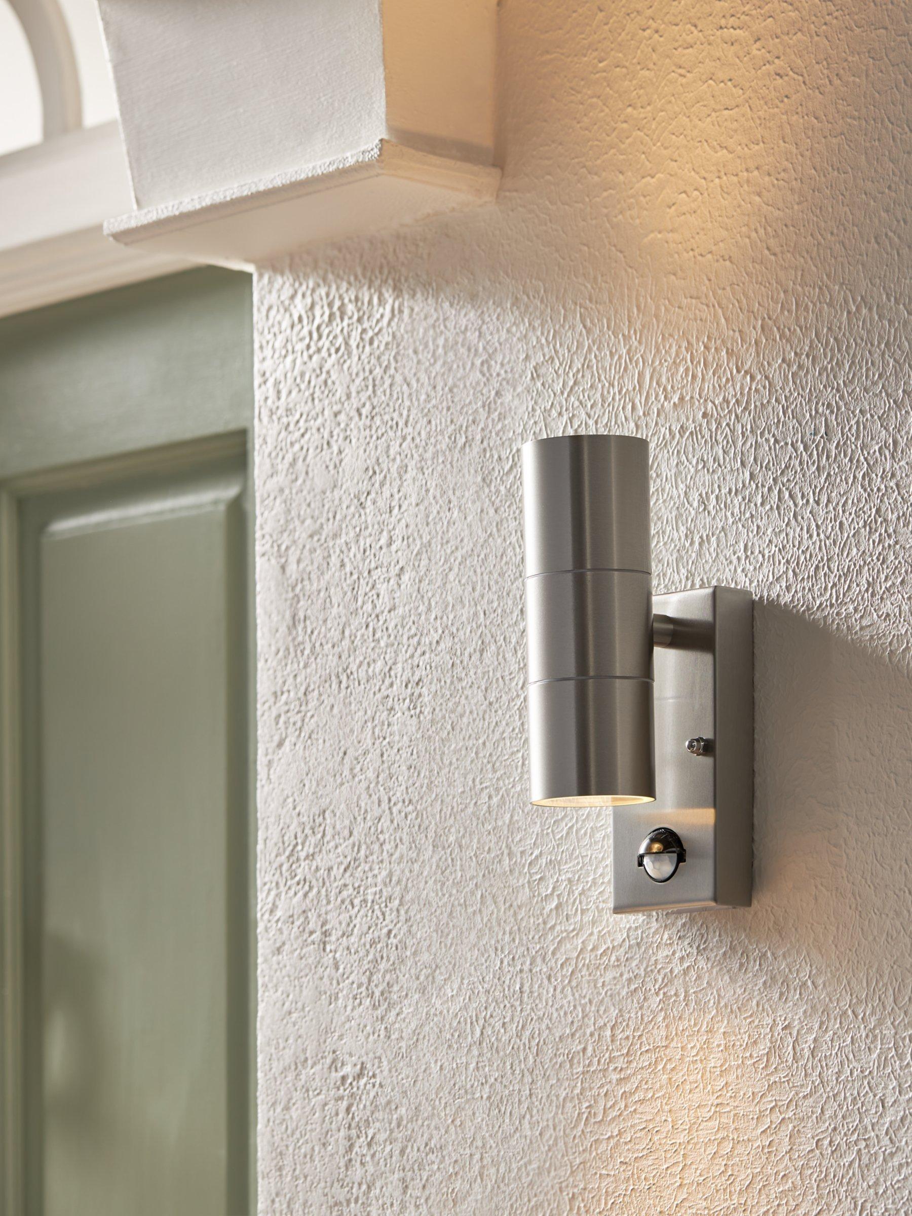 A sleek, metal outdoor PIR wall light that washes both up and down. It comes complete with long-lasting, replaceable LED bulbs.