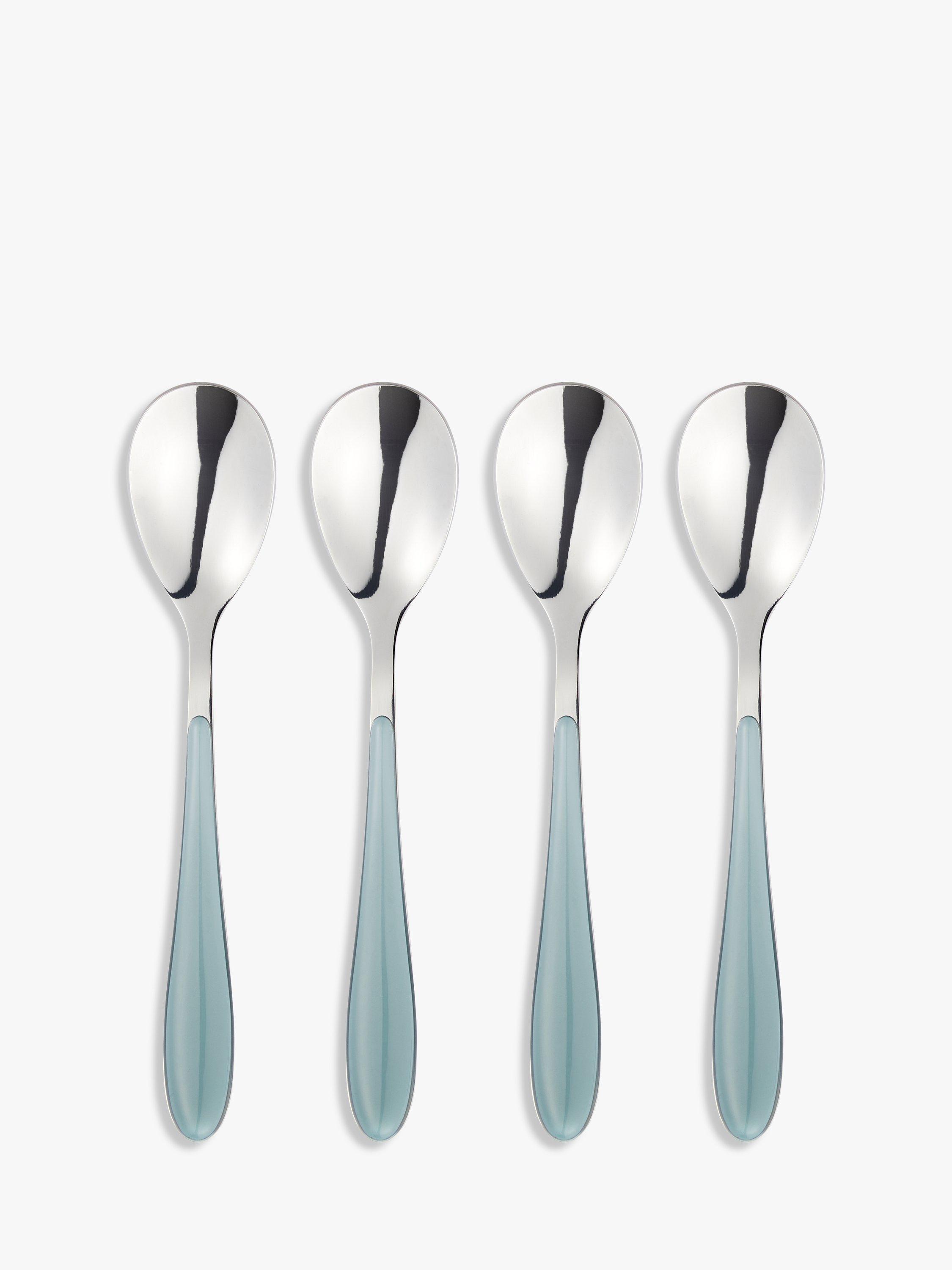Four dessert spoons from our Studio cutlery range. Made from durable stainless steel with colourful ergonomic handles. Dishwasher-safe for easy cleaning.