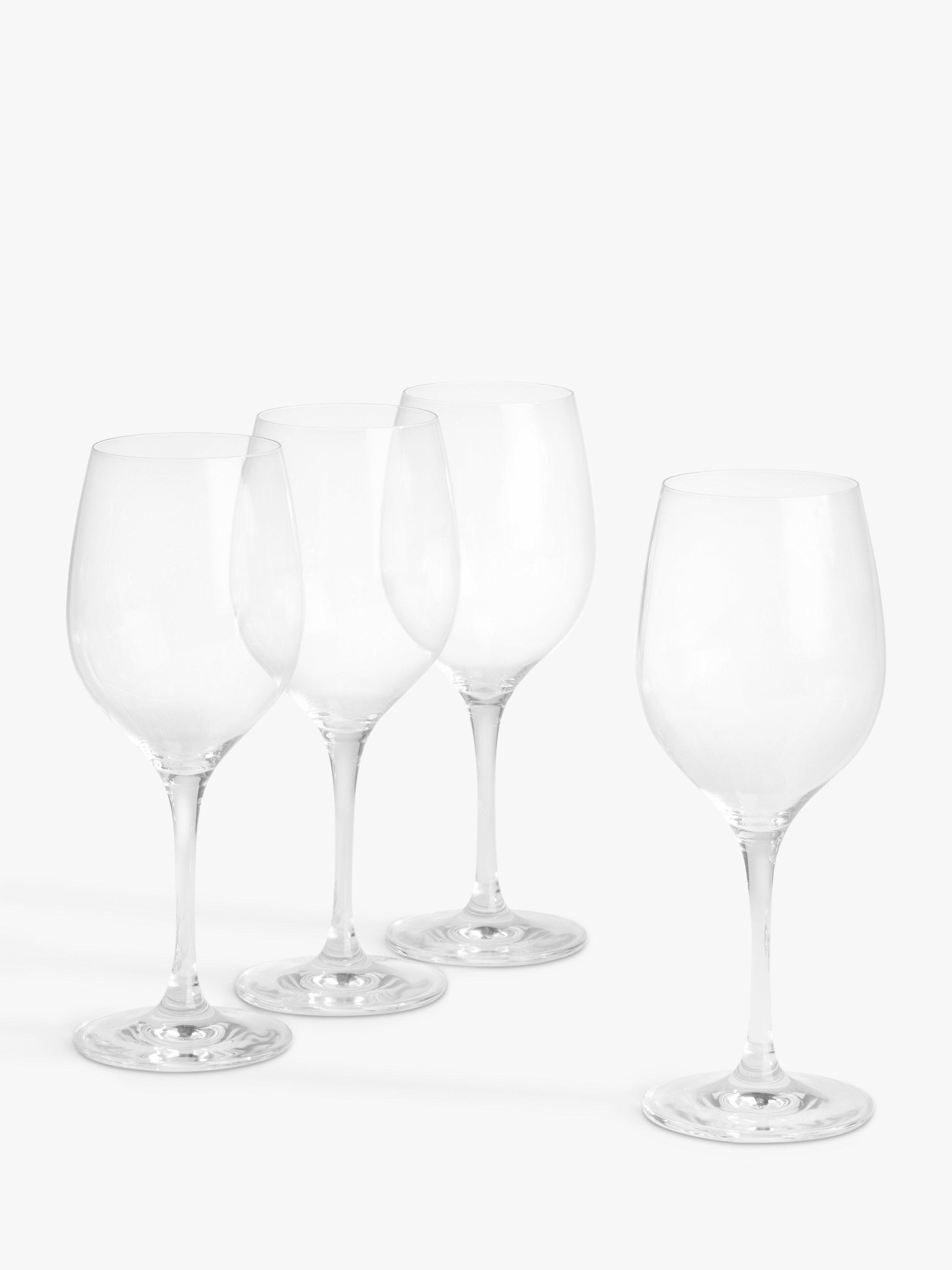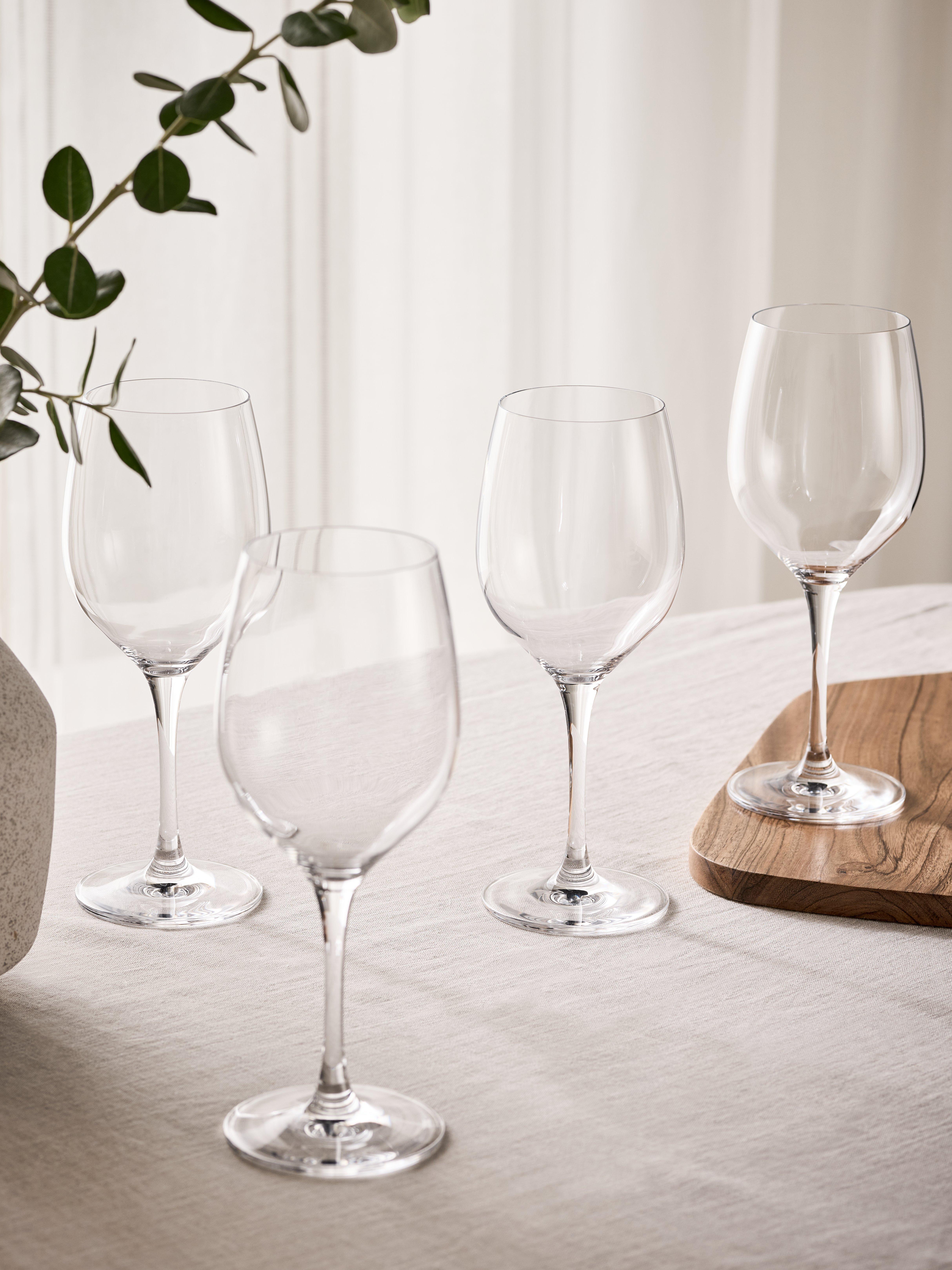 Four Studio wine glasses with long, elegant stems. The generous bowl allows red wines to breathe and open up their aroma and flavour. Made of crystal glass for clarity, they're dishwasher safe for easy cleaning.