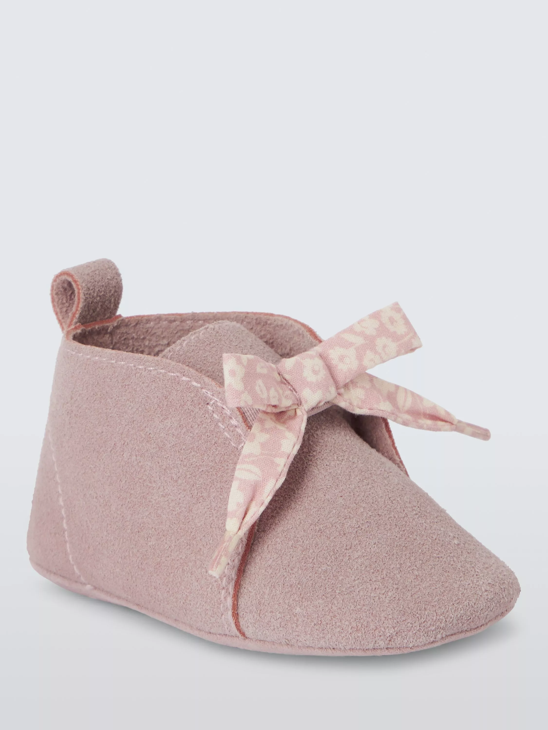 These beautiful pram shoes will finish off any outfit. Crafted in premium soft suede for softness and comfort. Designed with an elastic lace for ease of fit and a pretty floral bow detail.