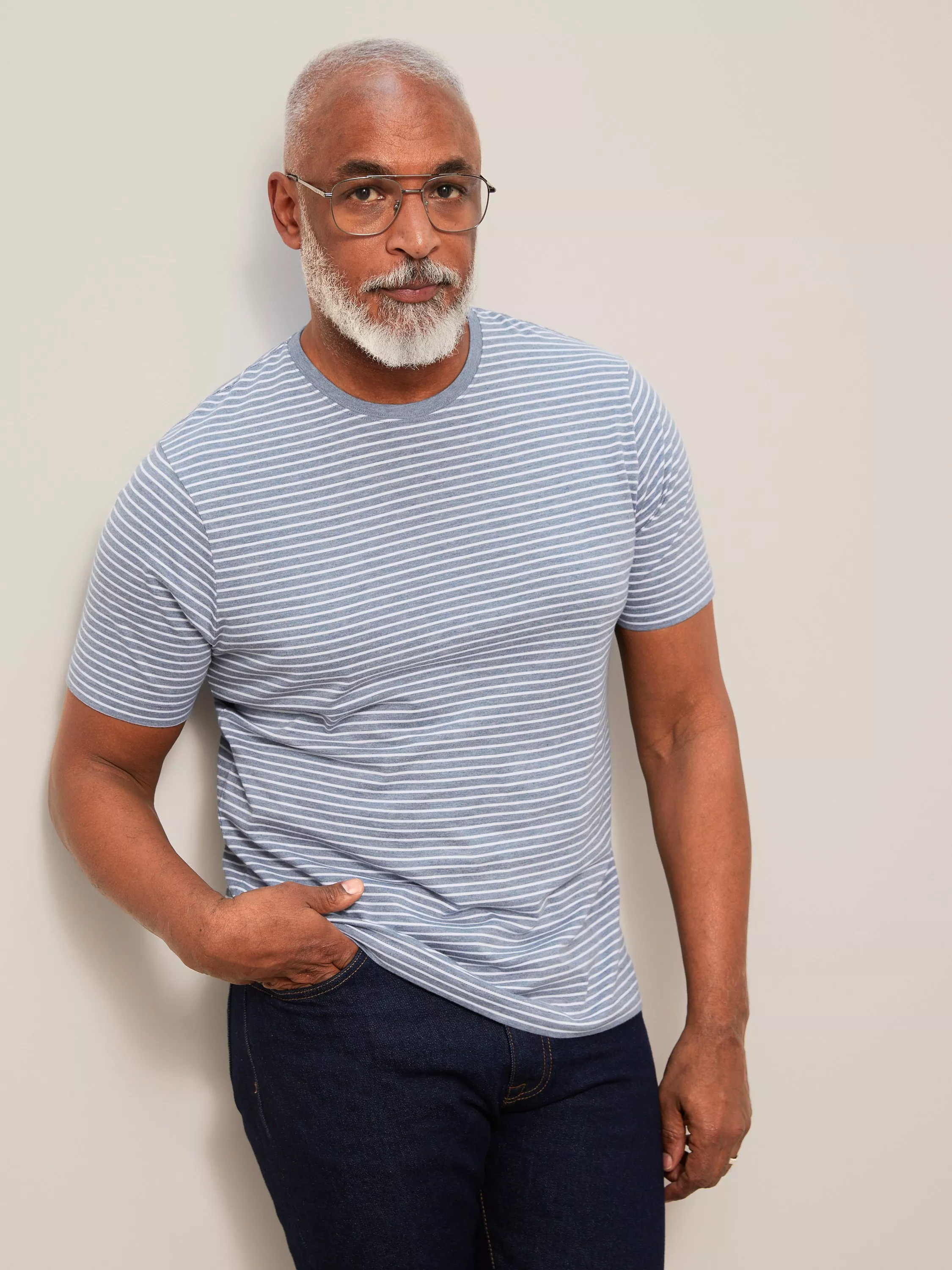 Decorated in a timeless fine stripe design, this John Lewis & Partners T-shirt is cut to our new and improved regular fit that boasts side seam vents for added movement and a sleek ribbed crew neckline with self fabric back neck tape and a back neck print for comfort.