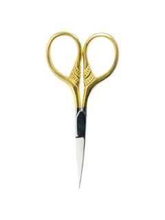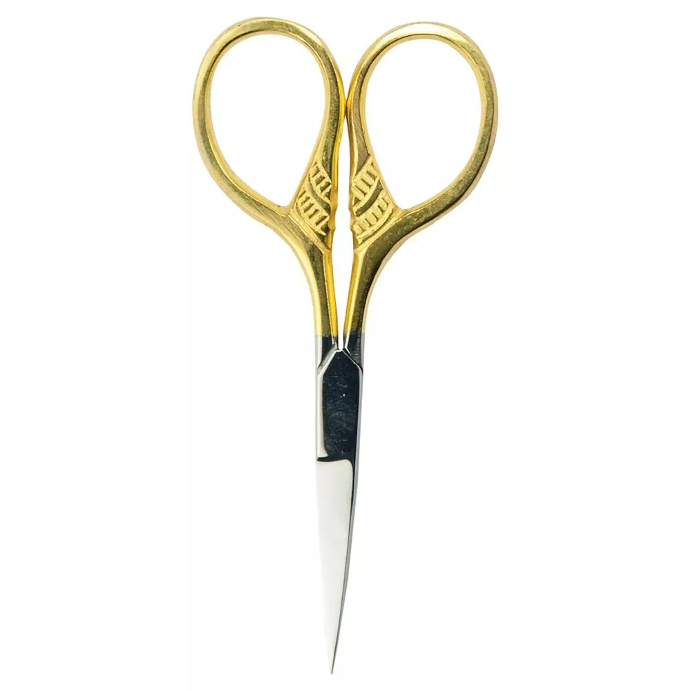 Stainless steel embroidery scissors with a gilt finish and swan's wing design on the handles.