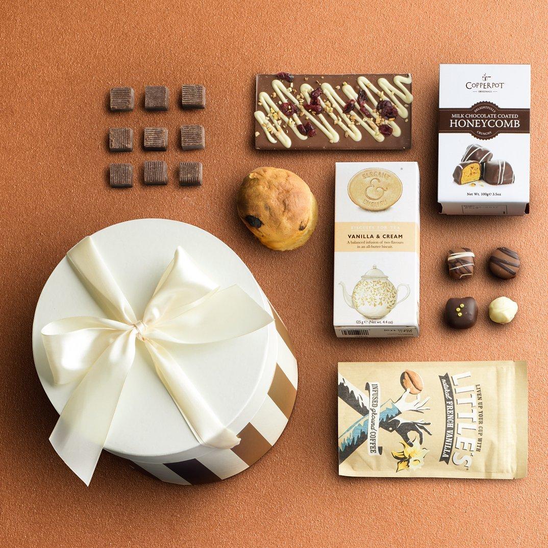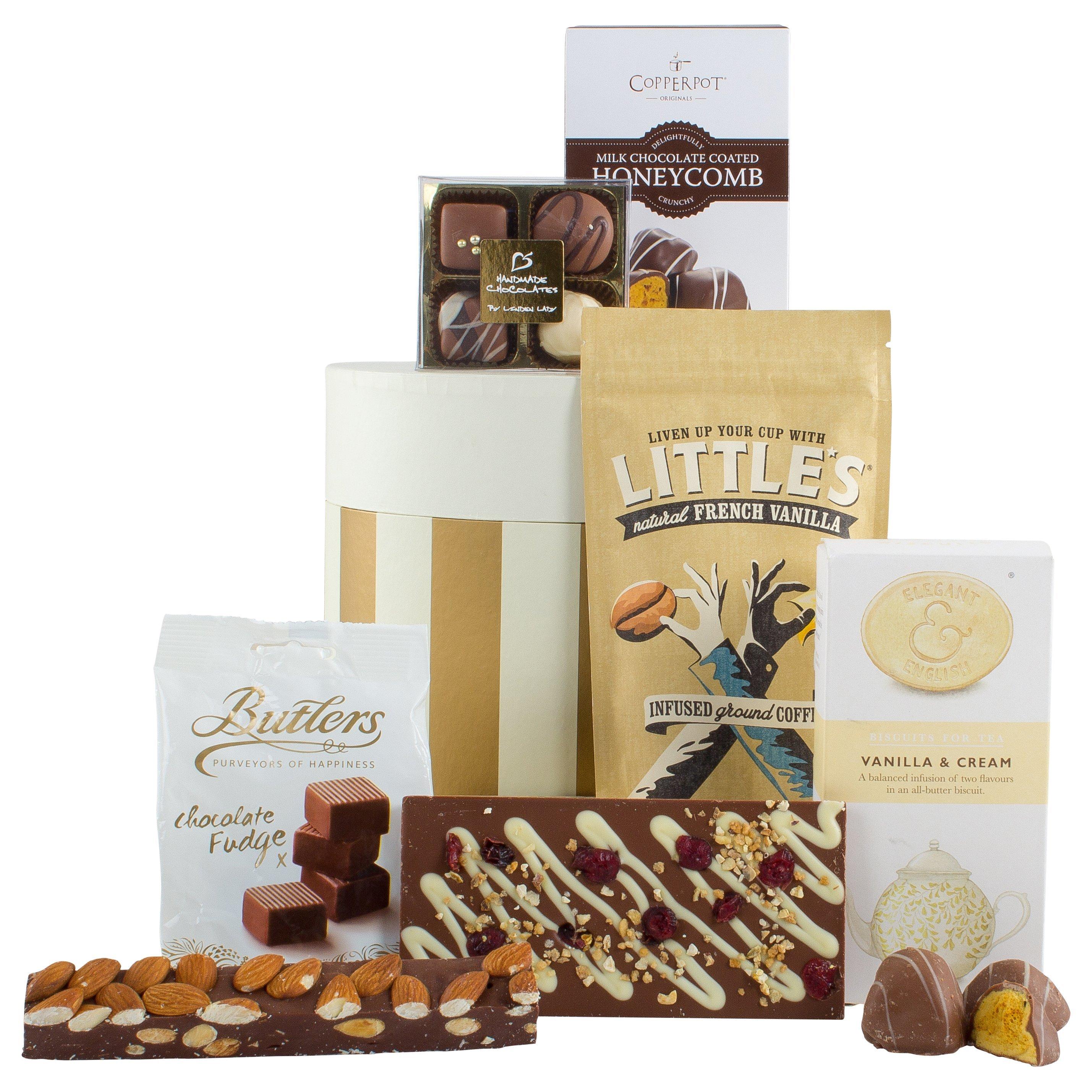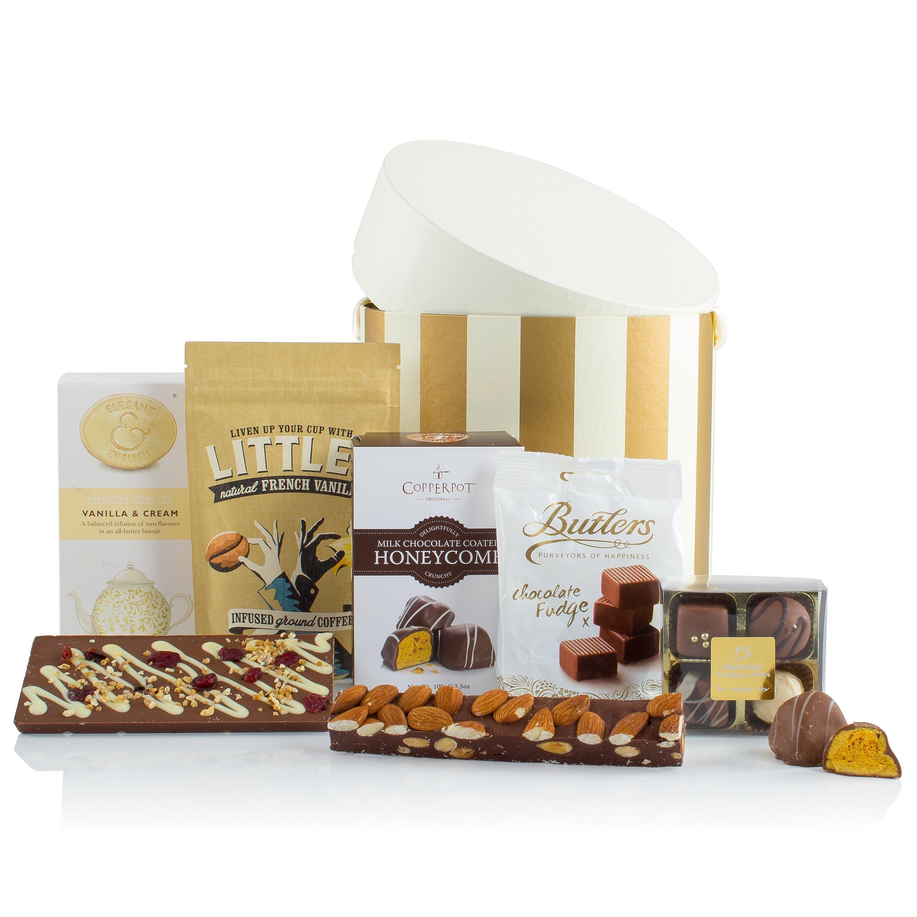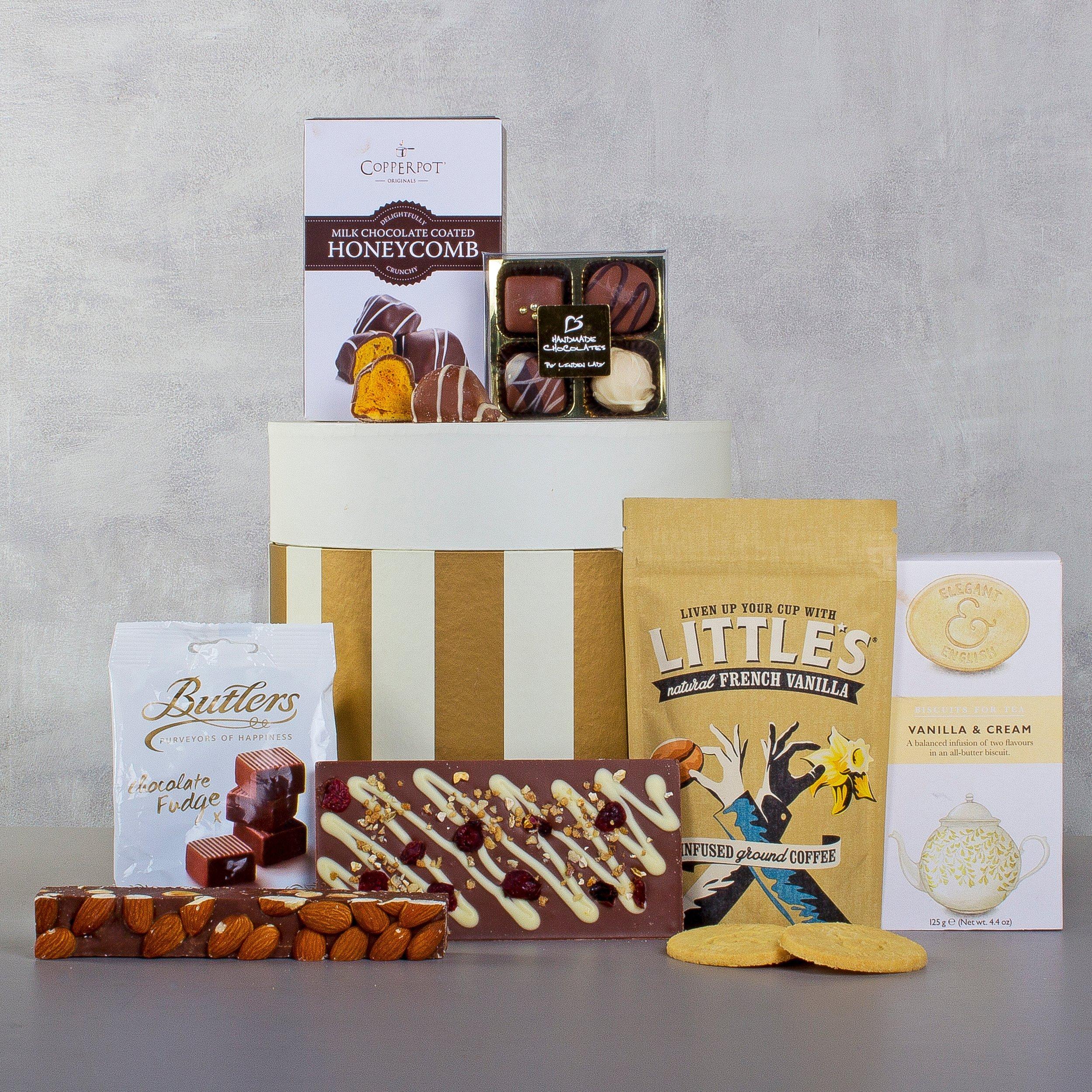 Our 'Sweet Treats' hamper is presented in a gold and cream hat box. It contains an assortment of confectionery which the entire family can indulge in this season.