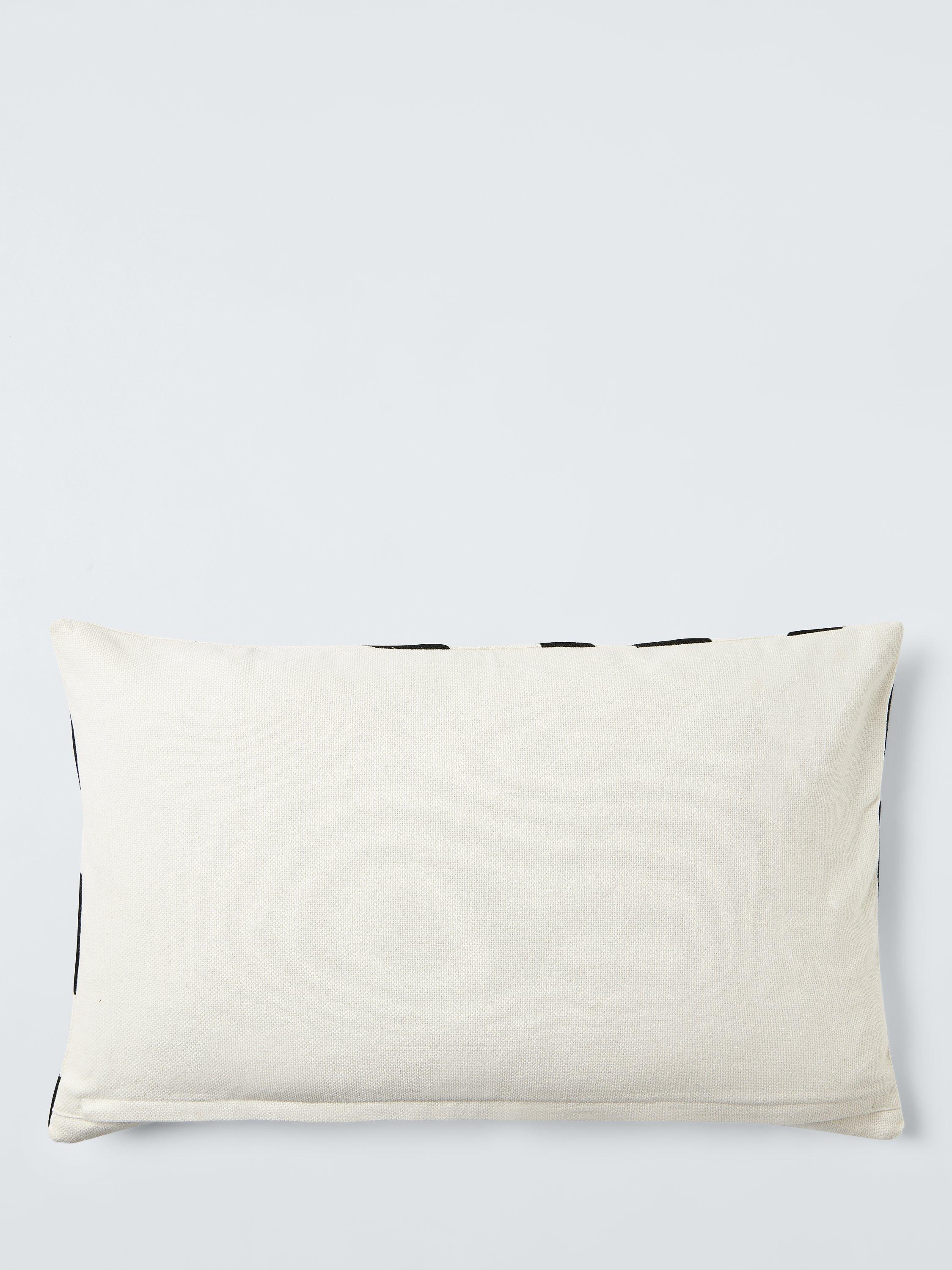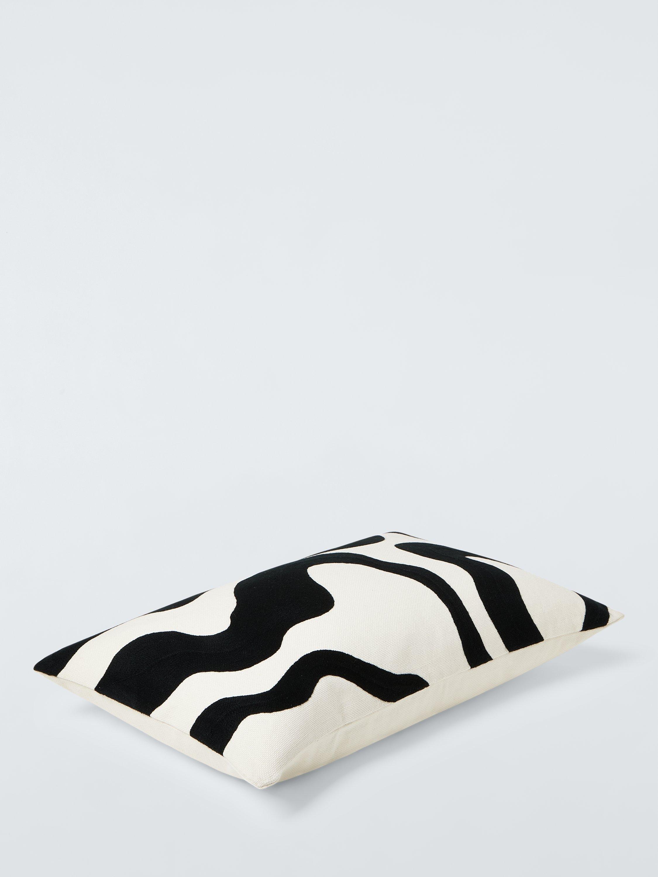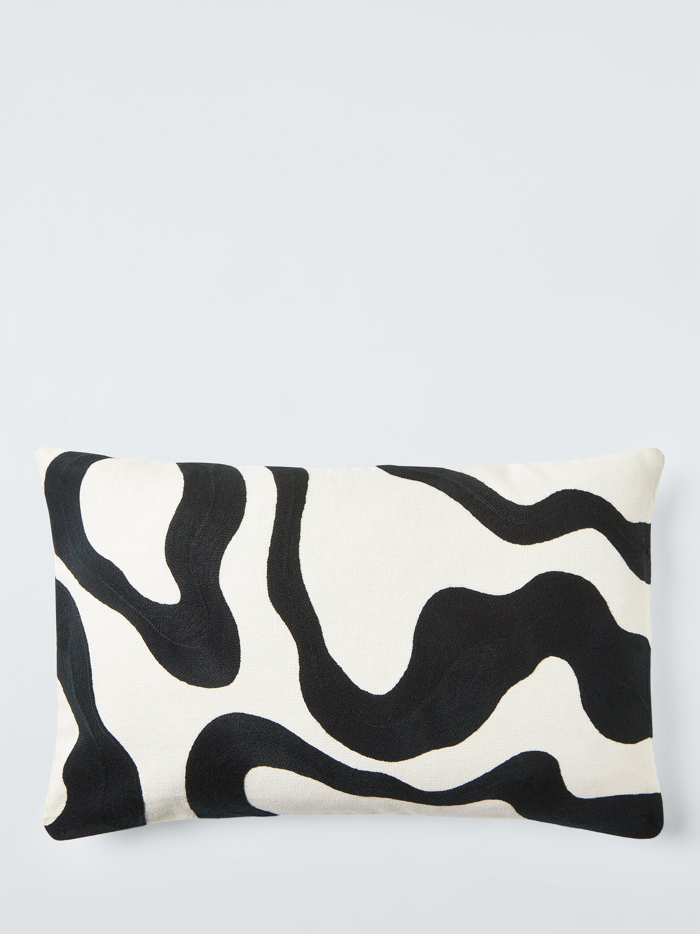 This contemporary cushion has a hand guided, embroidered swirling pattern reminiscent of light on water, or patterns in sand, stitched onto a natural background. The reverse is plain.