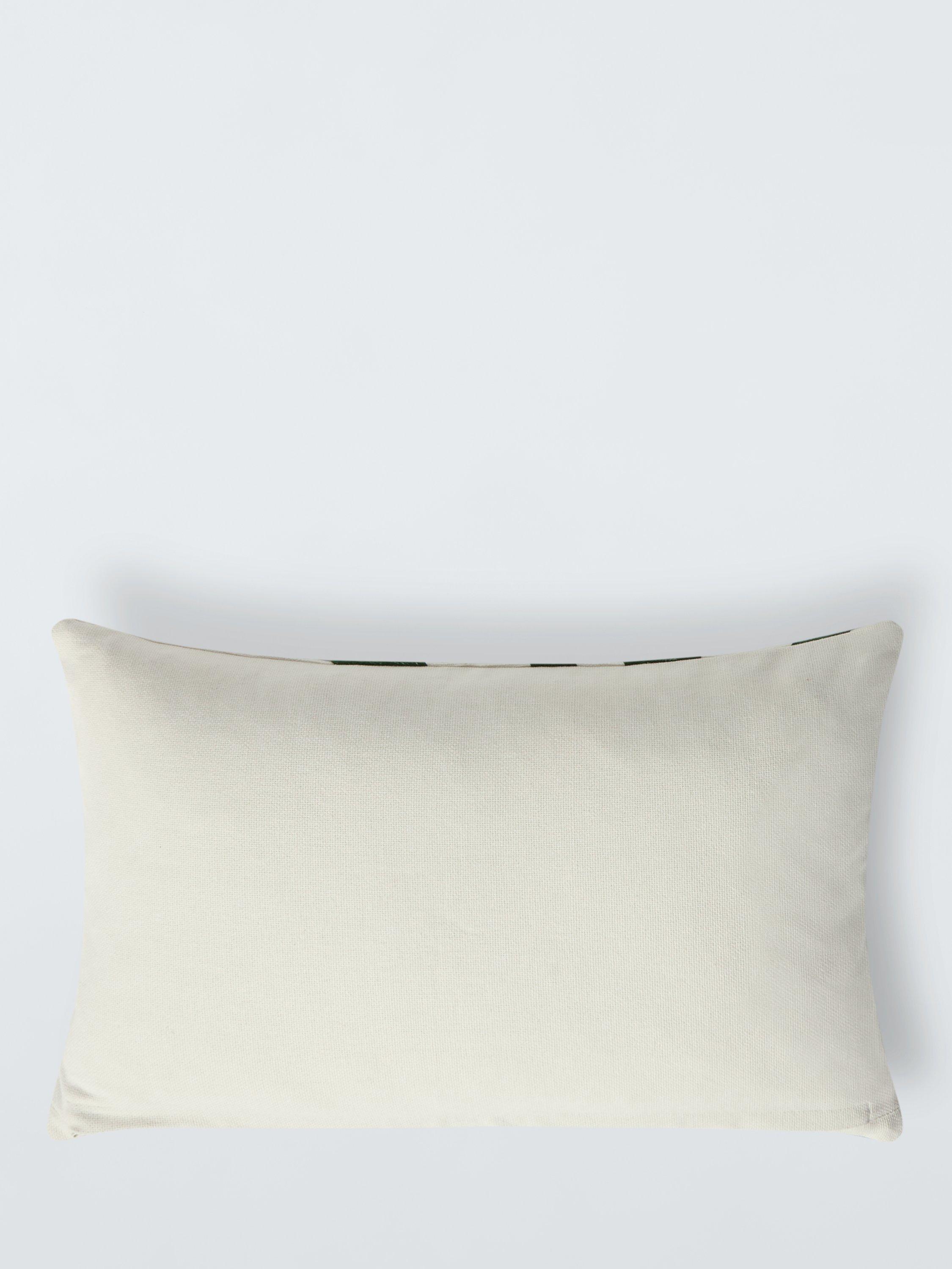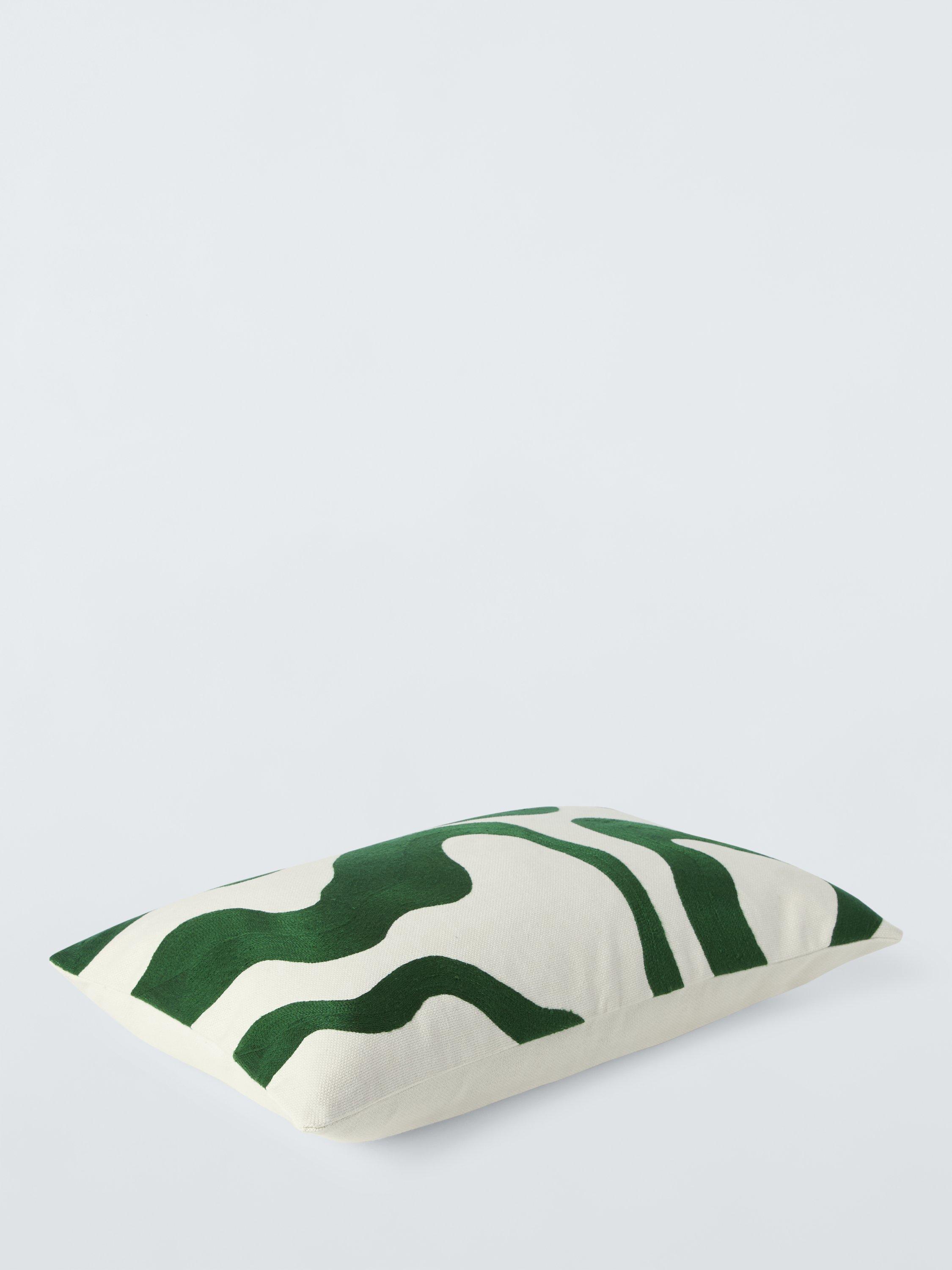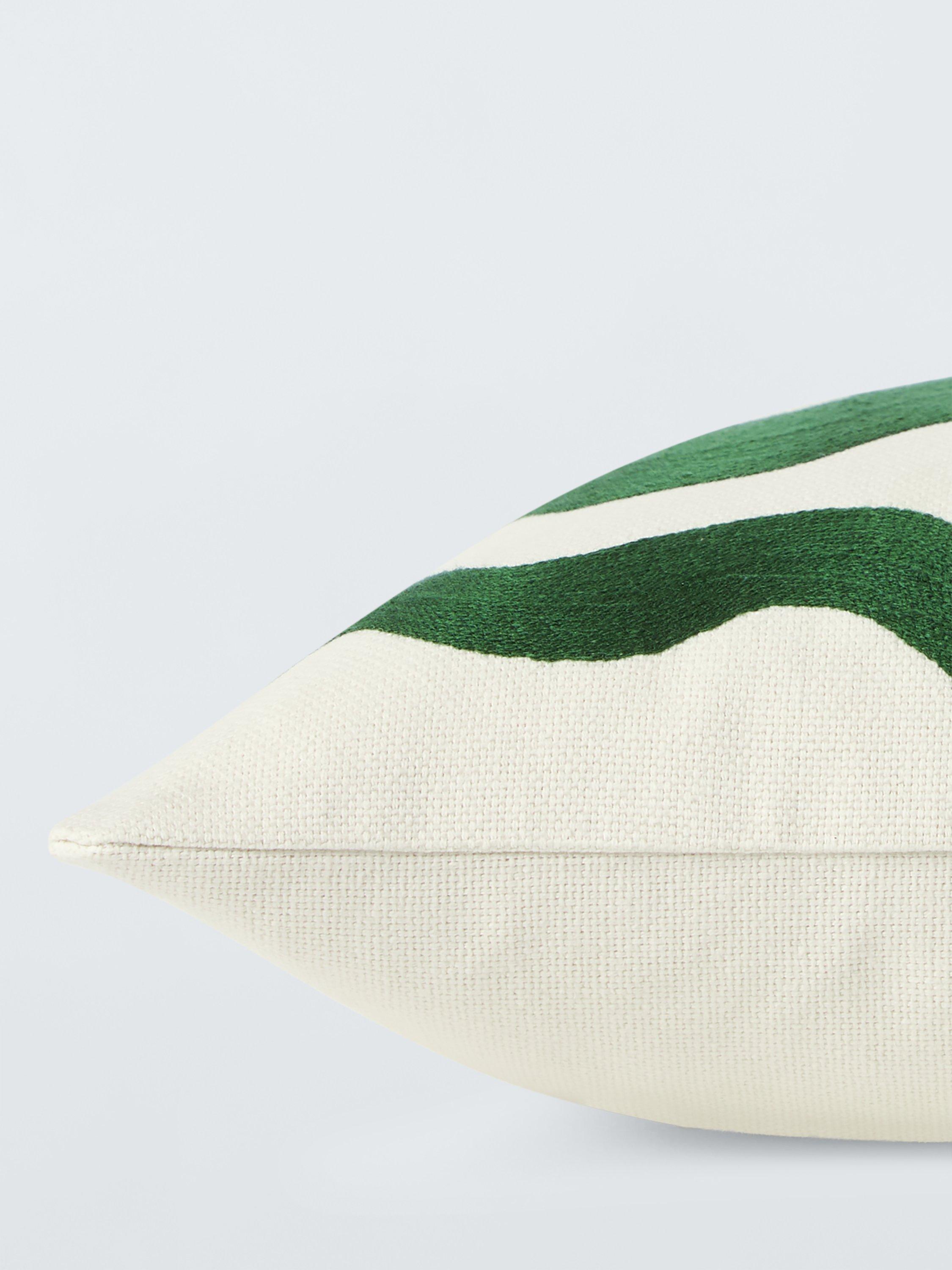 This contemporary cushion has a hand guided, embroidered swirling pattern reminiscent of light on water, or patterns in sand, stitched onto a natural background. The reverse is plain.