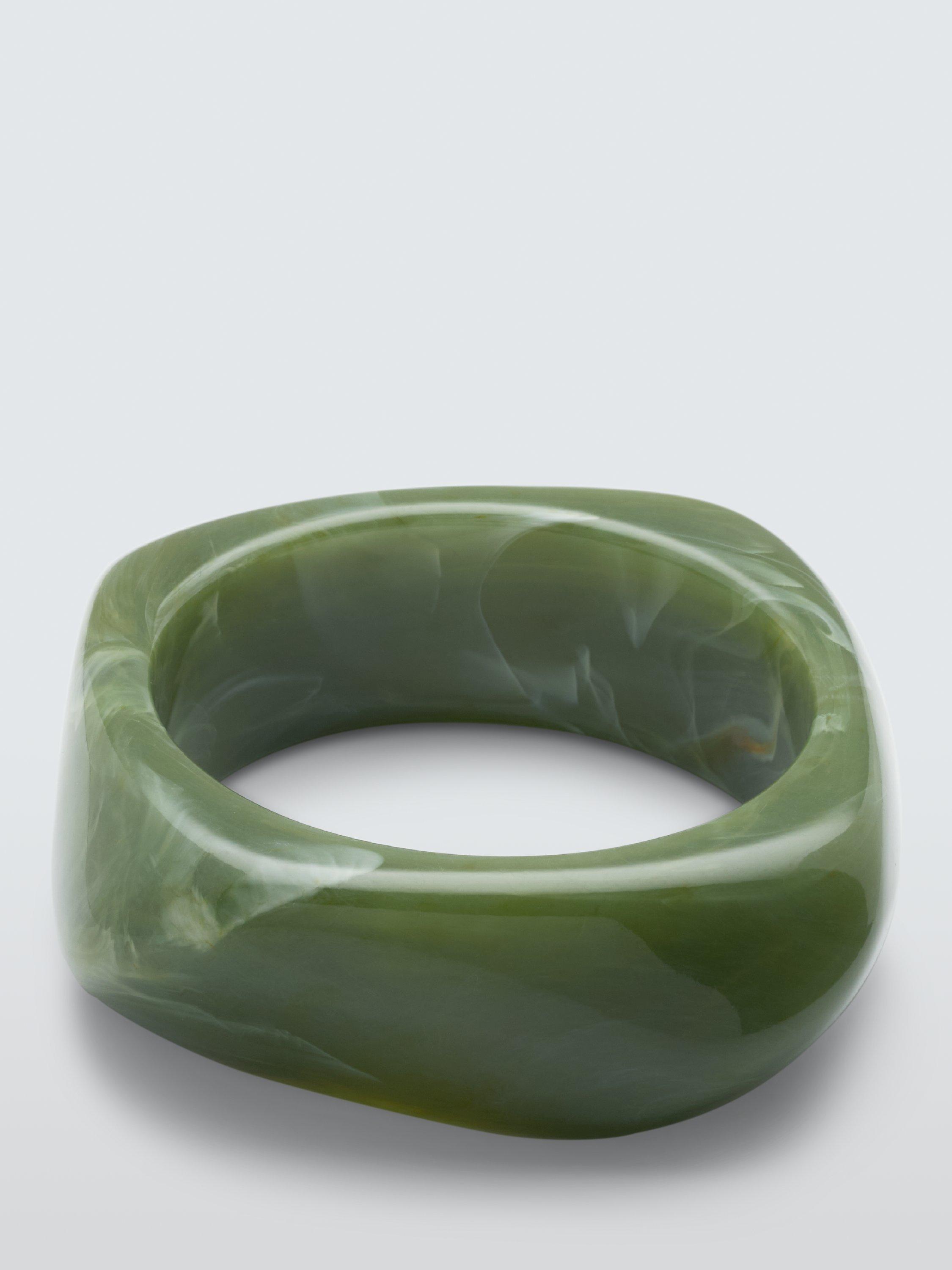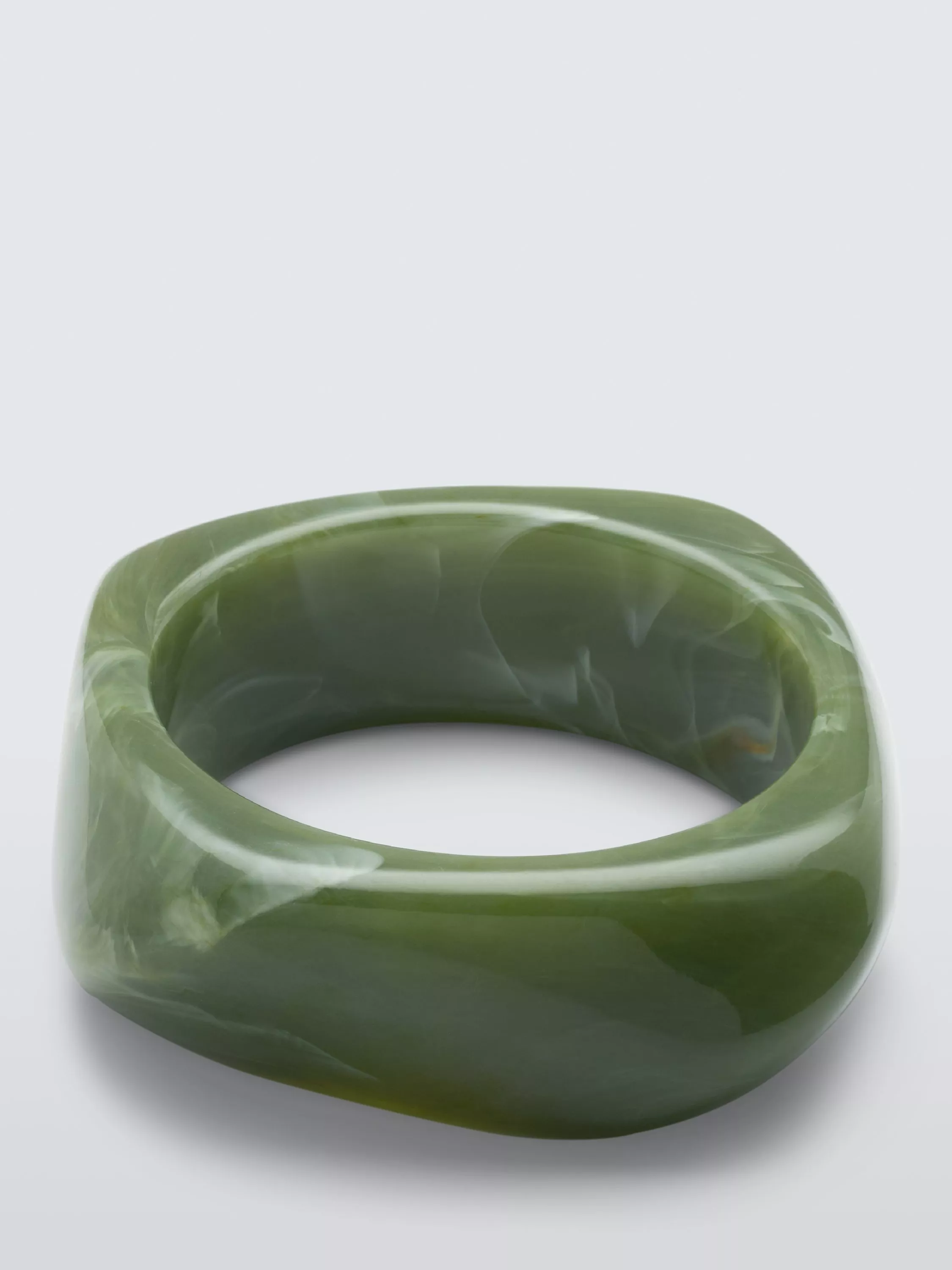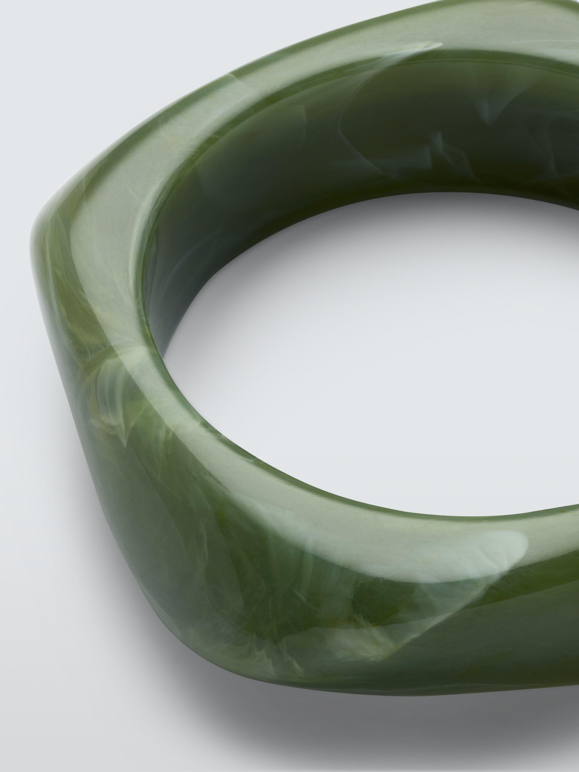 A statement bangle designed with a unique geometric shape and boasting swirl detailing ingrained in the material and completed with a smooth, polished finish.