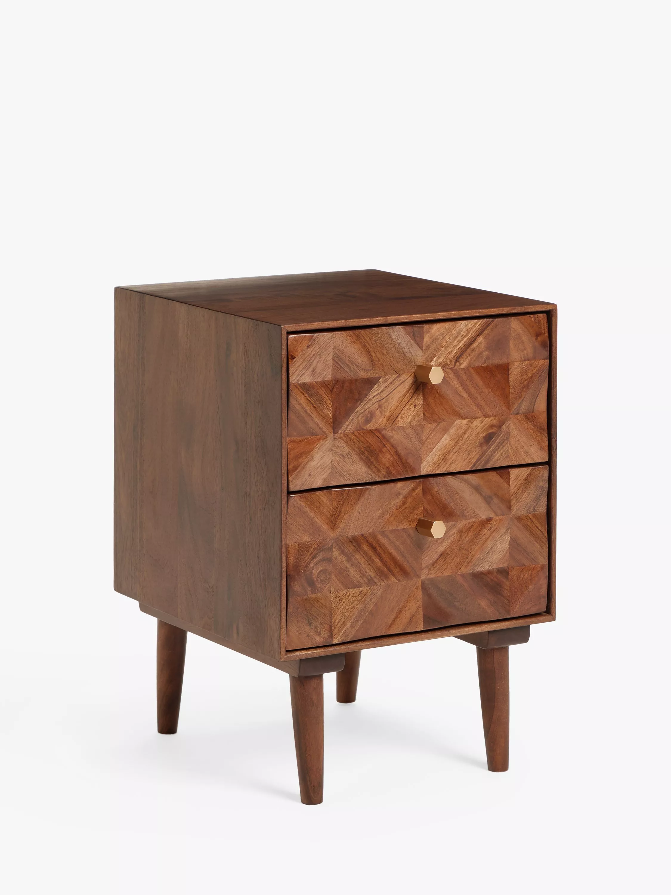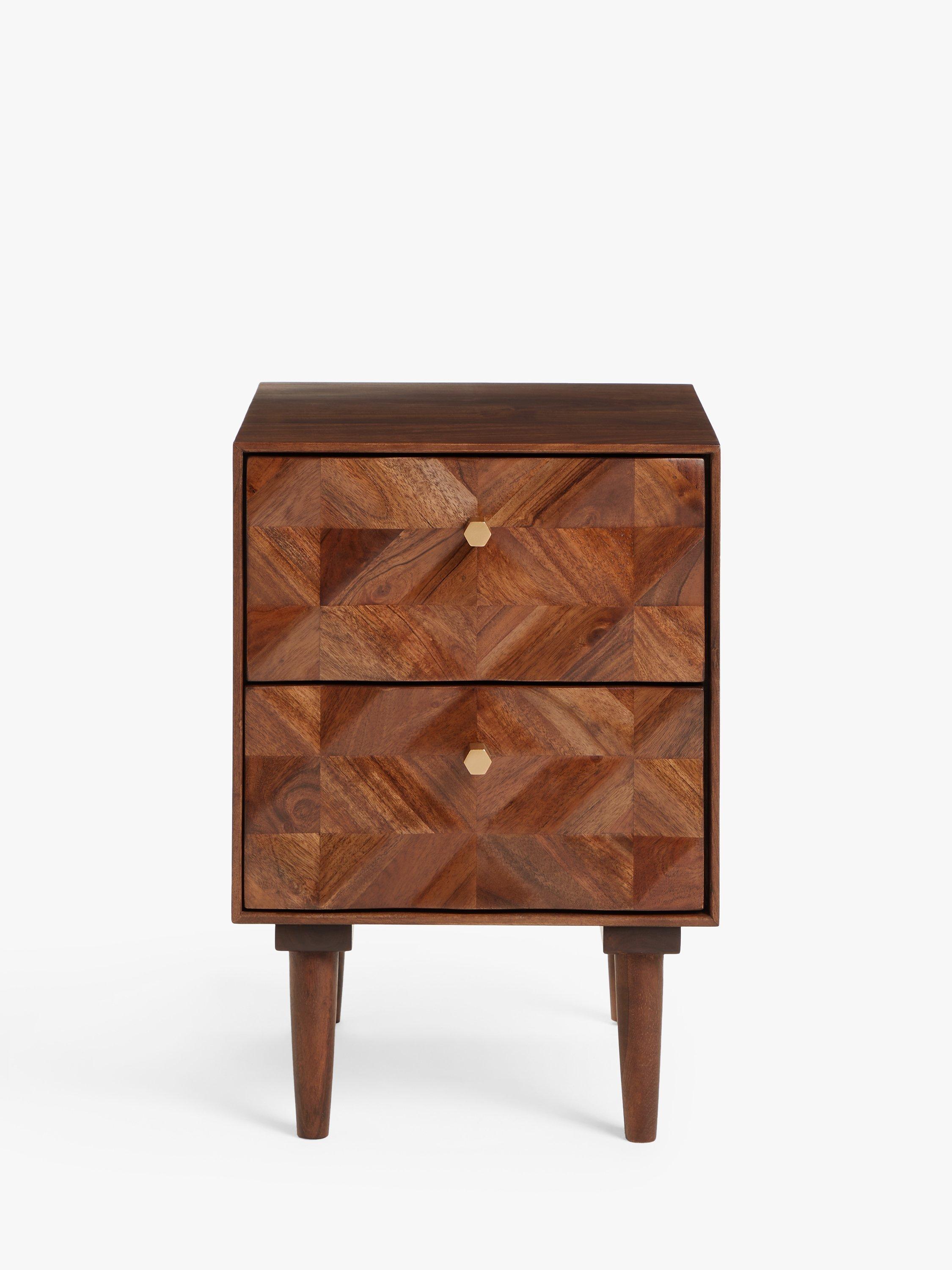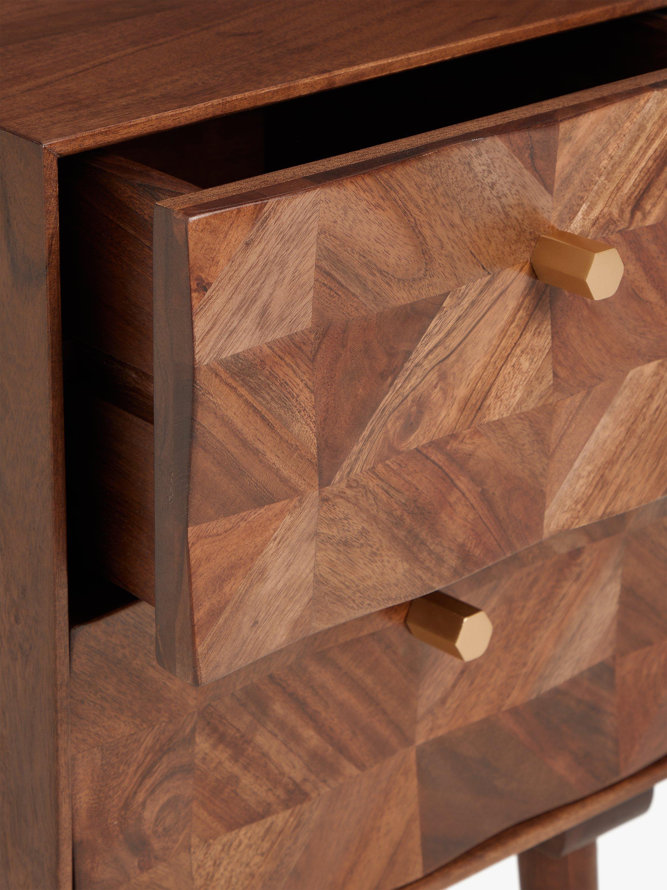 The Franklin bedside table is built from a combination of high-quality timbers including acacia wood. Its two spacious drawers provide convenient storage space. Designed using marquetry techniques to create a distinctive, geometric facade to showcase the variety of its natural wood grains.