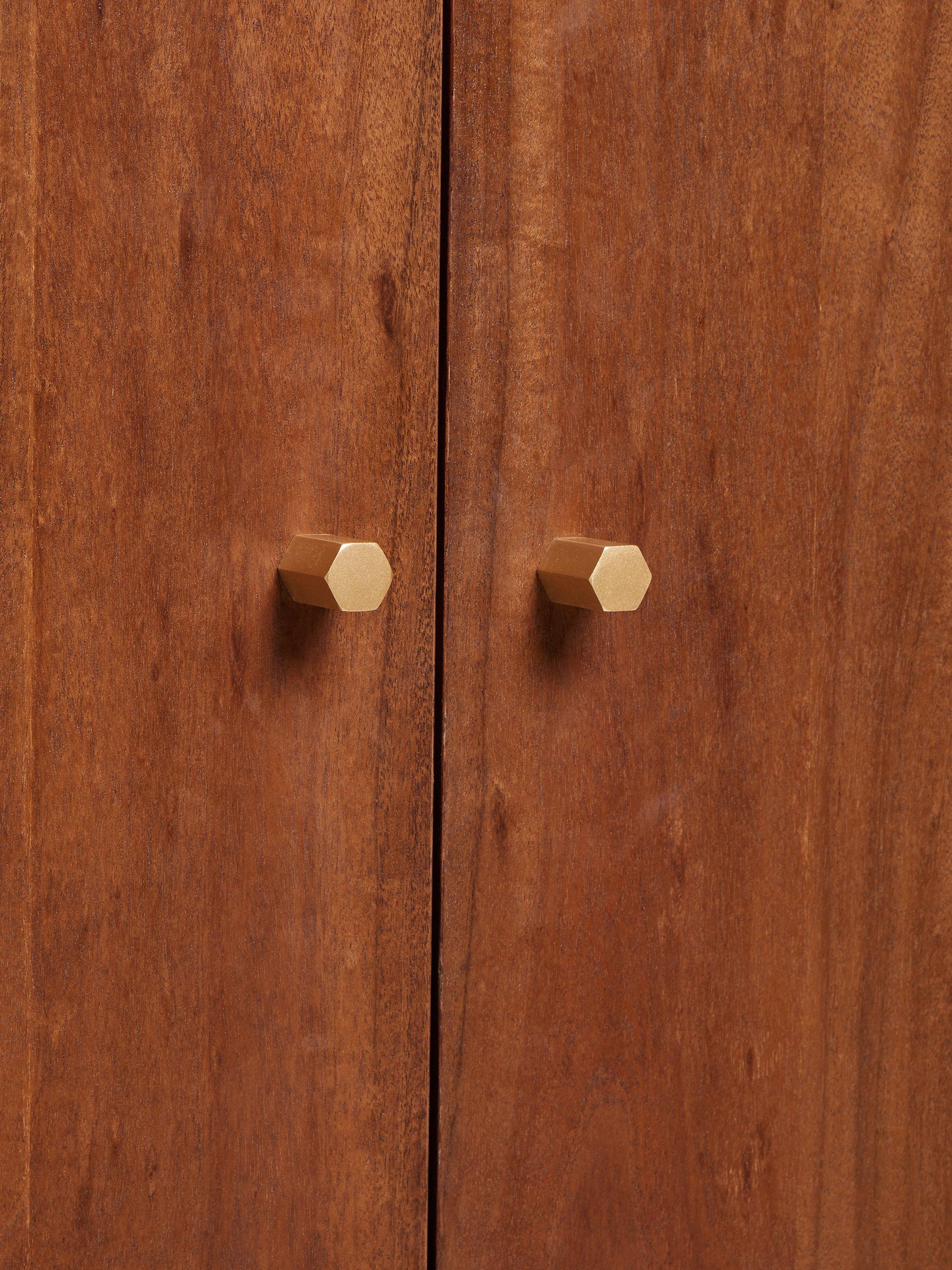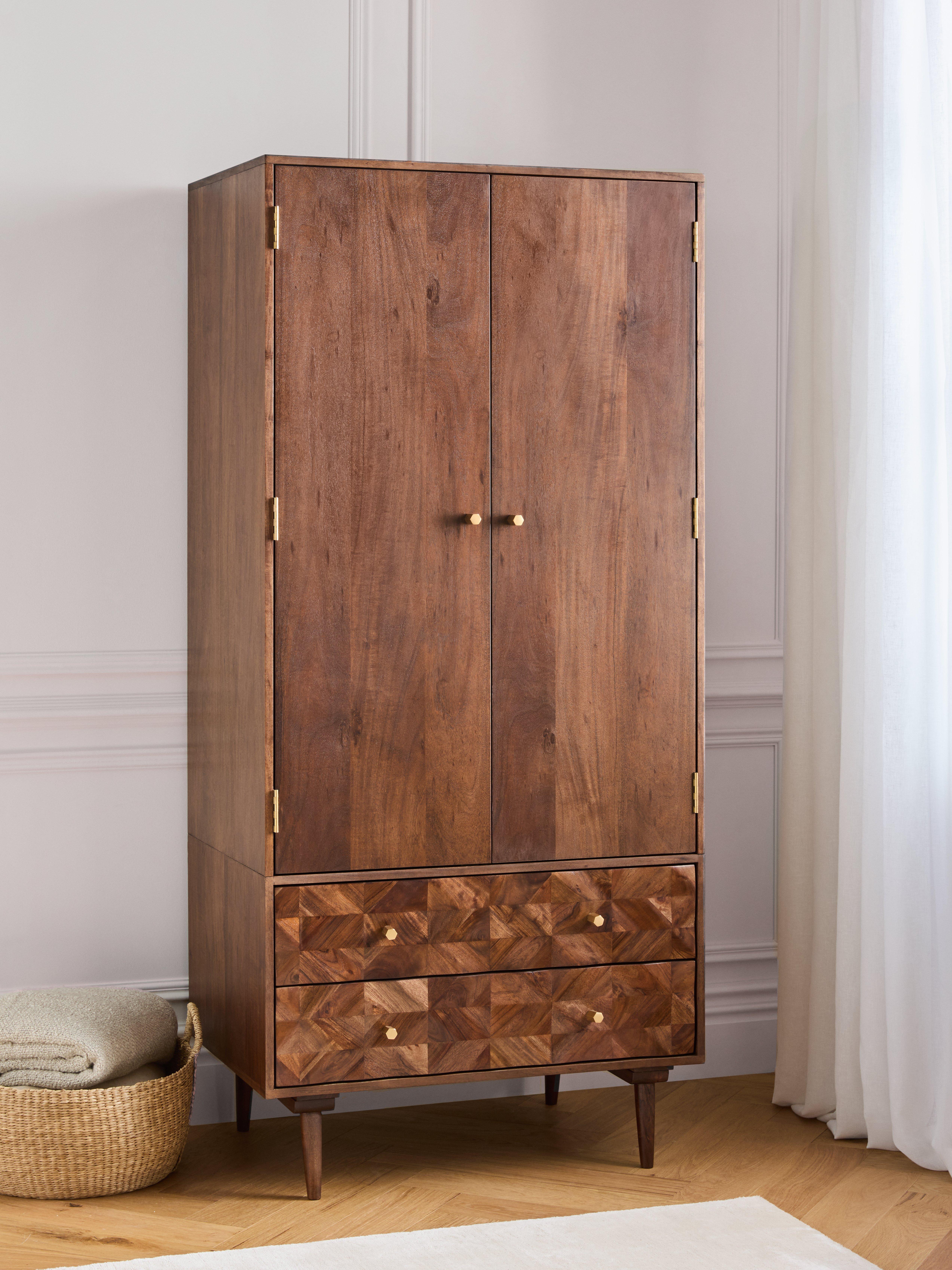 The spacious Franklin wardrobe is built from a combination of high-quality timbers including acacia wood. There's a metal hanging rail inside and two storage drawers beneath the main hanging section. Designed using marquetry techniques to create a distinctive, geometric facade to showcase the variety of its natural wood grains.