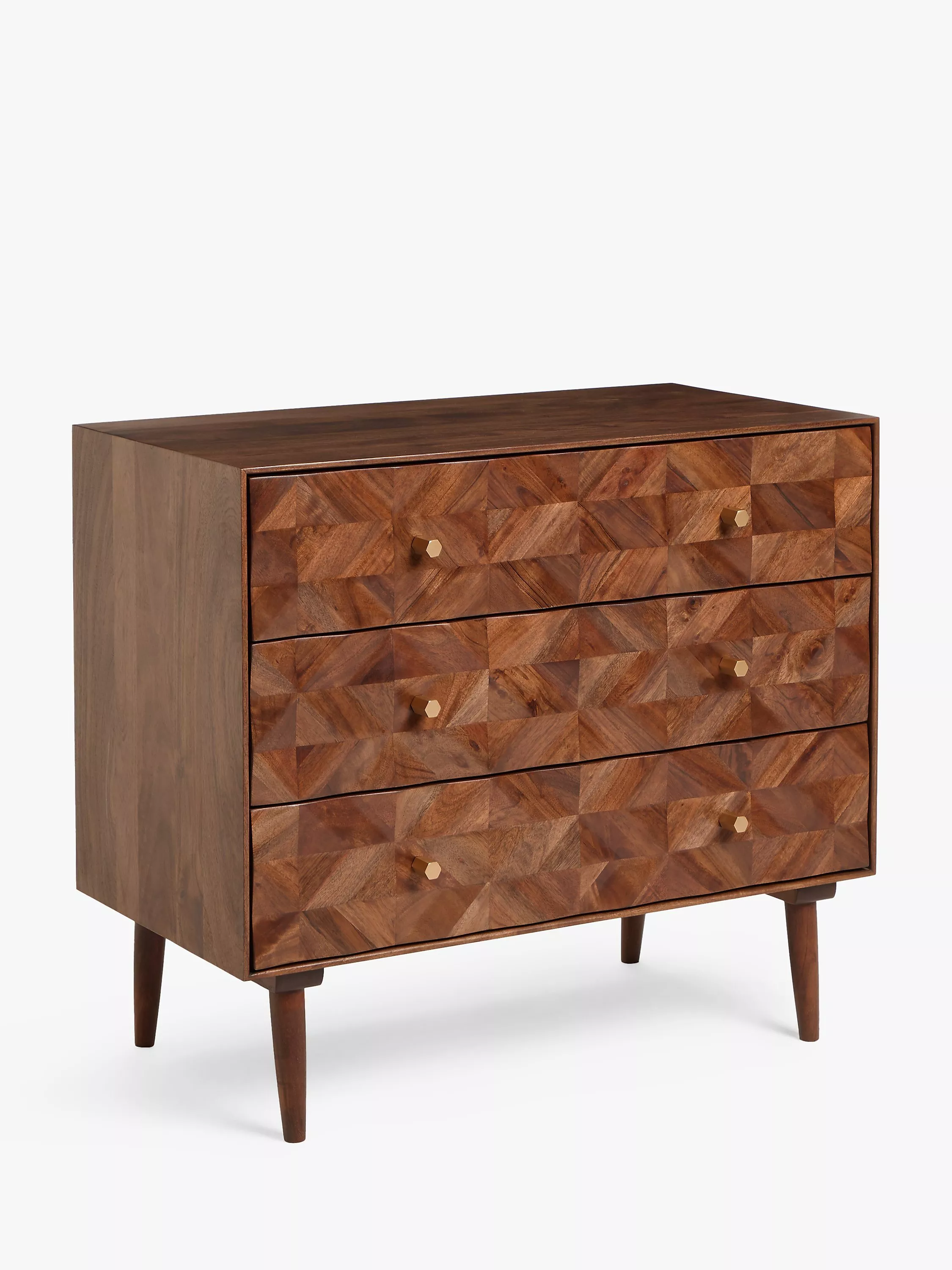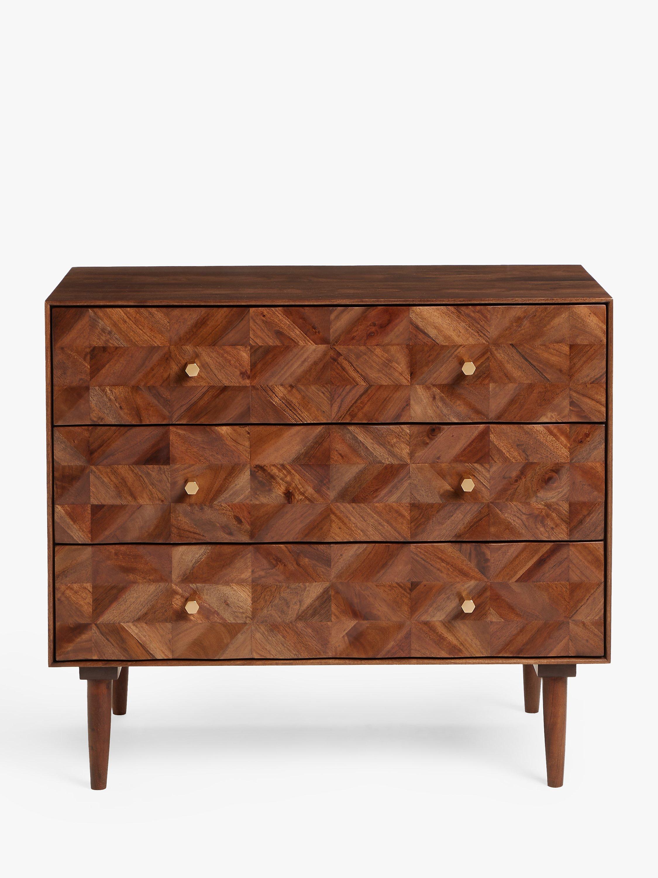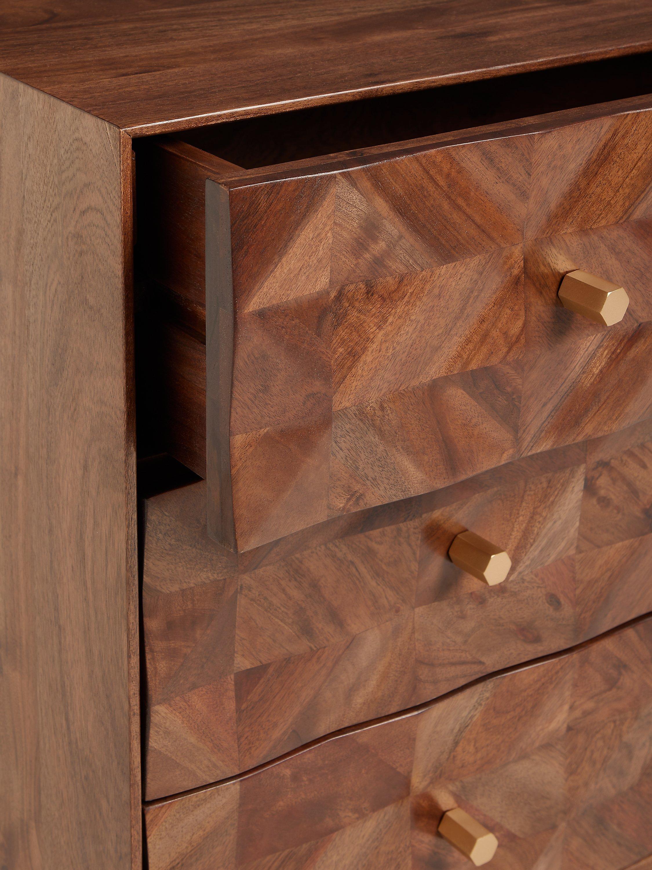 The Franklin chest provides plenty of storage space. Built from a combination of high-quality timbers including acacia wood, its three drawers will help to keep your bedroom clutter free. Designed using marquetry techniques to create a distinctive, geometric facade to showcase the variety of its natural wood grains.