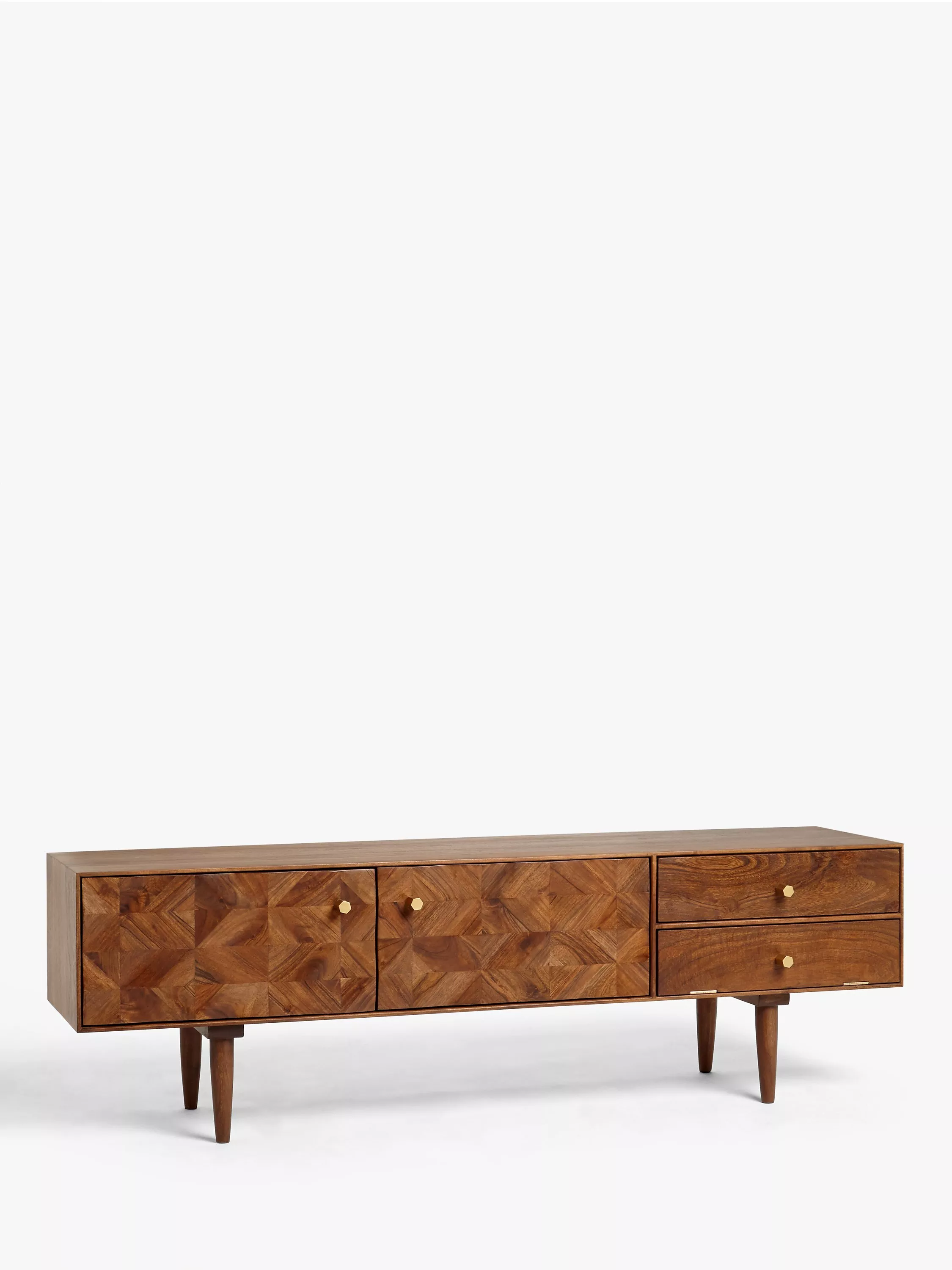 Designed by Swoon, made by us. With a shared commitment to exceptional design and quality, we've collaborated to create an exclusive furniture collection for the modern home. Crafted from wood, the Franklin TV stand uses marquetry techniques to create a tactile, geometric facade. The cupboard doors have been cut at angles and then reassembled in a tessellated design that plays with light and shadows to highlight the variety of its natural wood grains.