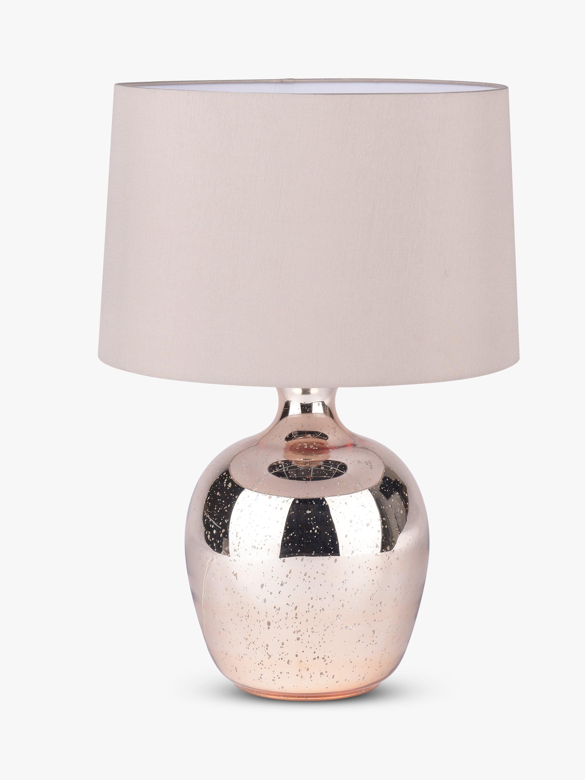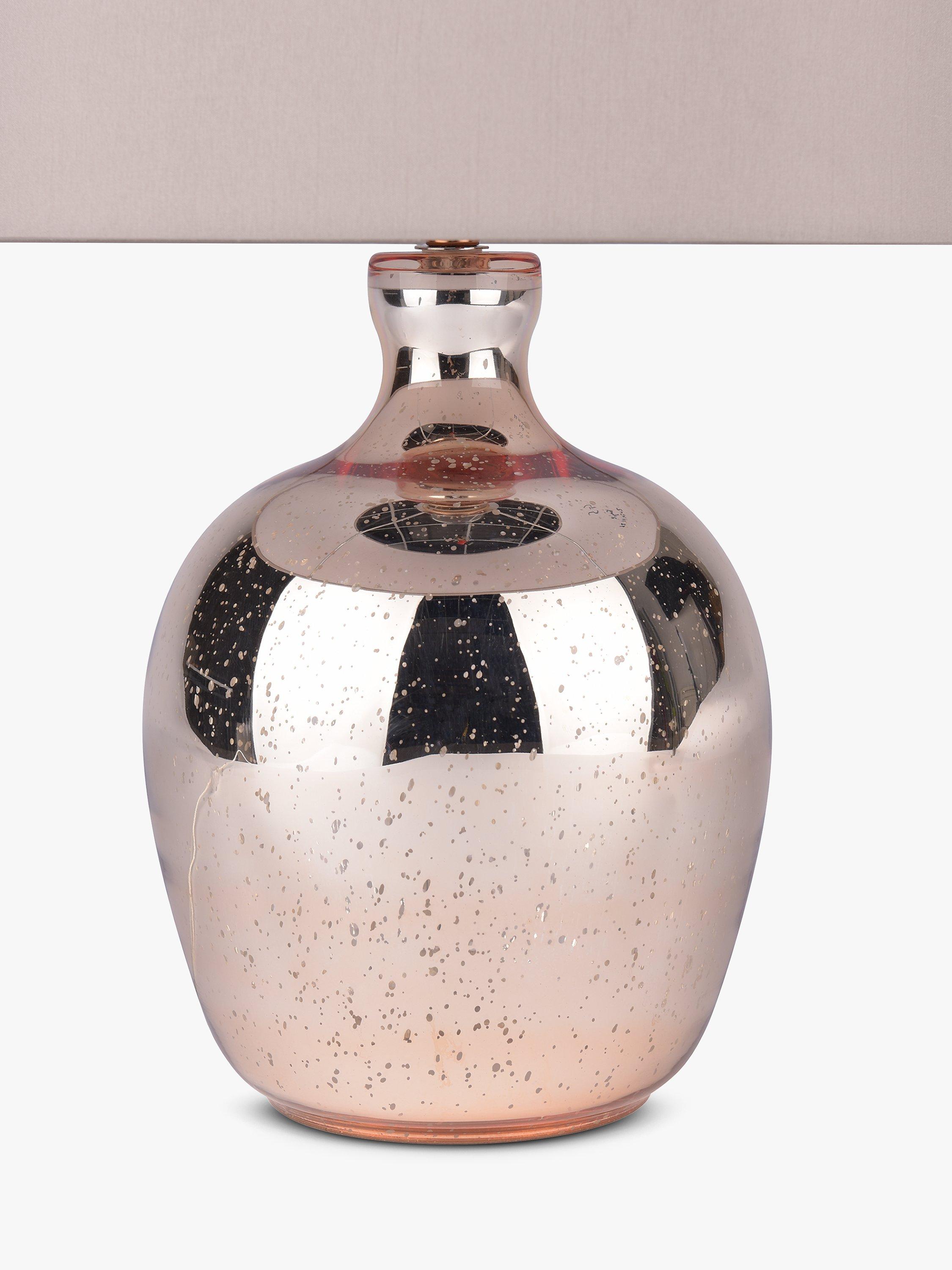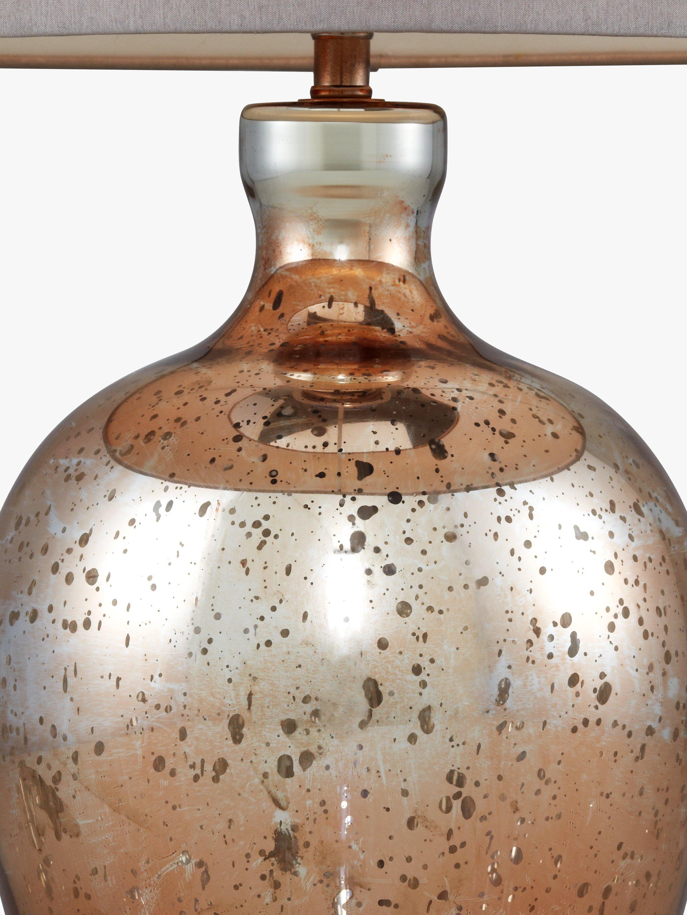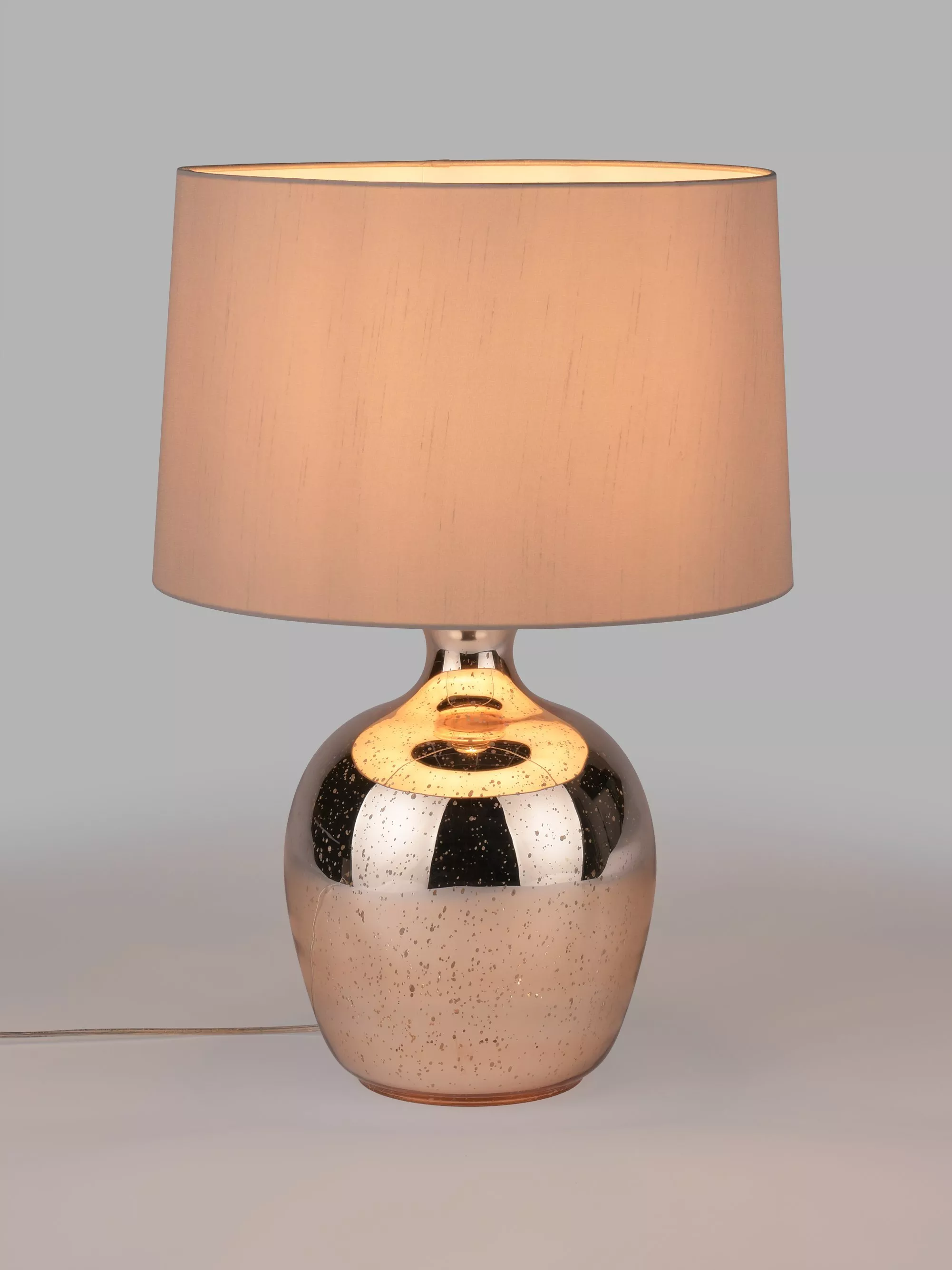 The mercurised finish on the base of this copper coloured glass lamp gives it a slightly weathered look. The faux silk shade has a slight taper, and is finished with a neutral hue to give this piece versatility.