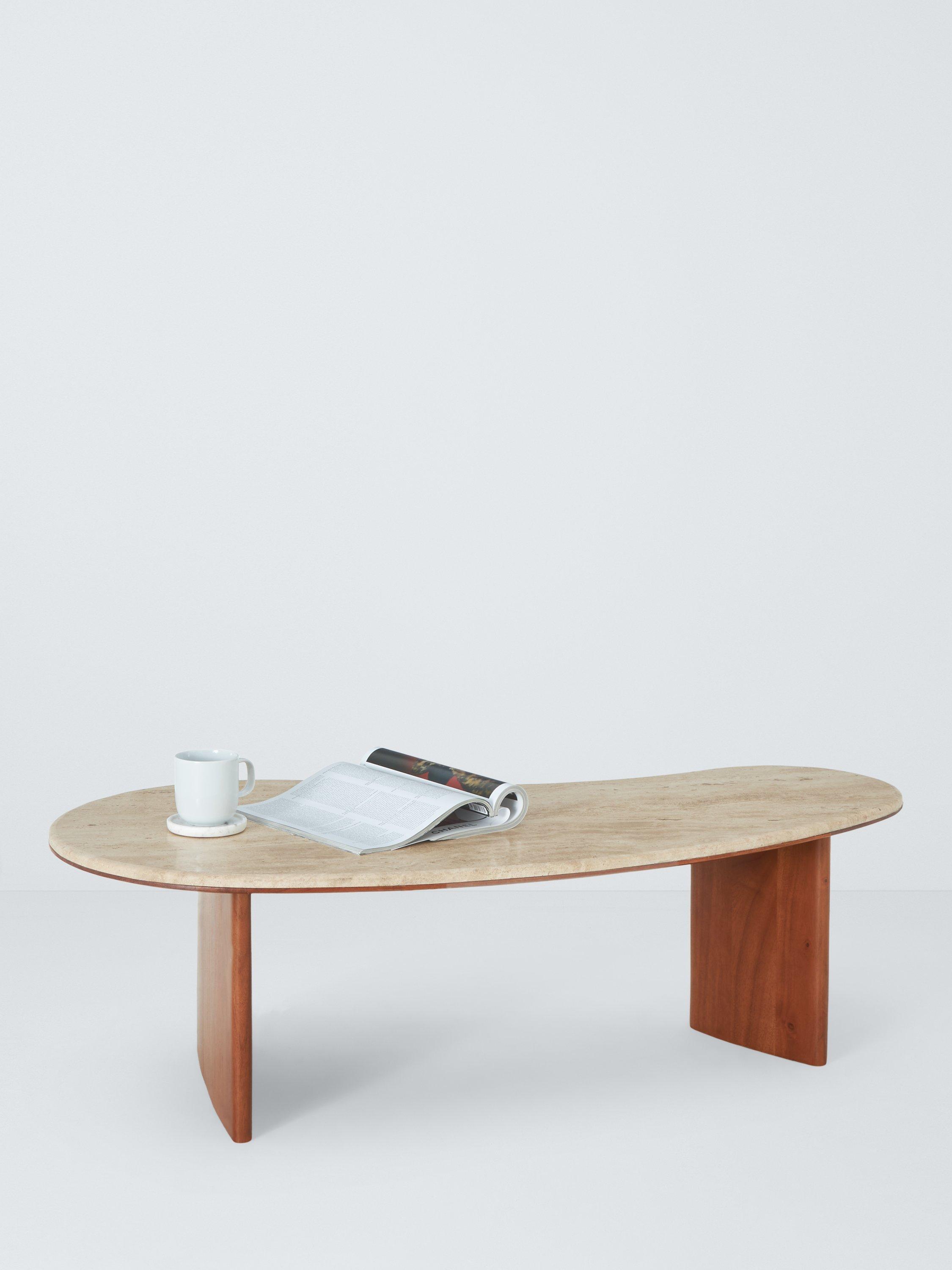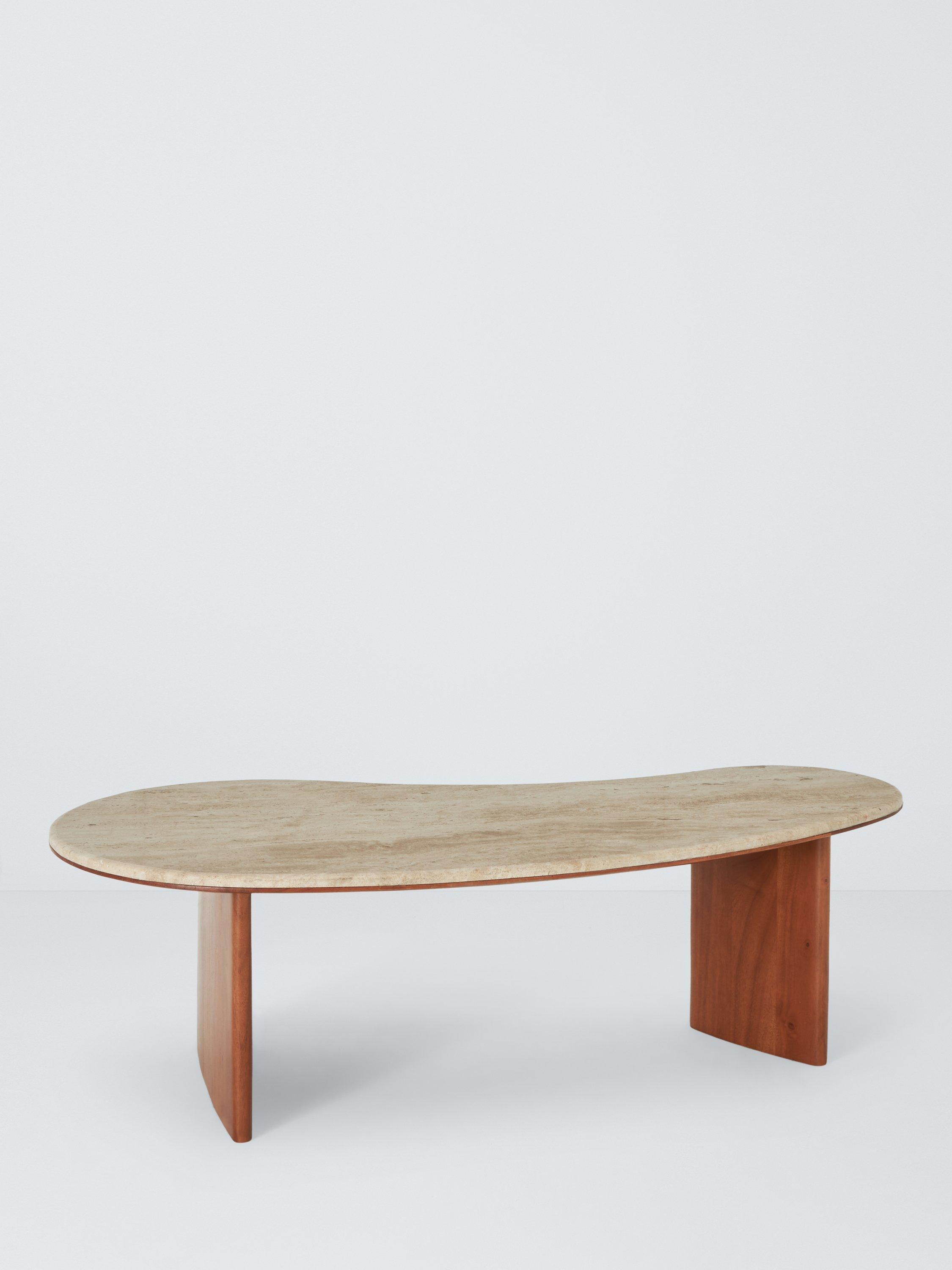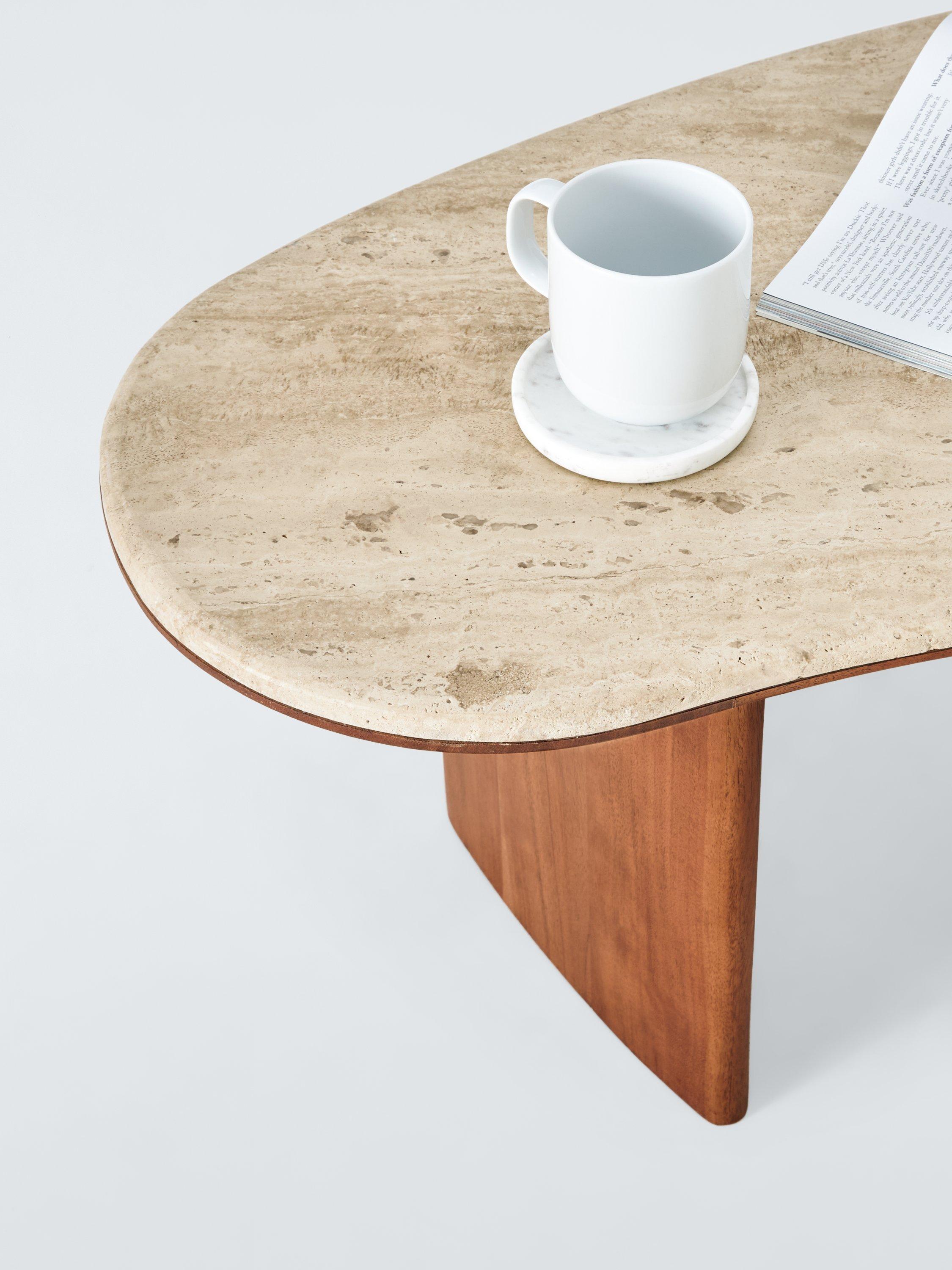 A soft sculptural form is perfect for those who want to add a touch of contemporary style to their living room or sitting area. Organic curved proportions, crafted from natural travertine stone, are partnered with a rich acacia wood base.