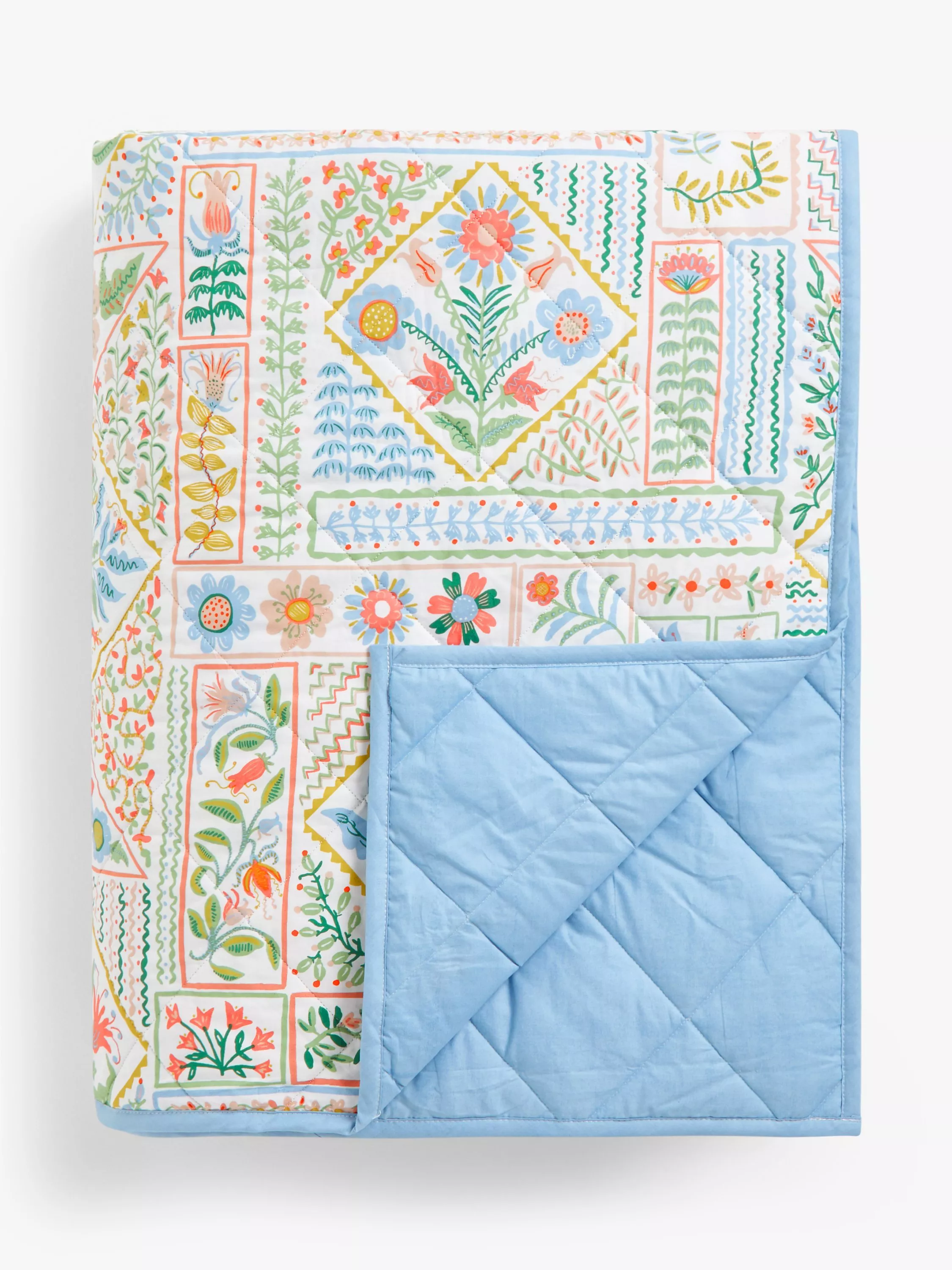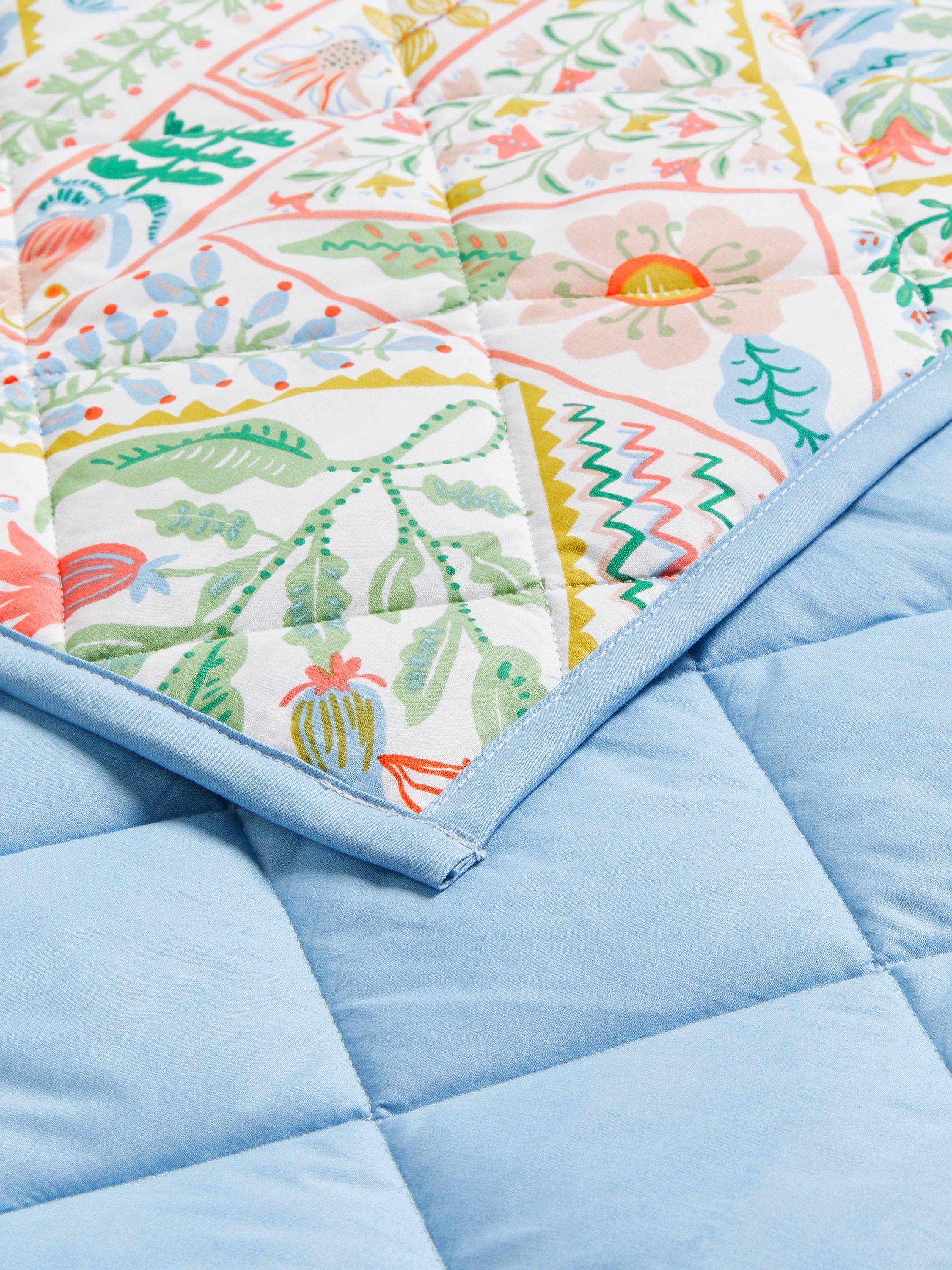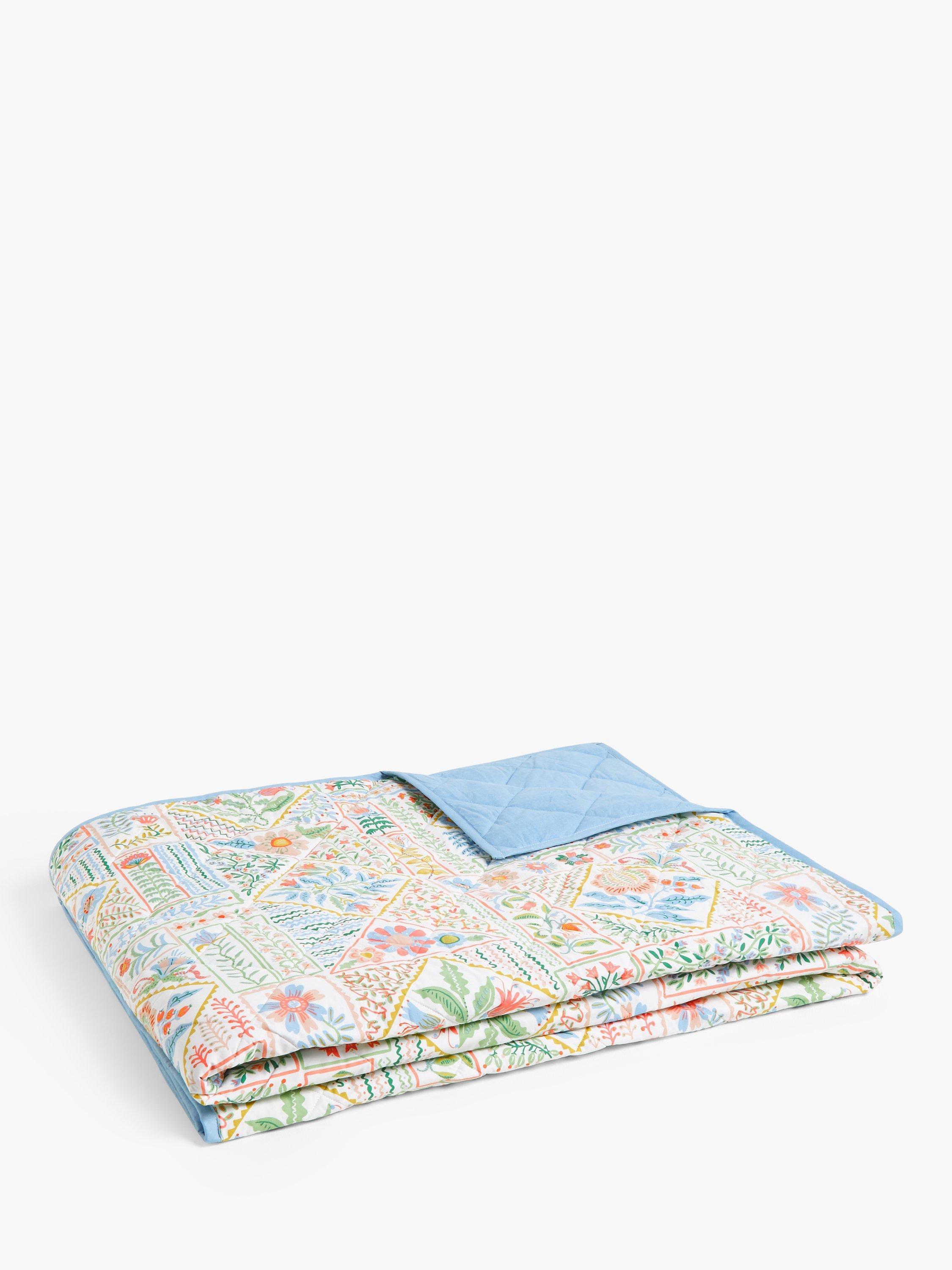 A lightly quilted printed cotton bedspread with a pretty floral print and sky blue reverse. Perfect for giving your bed a spring spruce-up.