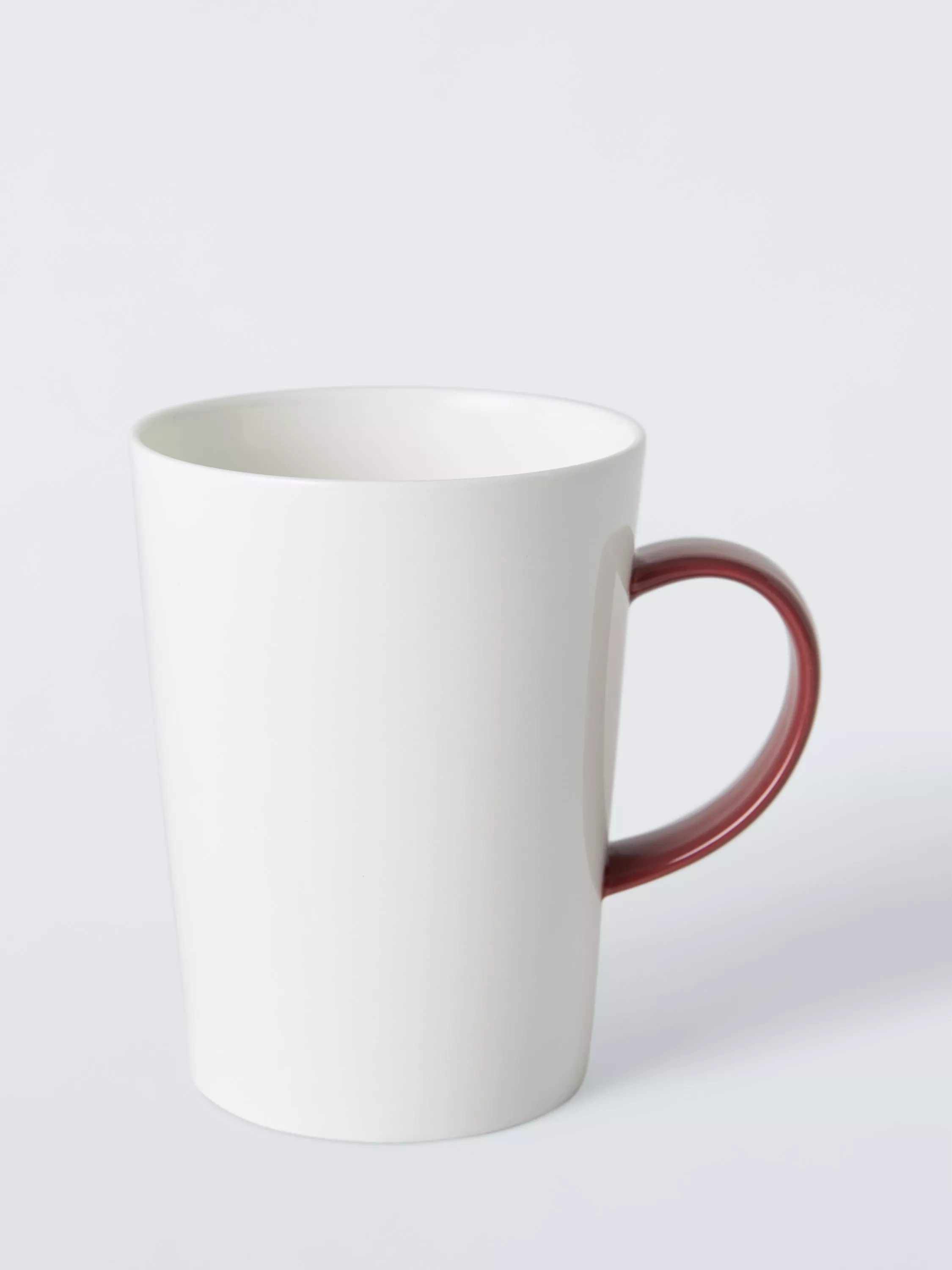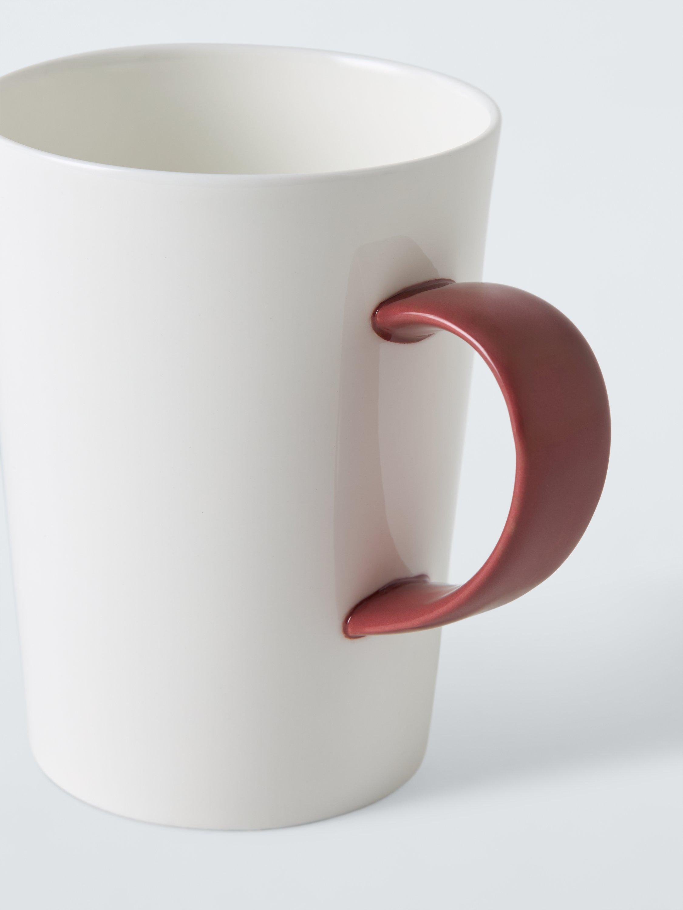 Tall mug made of resilient bone china with a wide handle. Microwave and dishwasher-safe.