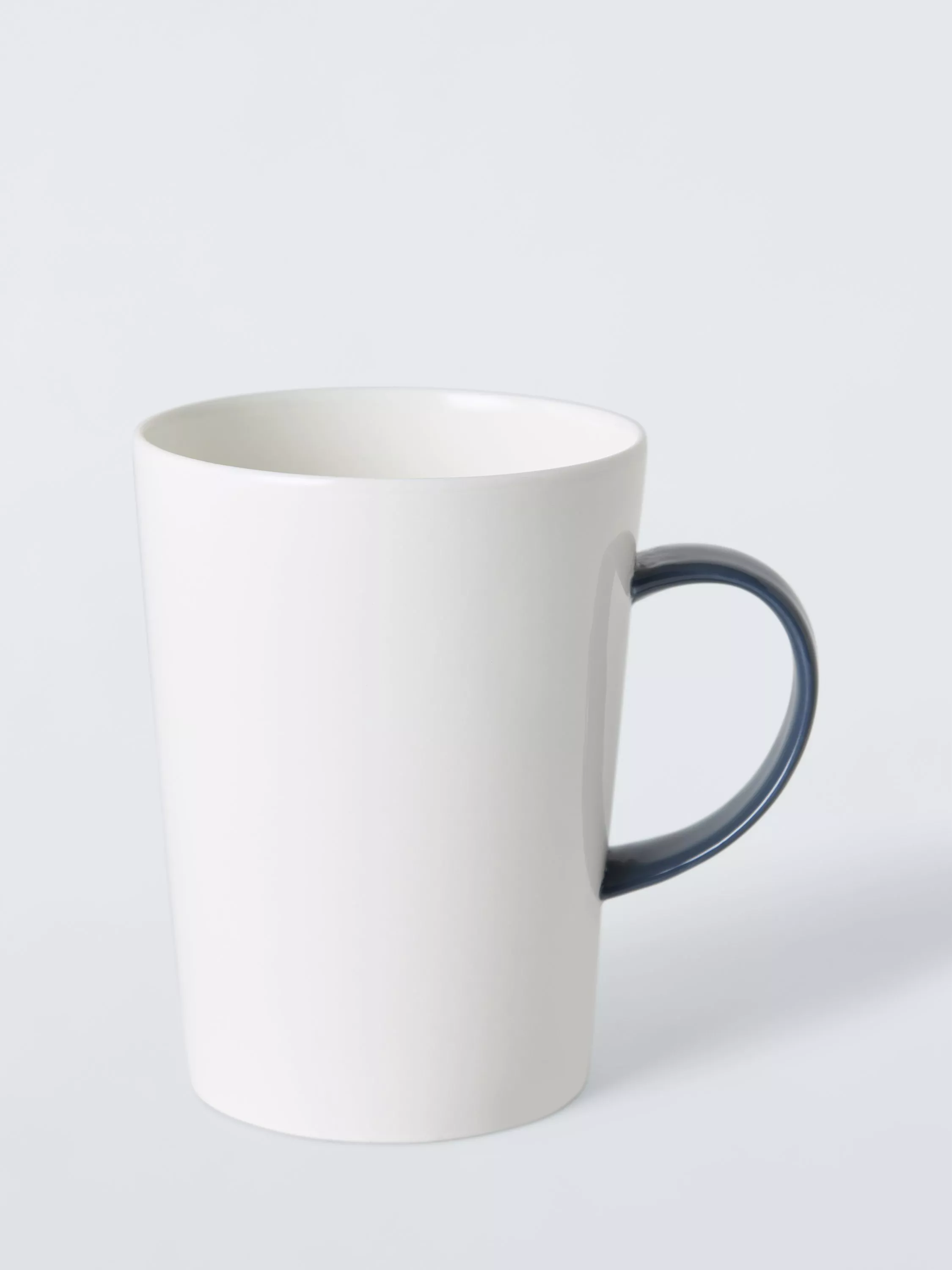 Tall mug made of resilient bone china with a wide handle. Microwave and dishwasher-safe.