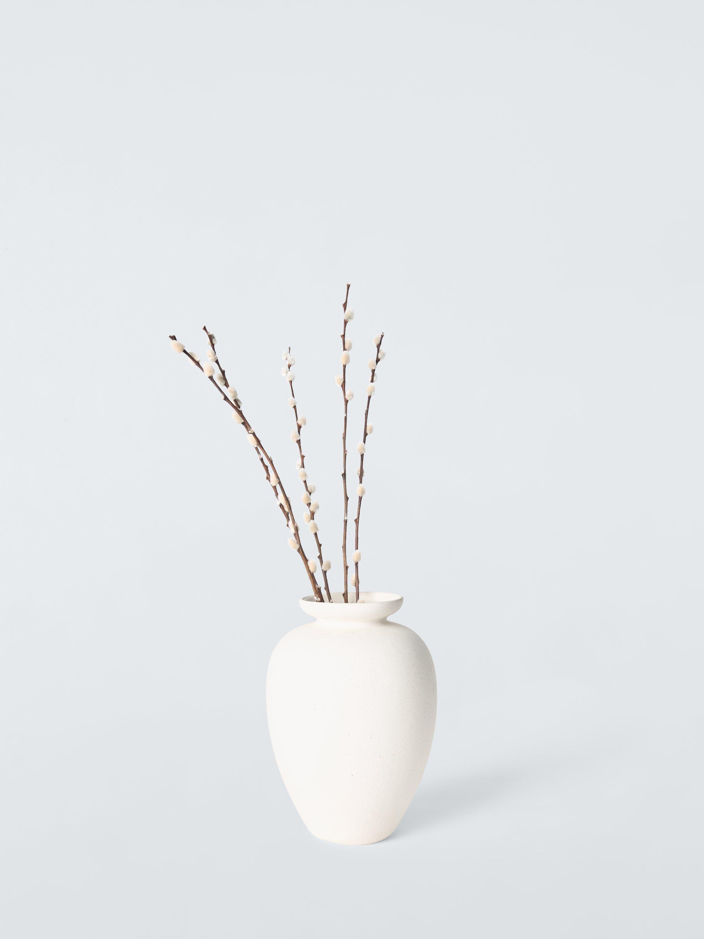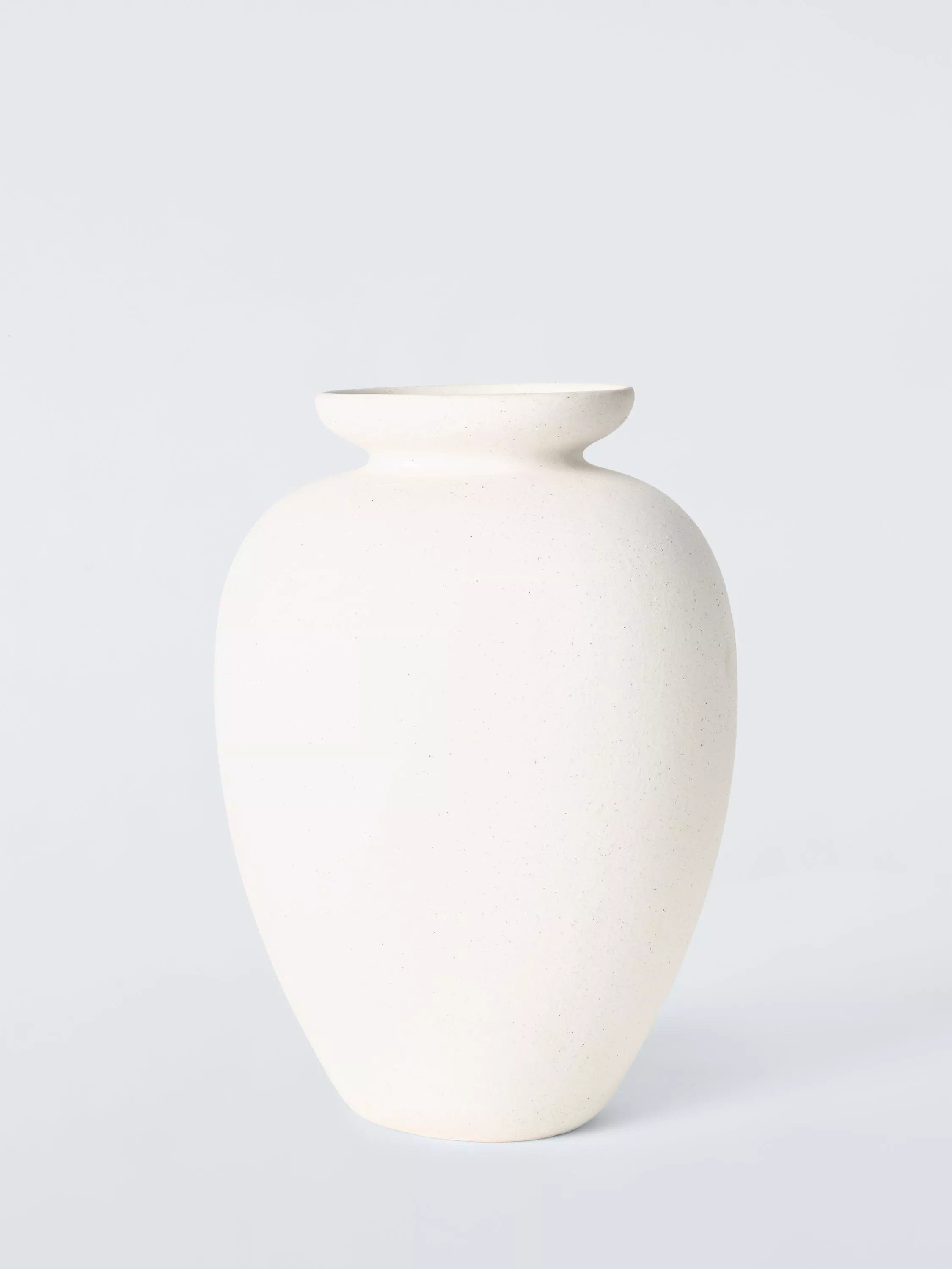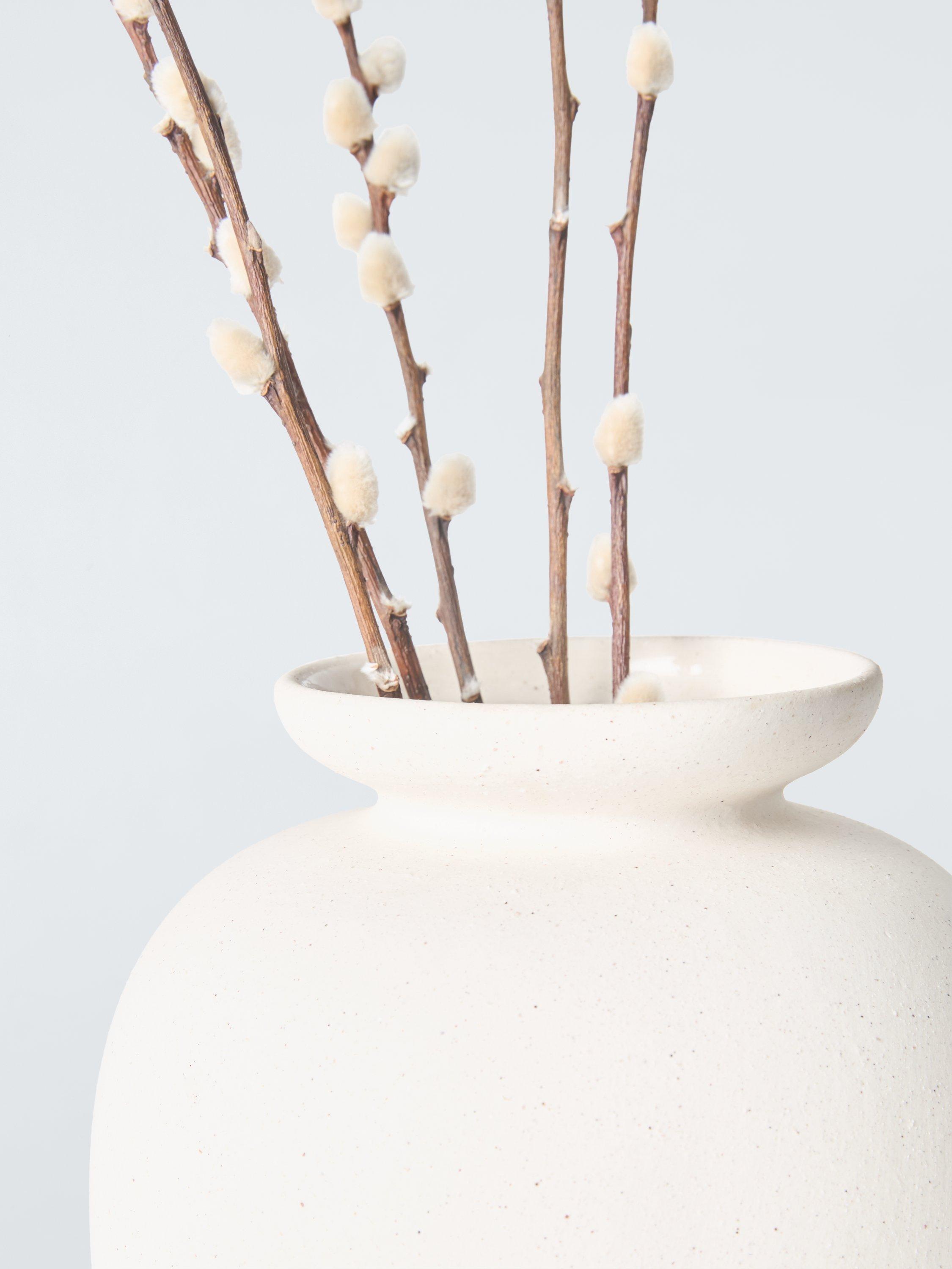 Beautiful in its simplicity, this tall stoneware vase is urn-shaped and finished in a neutral tone. Ideal for long-stemmed displays.