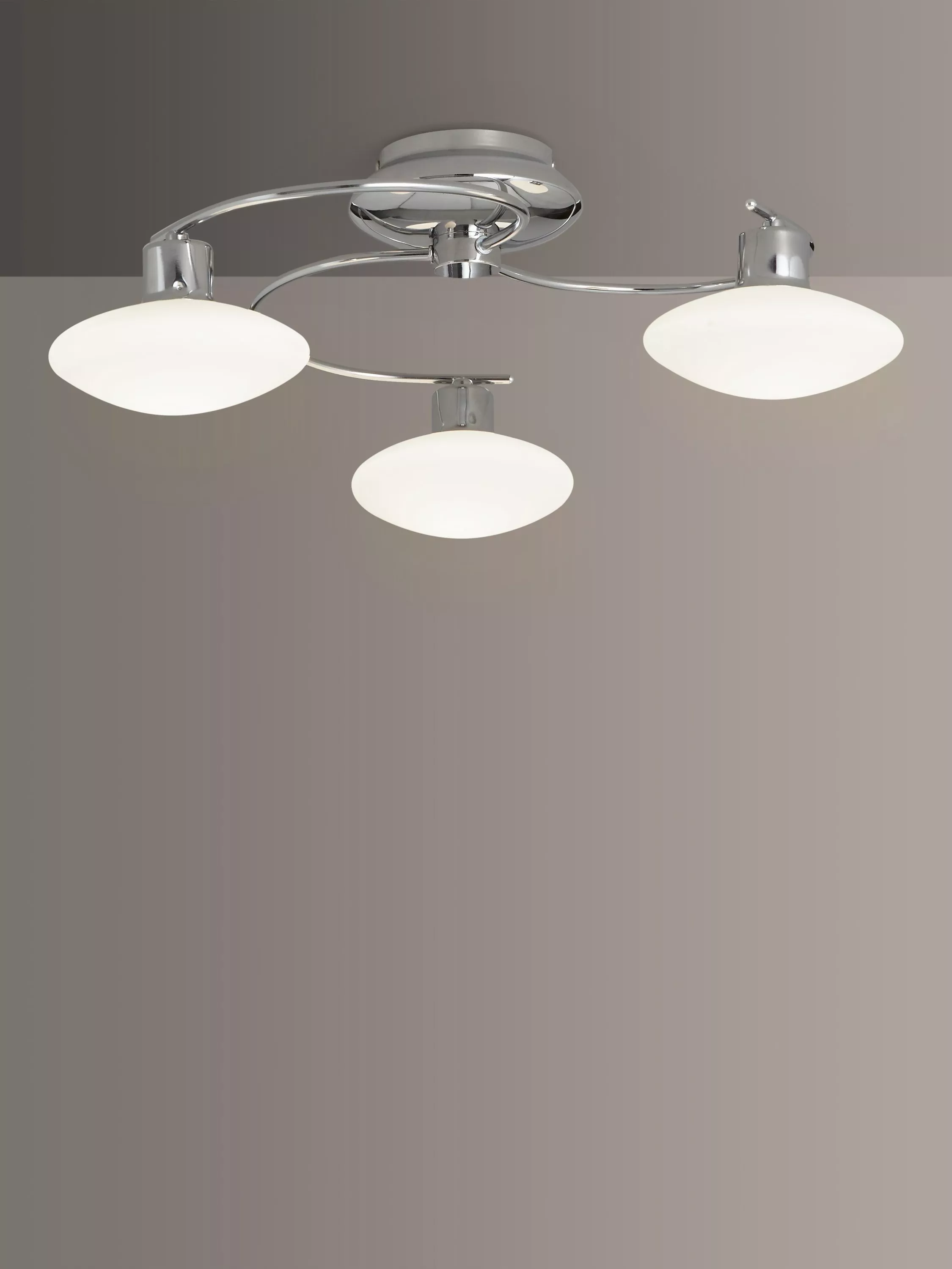 Thoroughly modern, this flush ceiling light features three swirling arms finished in a contemporary chrome. Each arm is completed with an opal glass disc-shaped shade.
