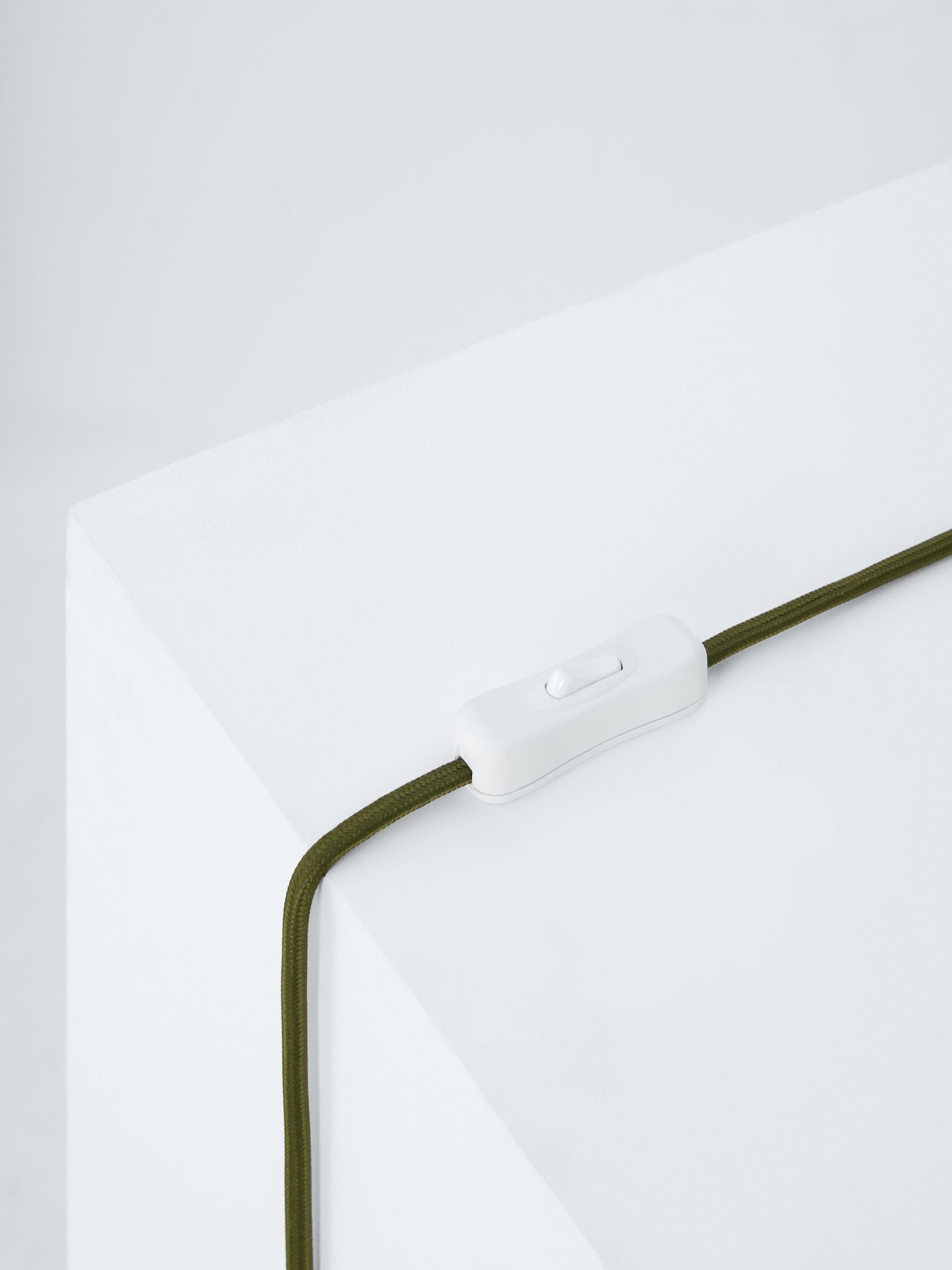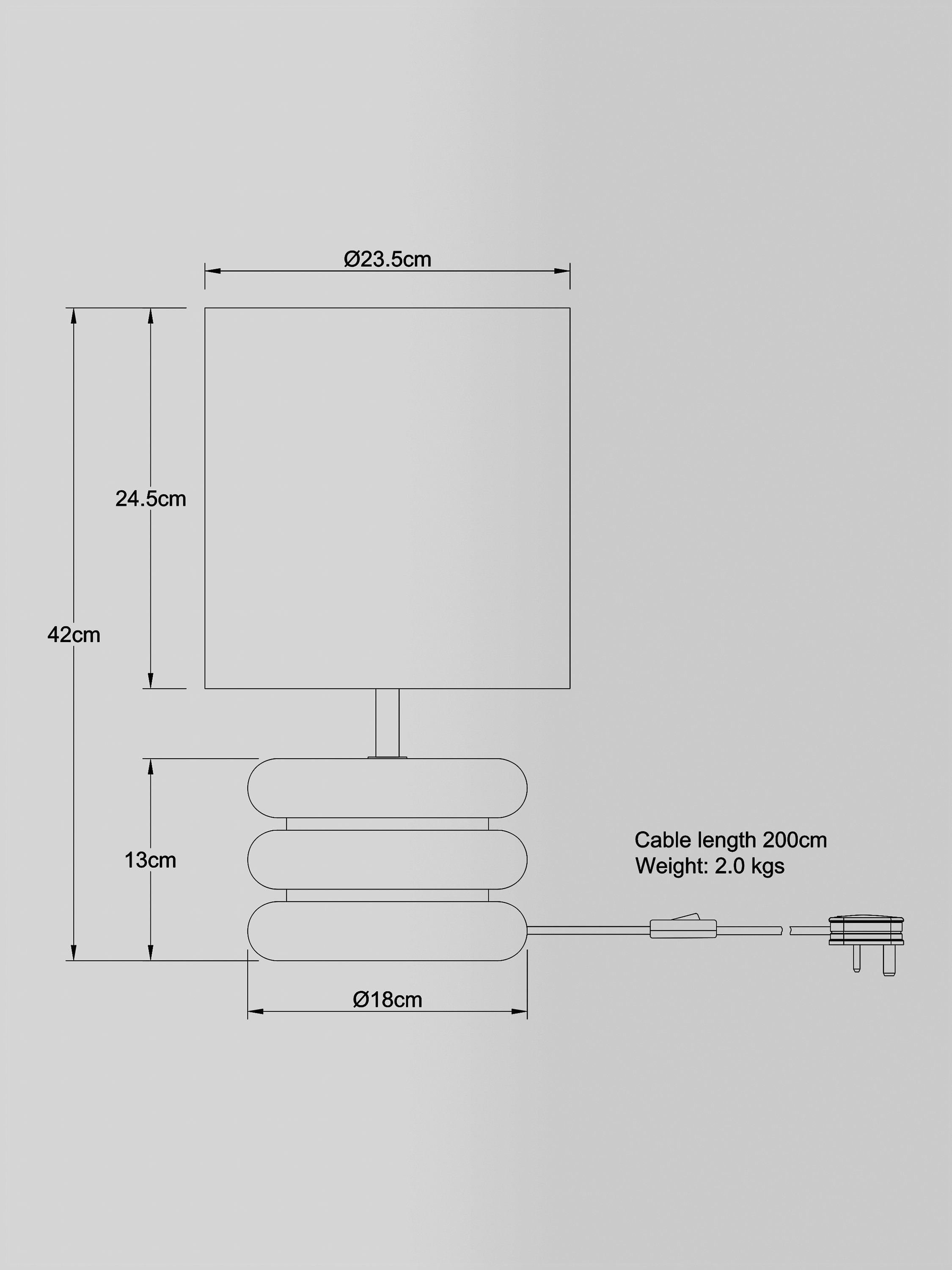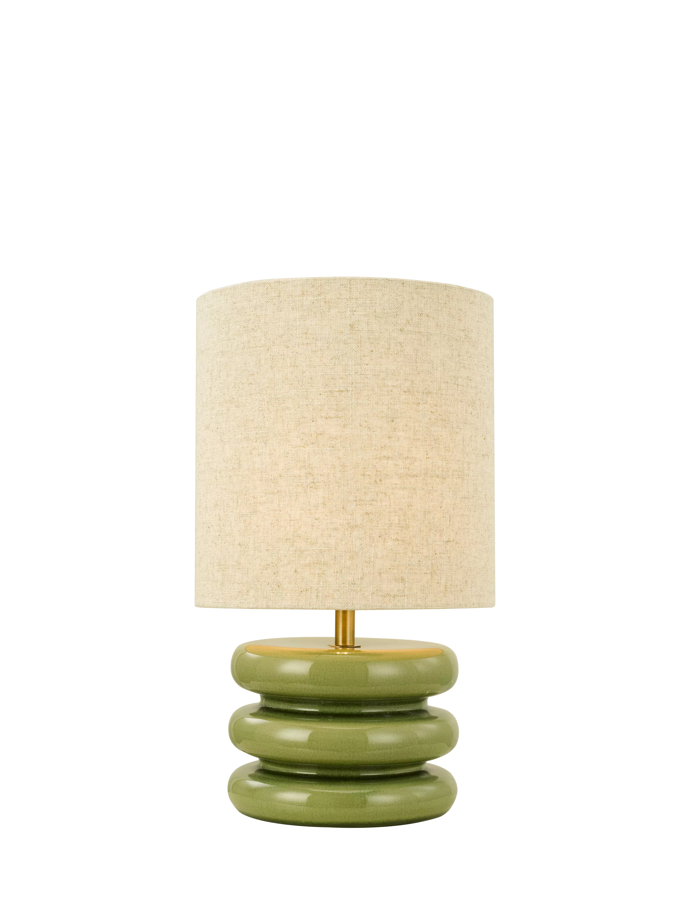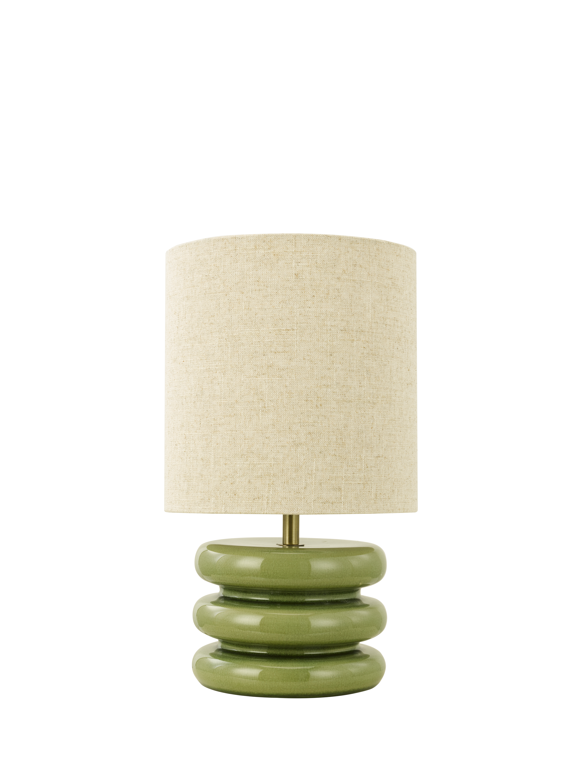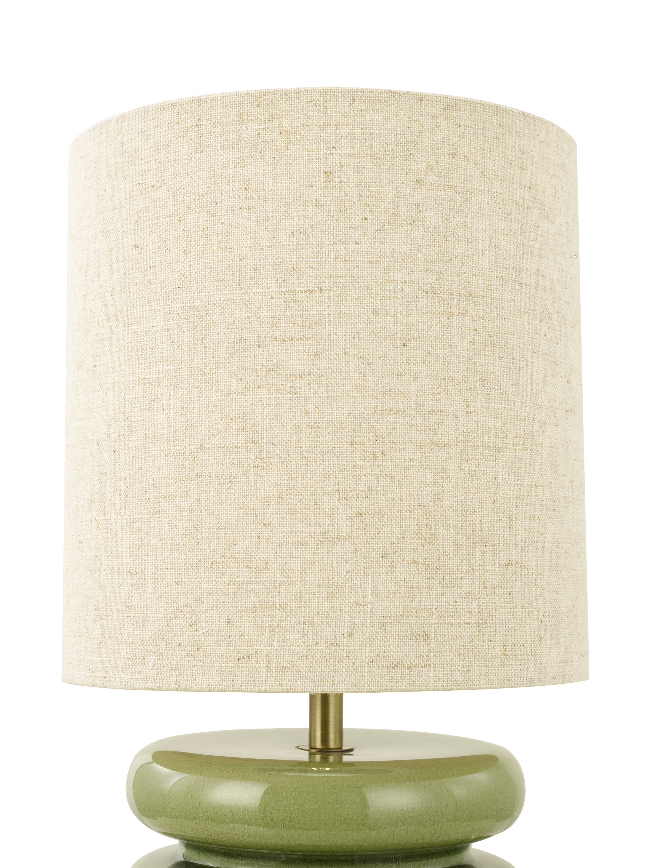Our Terra Table Lamp is a retro tiered shape, finished in a glossy crackle glaze, which shows off the shape. A cylindrical oatmeal woven lampshade and metallic accent complement the contemporary look. This table lamp is in a versatile size that can be used around the home. It comes with a braided cable and an inline switch.