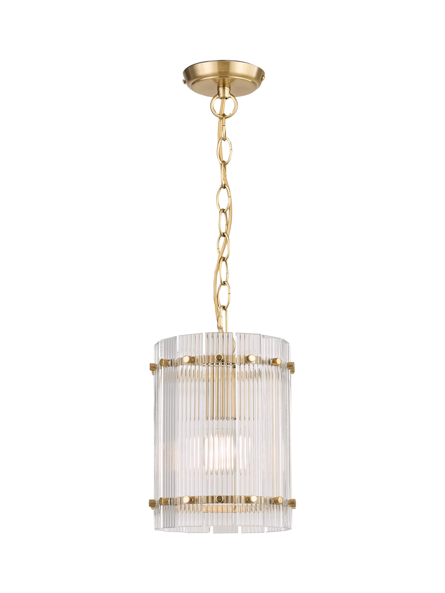 Created using bespoke ribbed glass tiles, the Textured Glass Hall Pendant has a contemporary faceted look. It's complemented with warm brass-plated metal work in an antique finish and a soft gold braided cable.