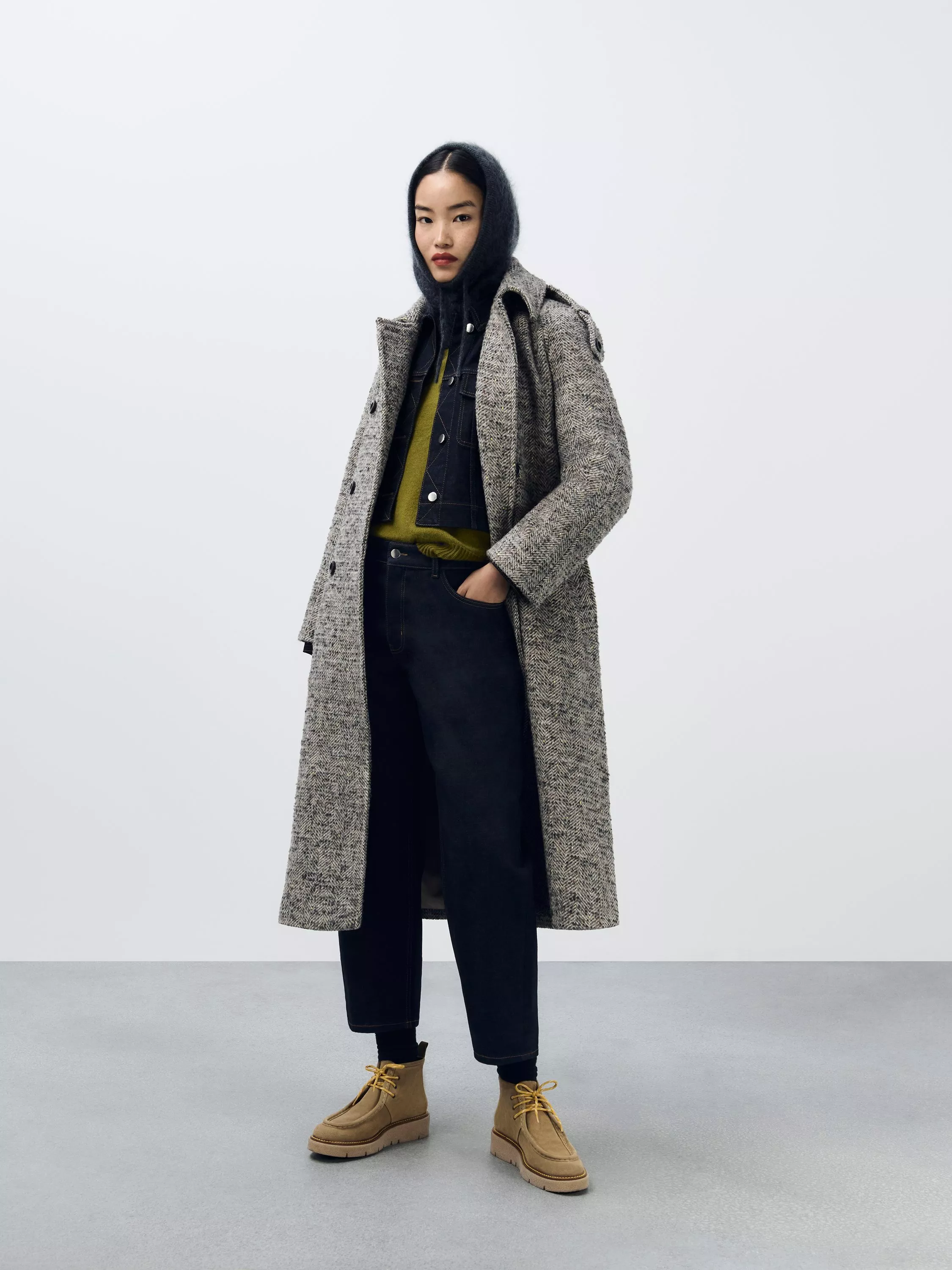 Subtly textured wool blend trench coat in a heritage-inspired herringbone pattern. This double-breasted design is styled with a storm flap, collar, epaulettes, front pockets and a self-tie belt to finish.