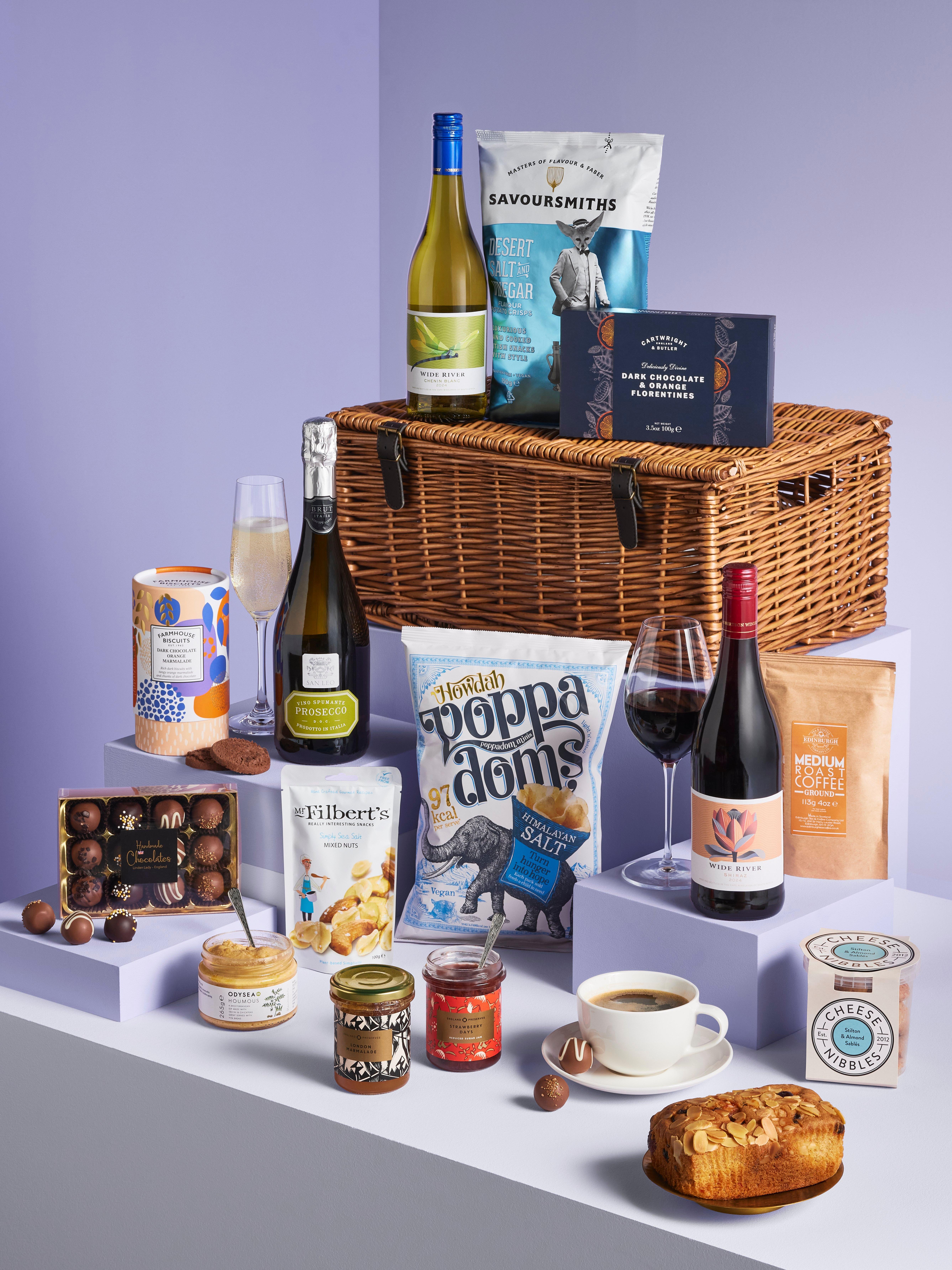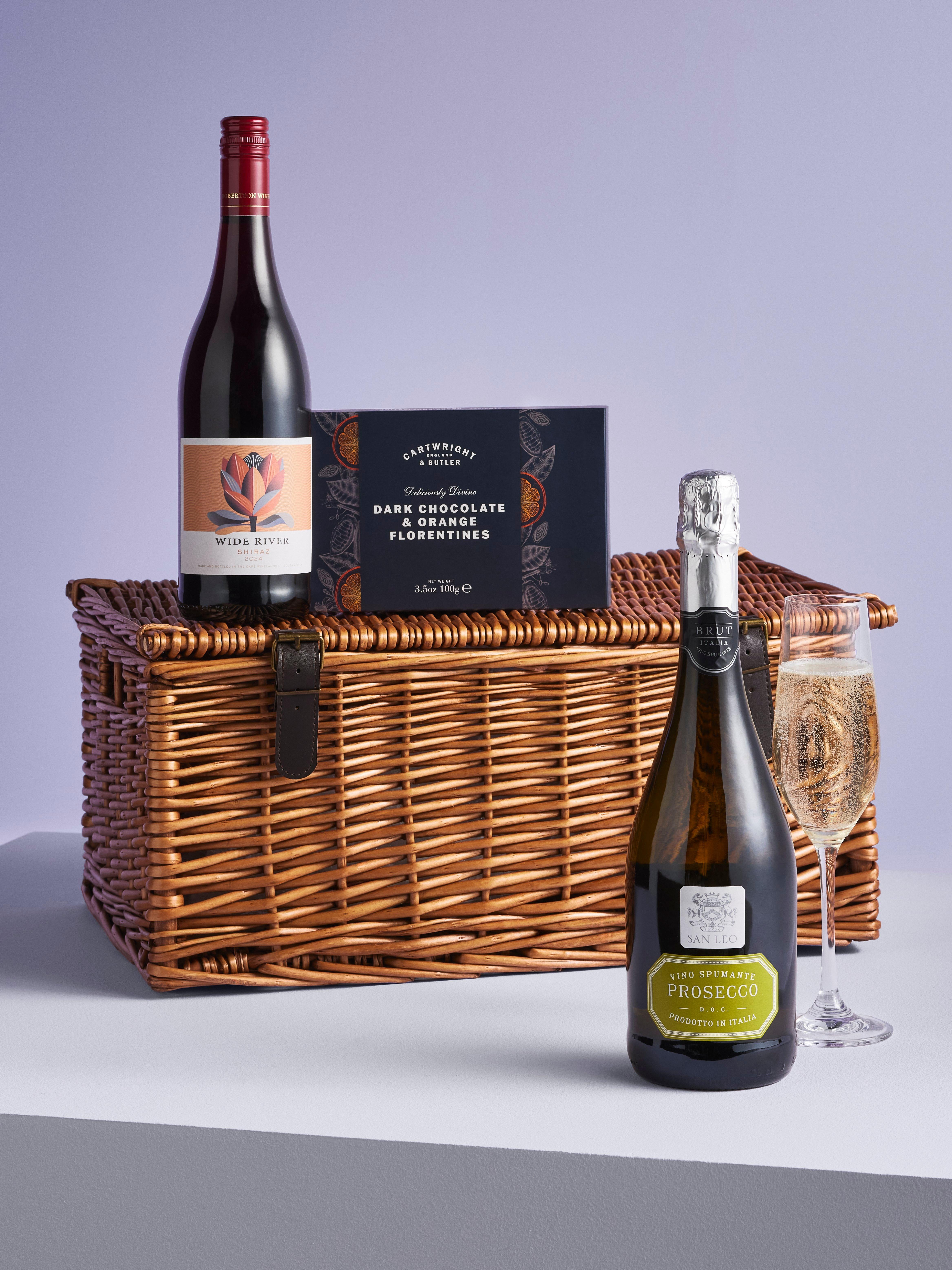 Presented in a beautiful wicker basket - this hamper is a celebration of the finer things. At the heart of this sweet and savoury selection are three delicious wines - a vibrant Chenin Blanc, a bold Shiraz and a celebratory bottle of Prosecco.