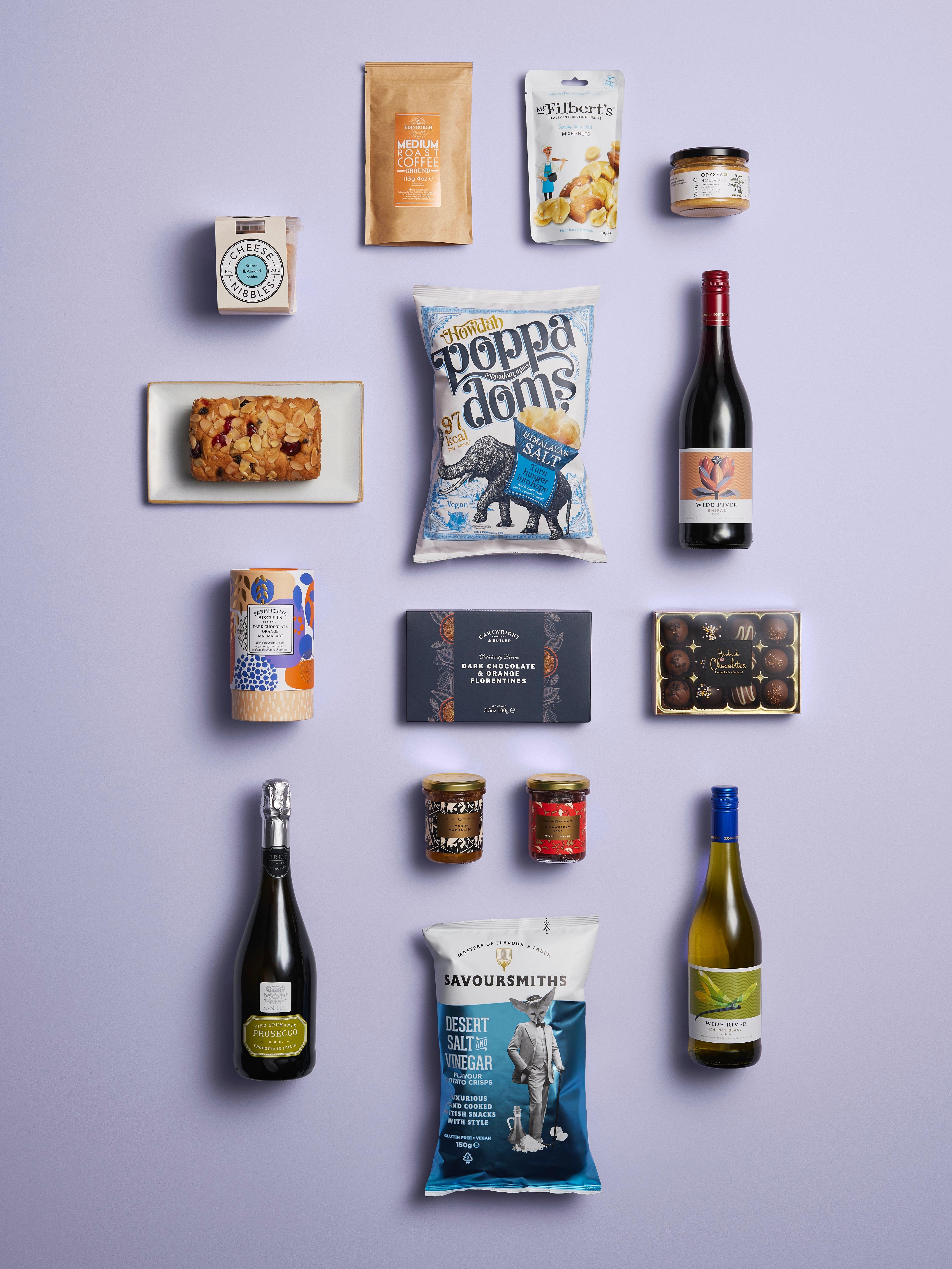 - Wide River Chenin Blanc 75cl Wide River Shiraz 75cl Waitrose San Leo Prosecco DOC 75cl Market Town Bakery Mixed Fruit Loaf Cake 370g Odysea Houmous 265g England Preserves London Marmalade 205g England Preserves Strawberry Days Jam 190g Farmhouse Biscuits Dark Chocolate Orange Marmalade 150g Savoursmiths Desert Salt and Vinegar Potato Crisps 150g Linden Lady 12 Milk & Dark Chocolate Truffles 130g Cheese Nibbles Stilton & Almond Sables 120g Edinburgh Tea & Coffee Company Medium Roast Ground Coffee 113g Mr Filbert's Simply Sea Salt Mixed Nuts 100g Cartwright & Butler Dark Chocolate & Orange Florentines 100g Howdah Himalayan Salt Poppadom Mini 80g