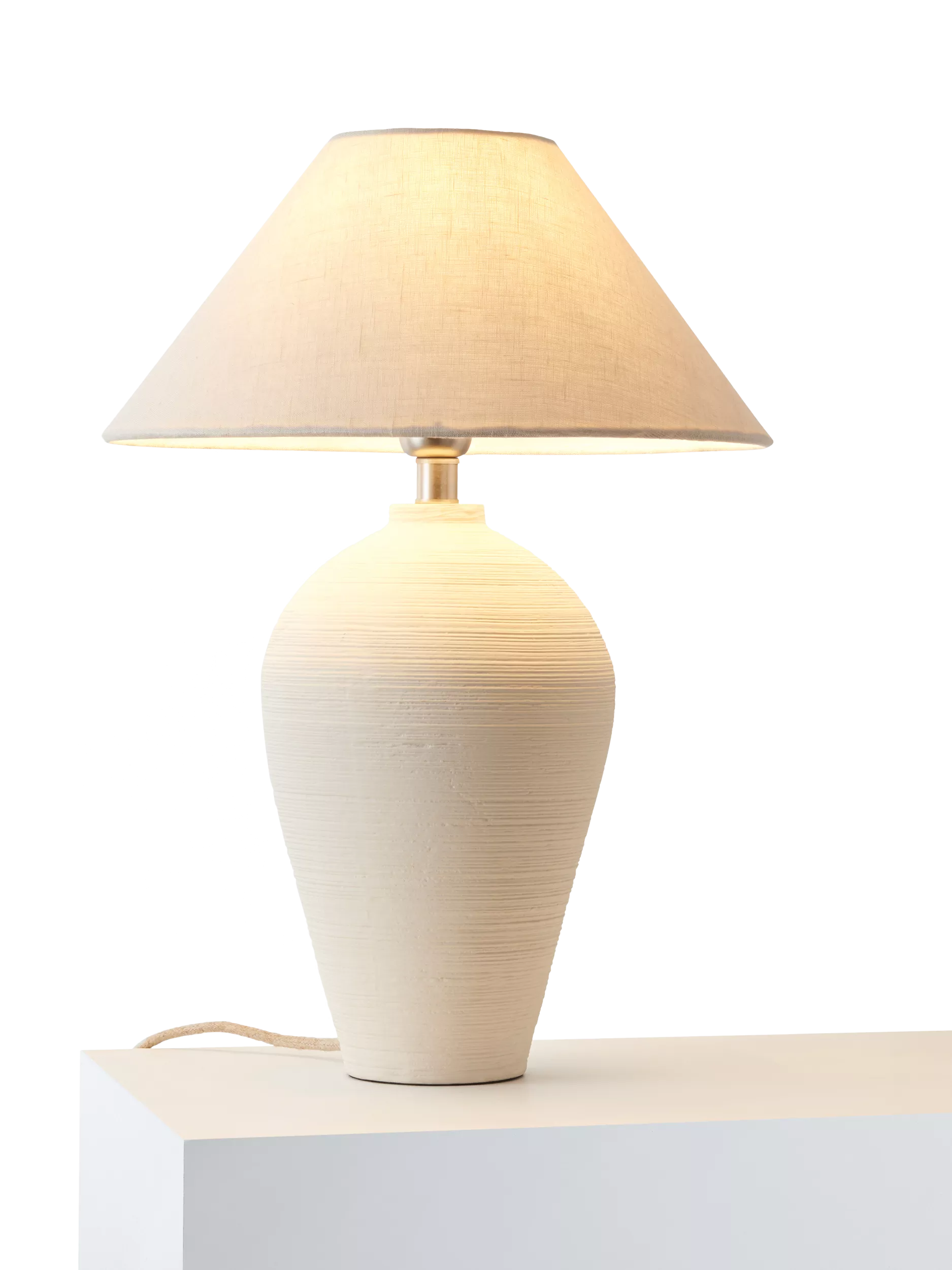 The Potter's Wheel Tall Table Lamp is crafted with subtle ribbed detailing resembling the texture of clay at the potter's wheel. The faux-linen shade completes the harmonious design and provides a warm, diffused glow of light.