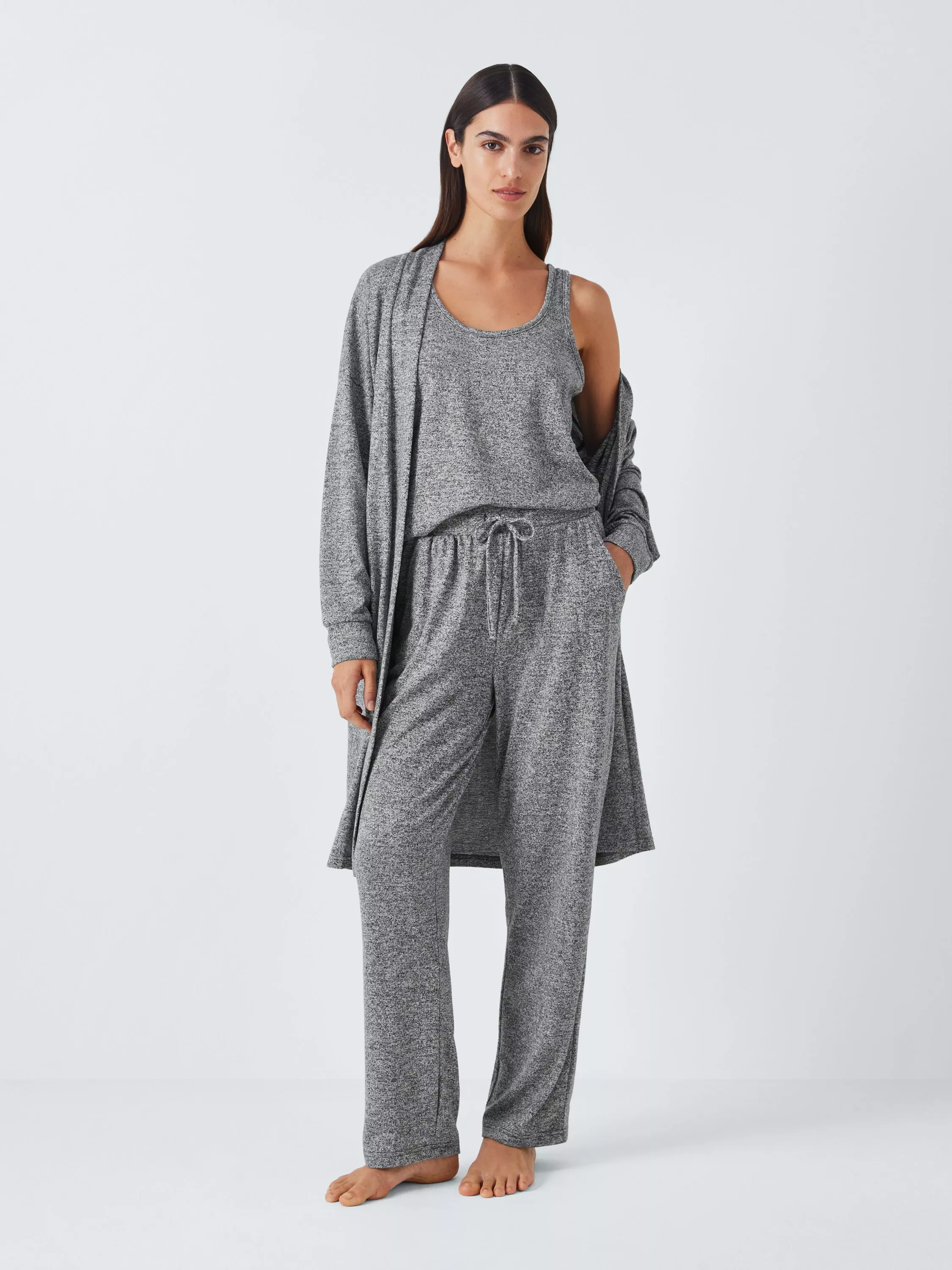 For days when the sofa is calling, answer in this three part lounge set from our own-label collection. Made from a lightweight fabric with a hint of stretch, the set includes a vest top, longline cardigan with handy pocket, and joggers with adjustable waistband. We recommend accessorising with a pack of your favourite biscuits and a cup of tea.