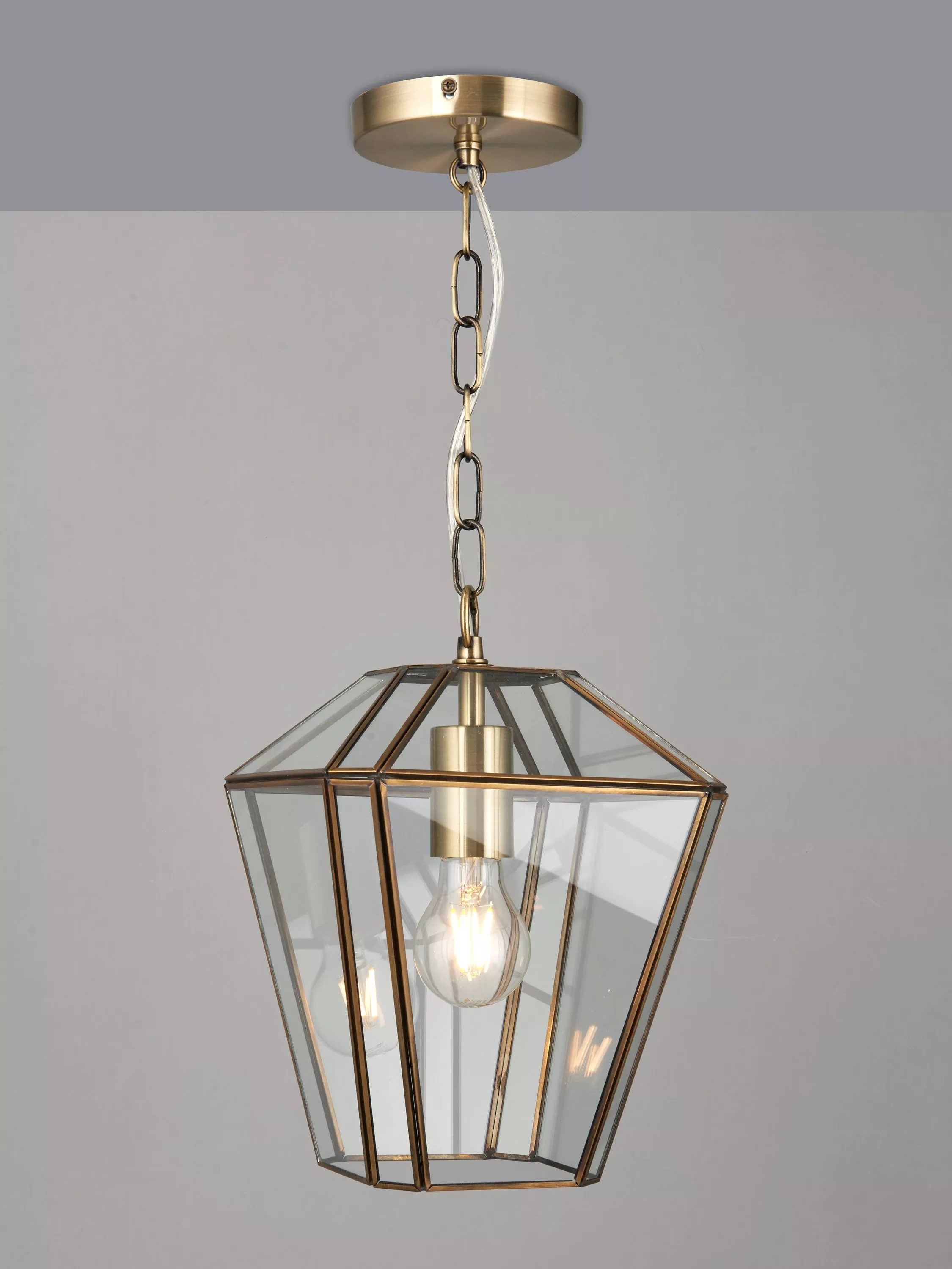 A timeless light fitting that will enhance a warm glow in your space, this lantern pendant is made from clear glass panels with an antique-brass plated metal frame. Its compact size makes it well-suited for installation in hallways, or in a series above a table, and we like how the height-adjustable chain allows for perfect positioning.