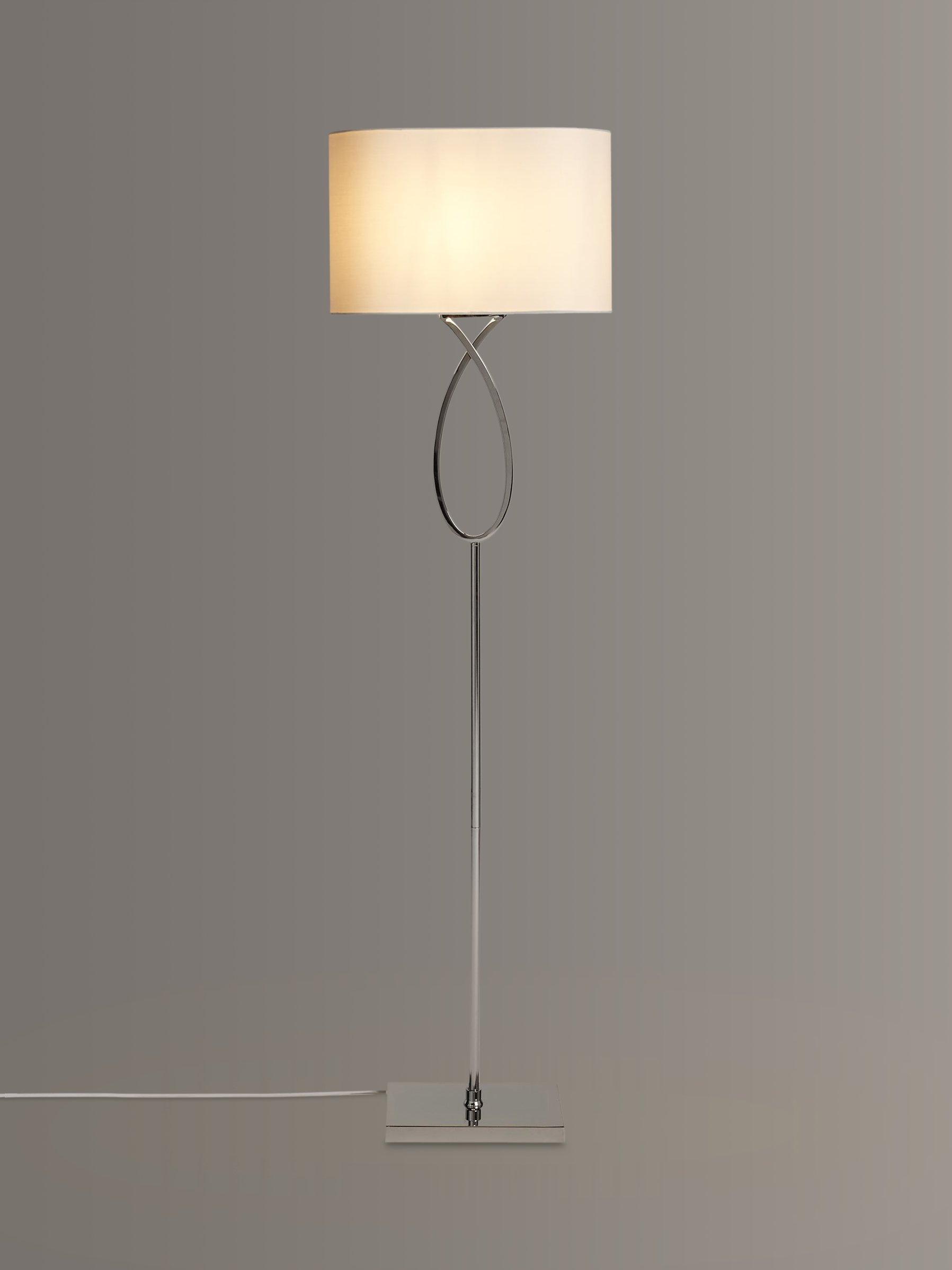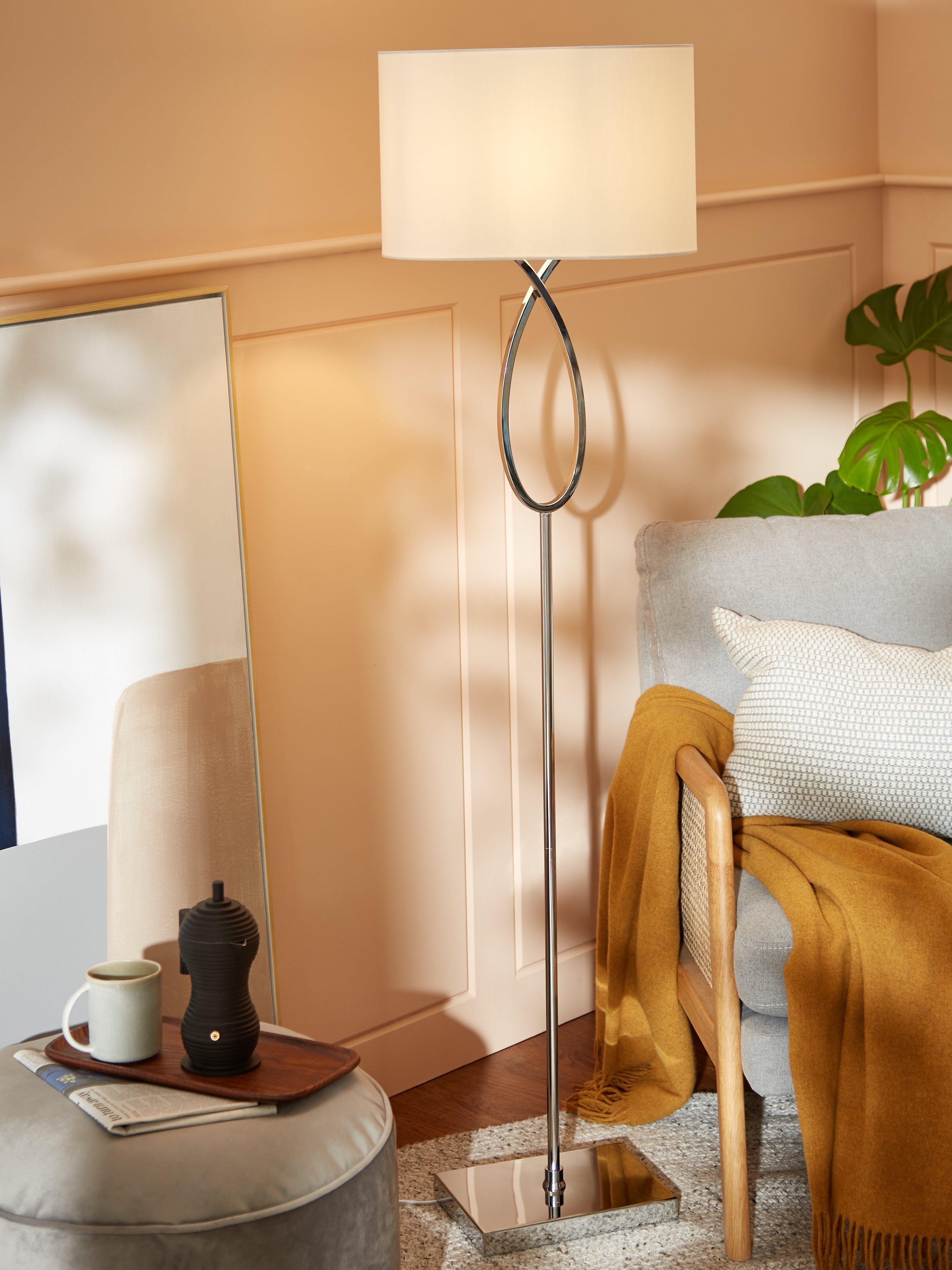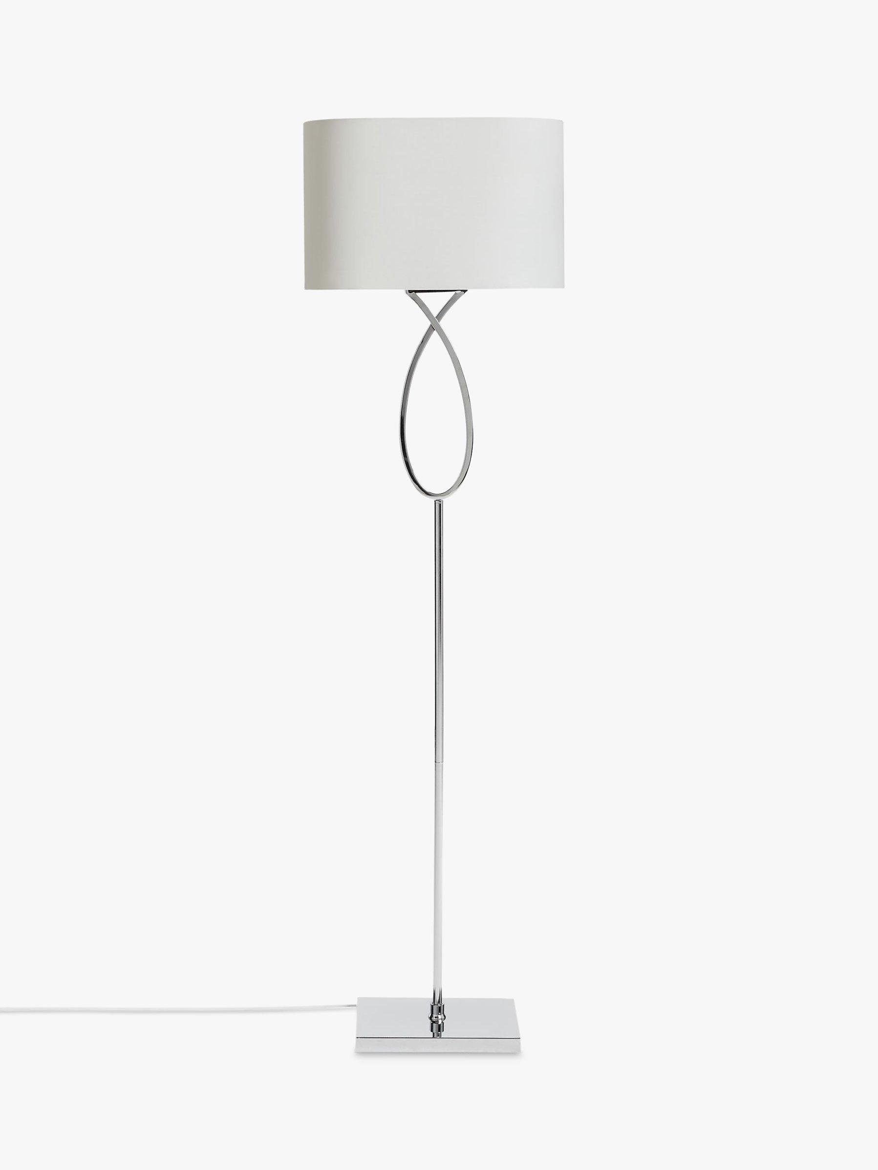 The elegant profile of our Tom floor lamp is highlighted in its minimalist, polished chrome design. A teardrop pattern in the stem lends a style accent, while a polycotton white lampshade enhances a diffused lighting ambience. It's versatile for both traditional and modern settings.