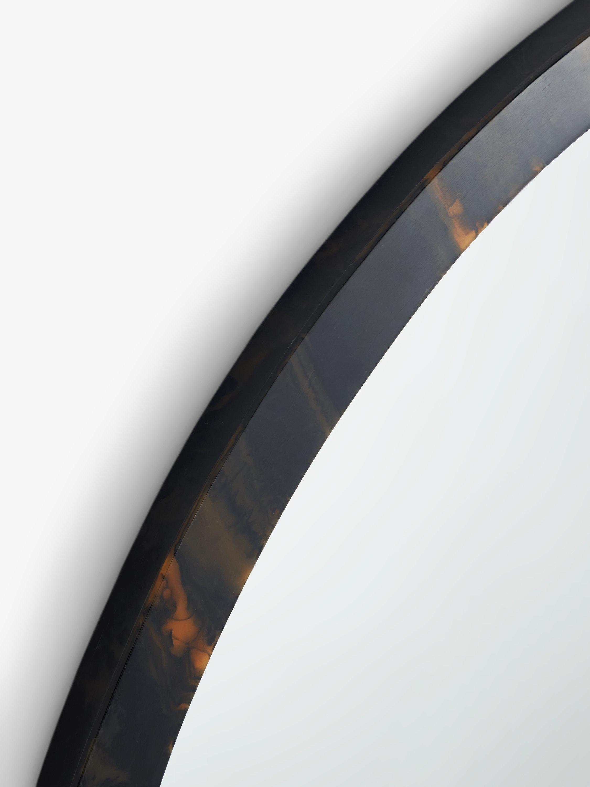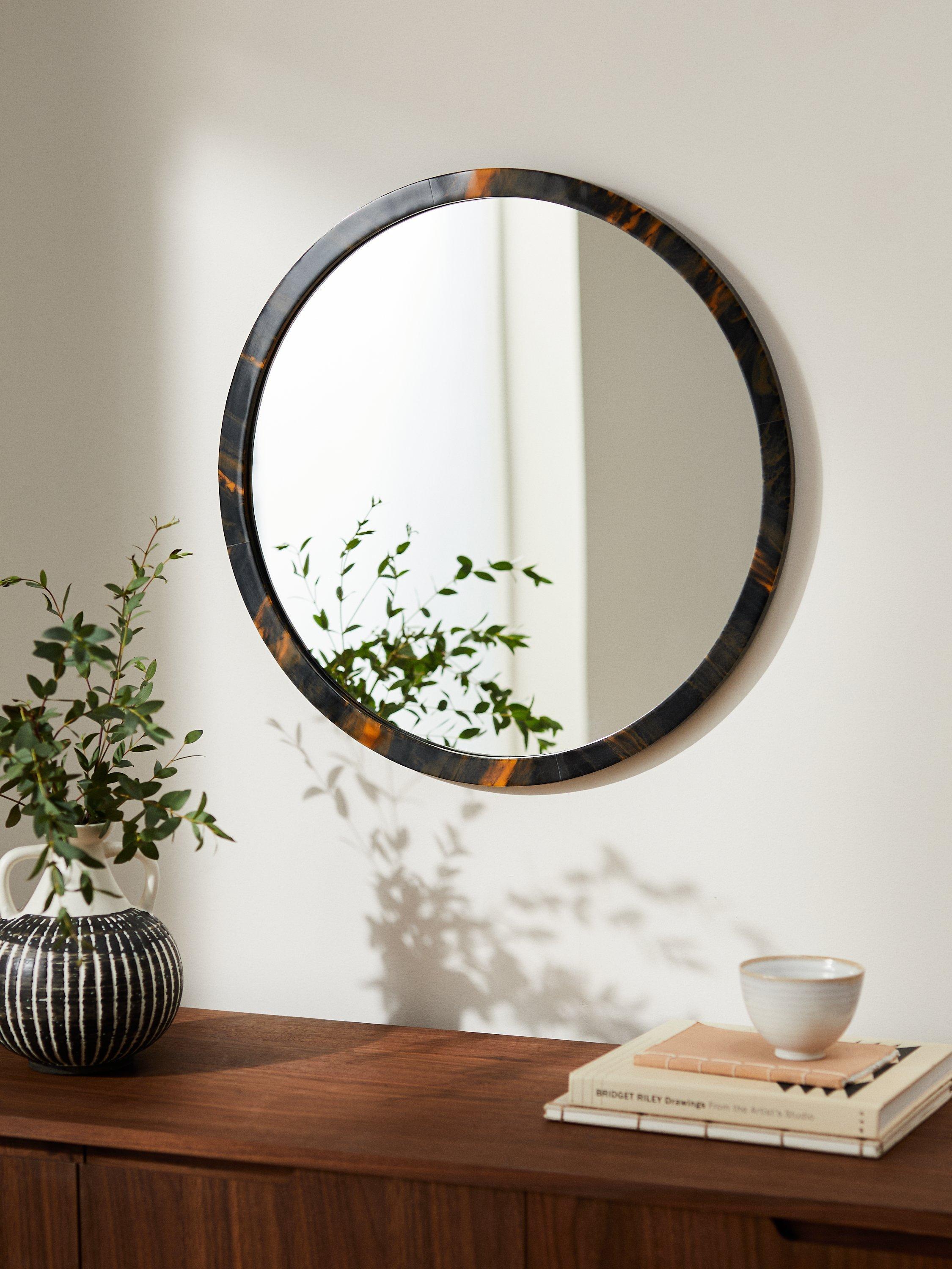 Handcrafted round mirror with a tortoiseshell-effect frame made from smooth resin. Easy to wall-mount using the keyhole fitting on the back.