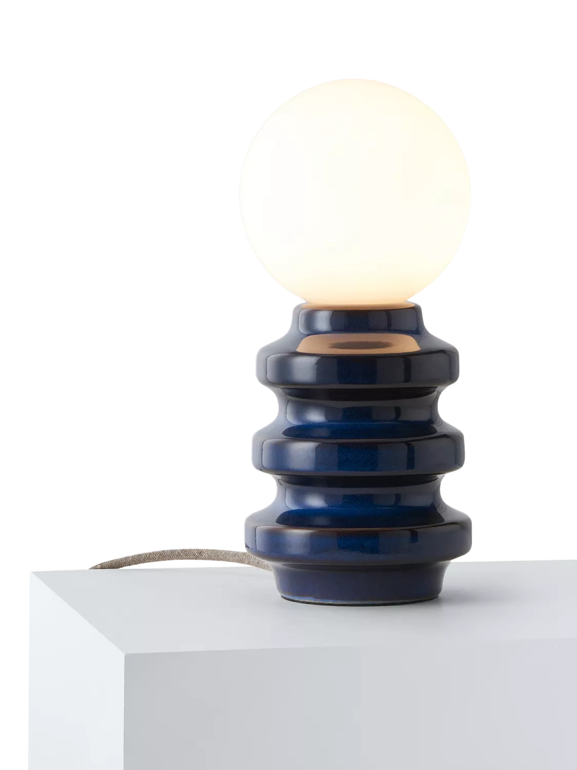 This Tower table lamp showcases a stunning blue reactive glaze paired with an opal duplex glass shade. With its sculptural ceramic base and frosted glass sphere, this lamp emits a beautiful glow.