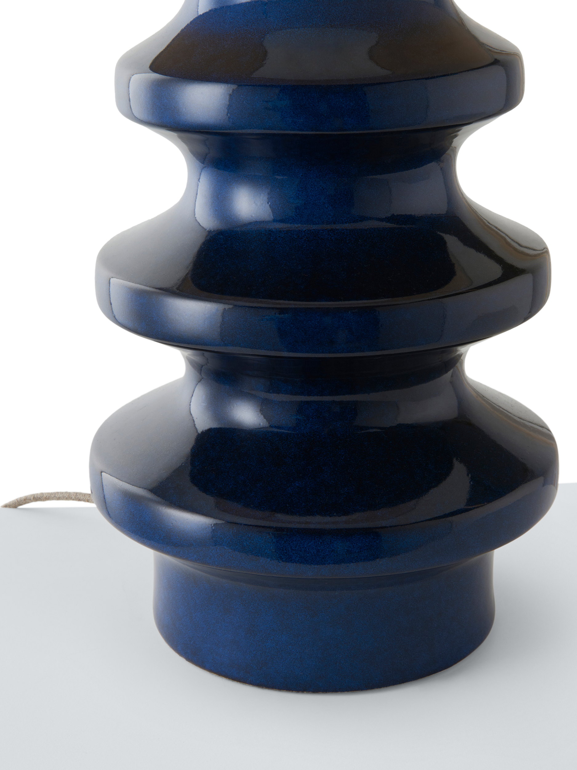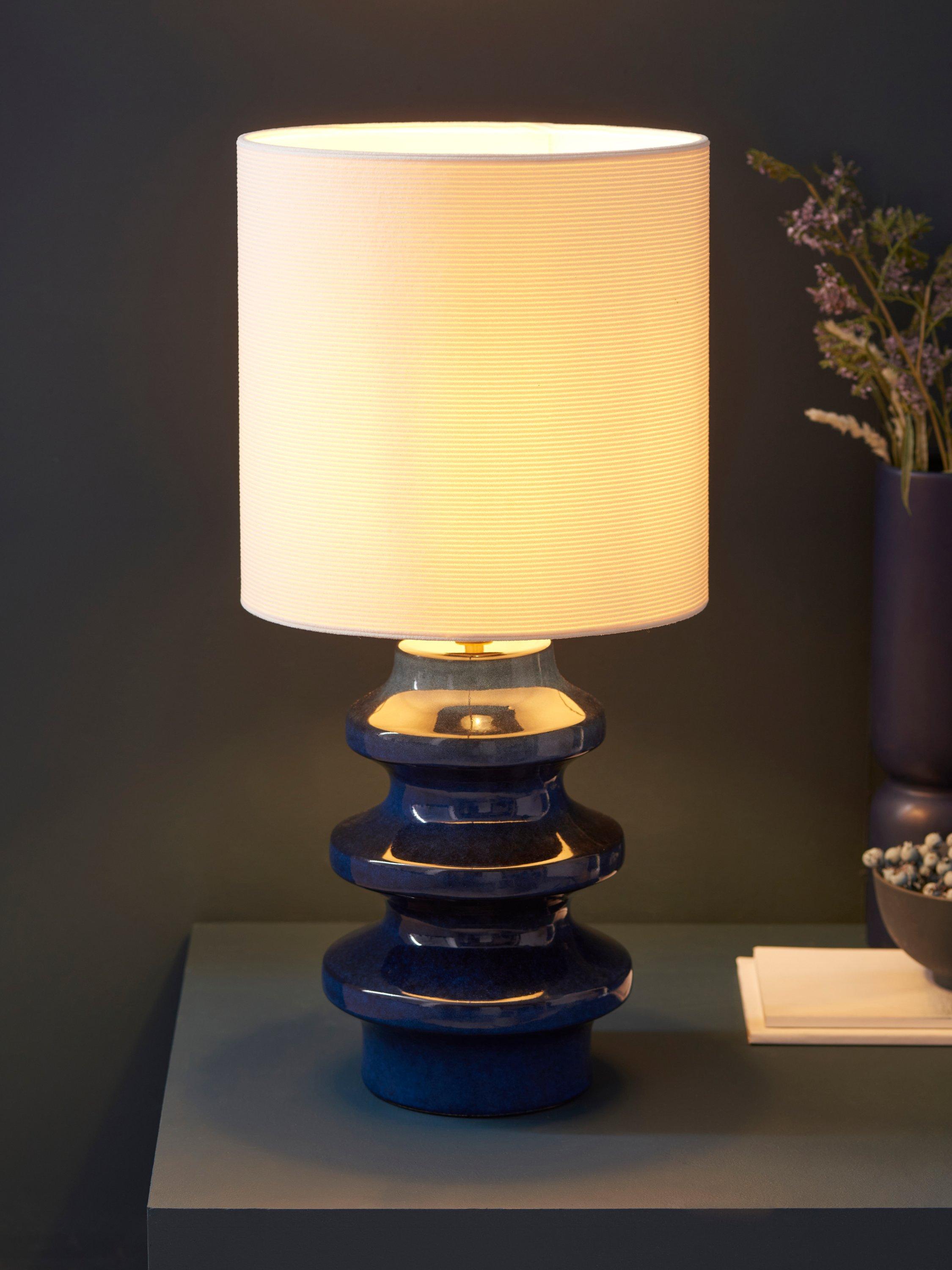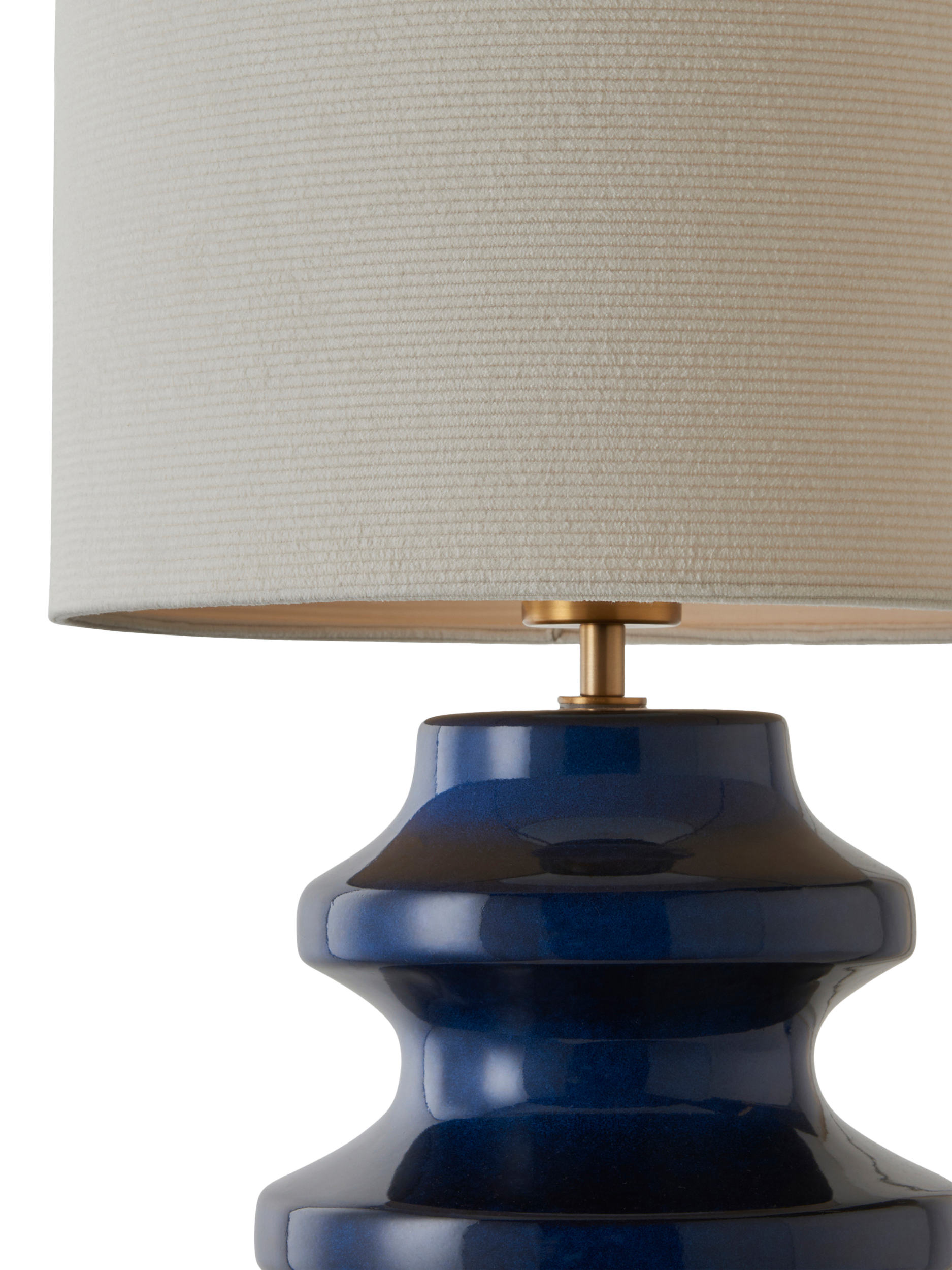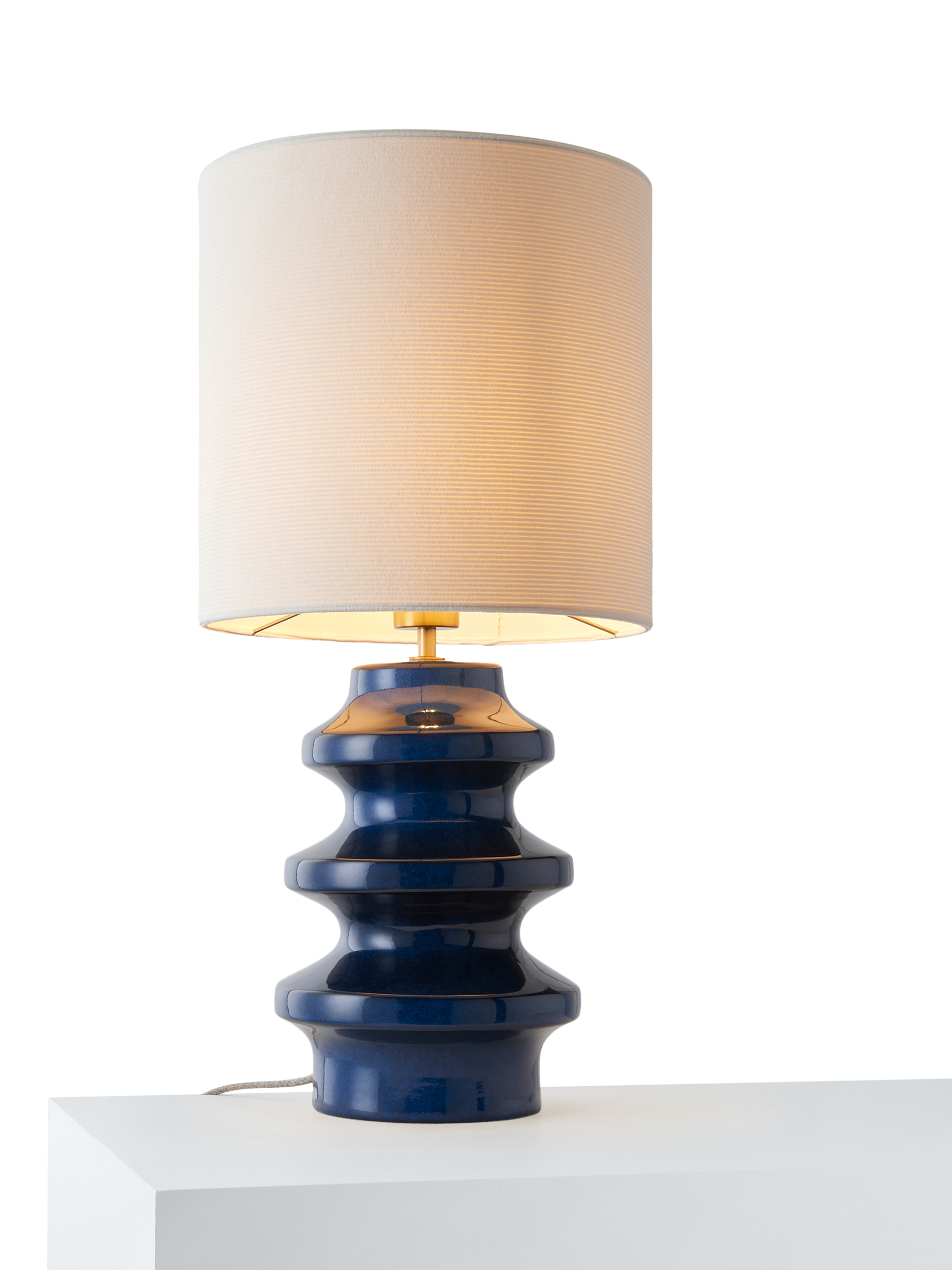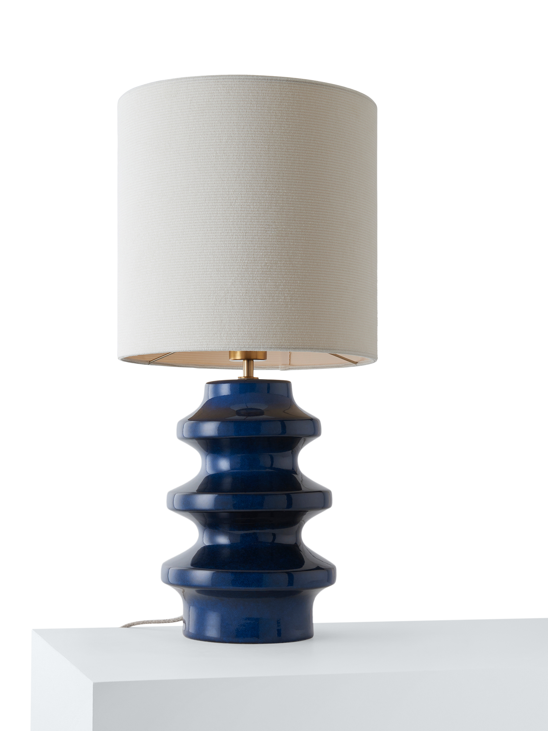 The Tower XL table lamp is a stunning piece that combines a striking blue reactive glaze with a sculptural ceramic base. The eye-catching design is complemented by a luxurious white corduroy shade, achieving a beautiful balance of colour and texture.