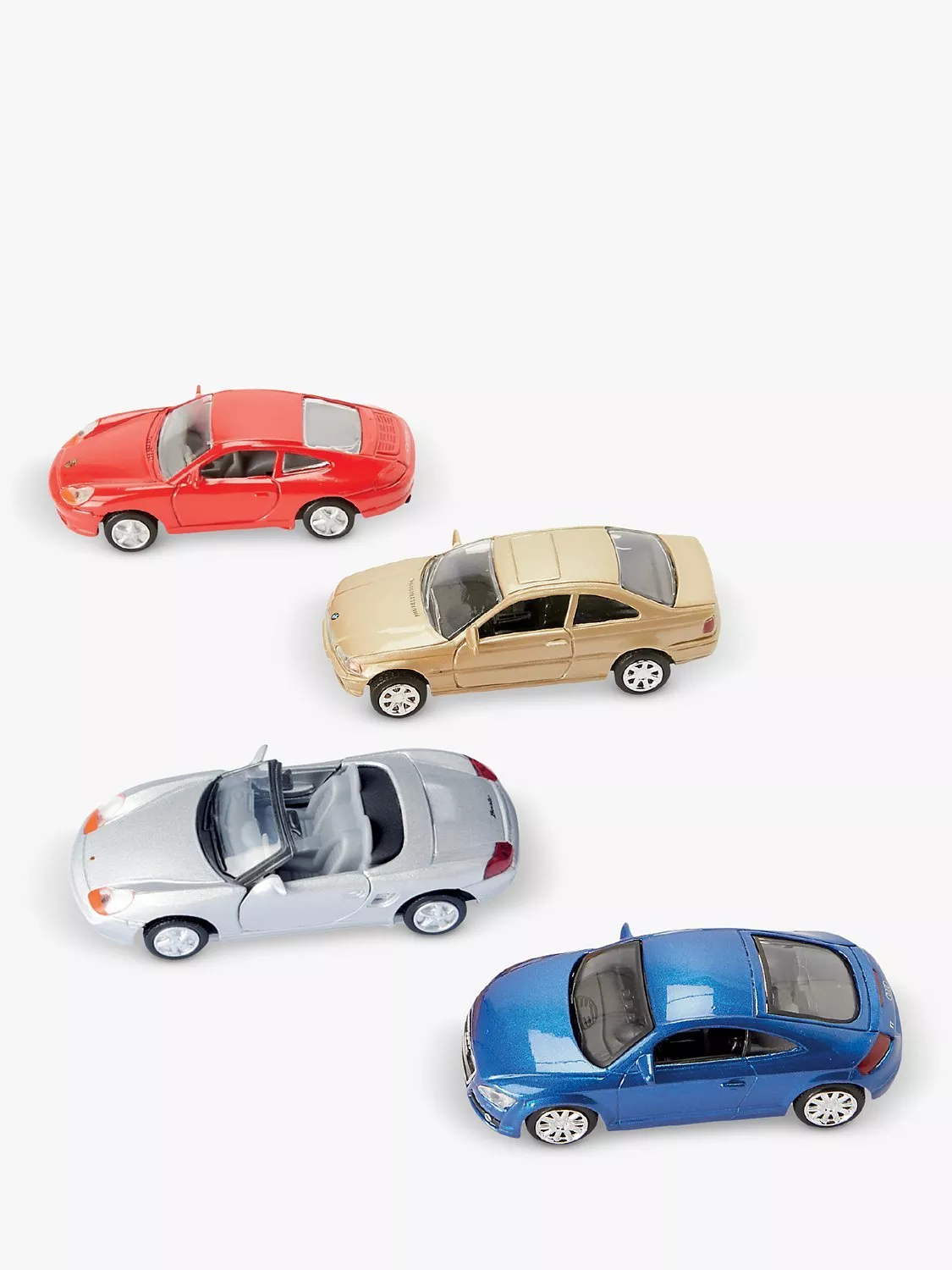 Pack of four toy cars in different colours and with die-cast detailing. Boxed in giftable window packaging.