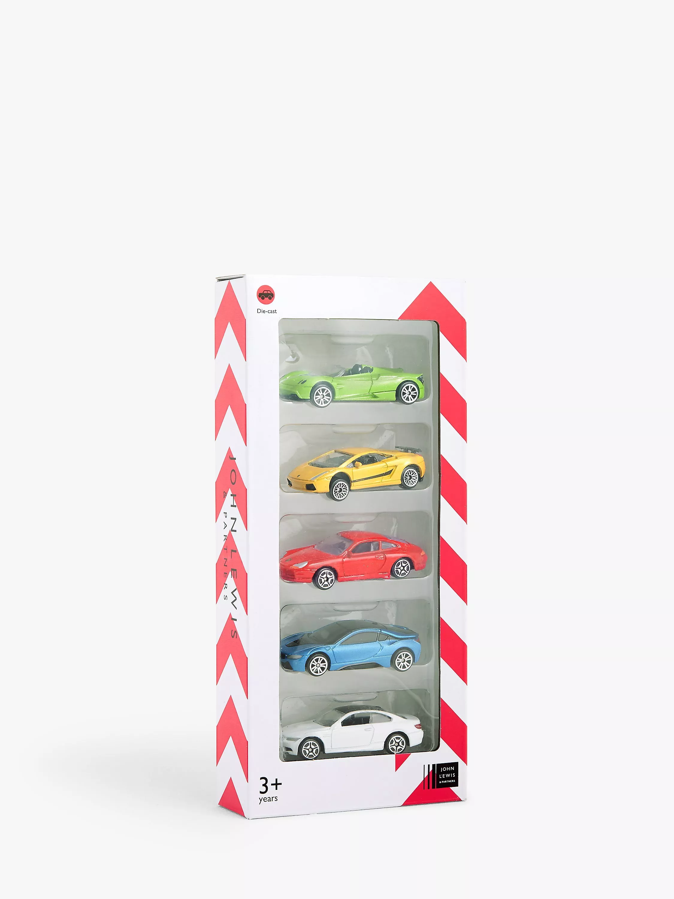 Pack of five toy cars in different colours and with die-cast detailing. Boxed in giftable window packaging.