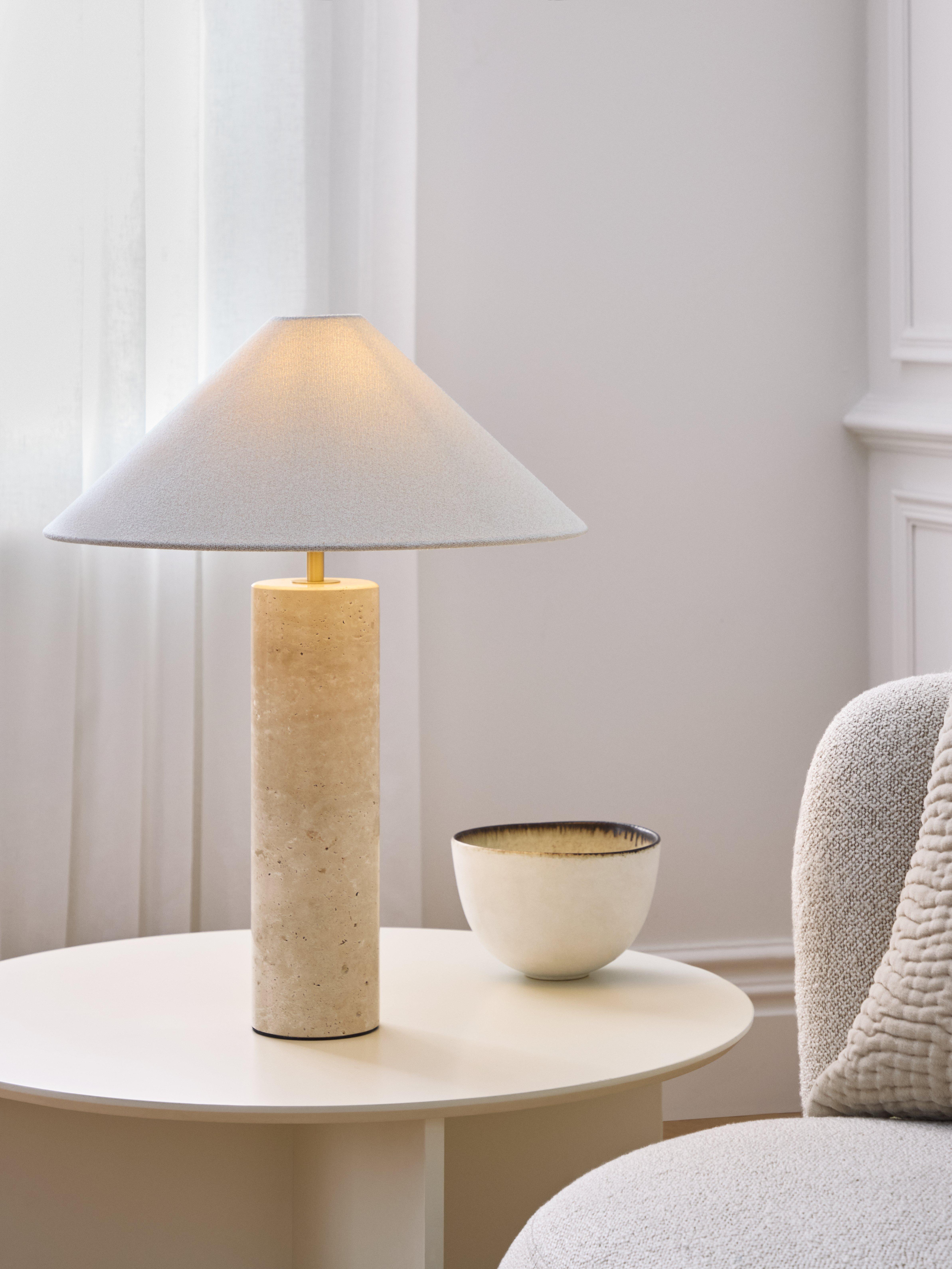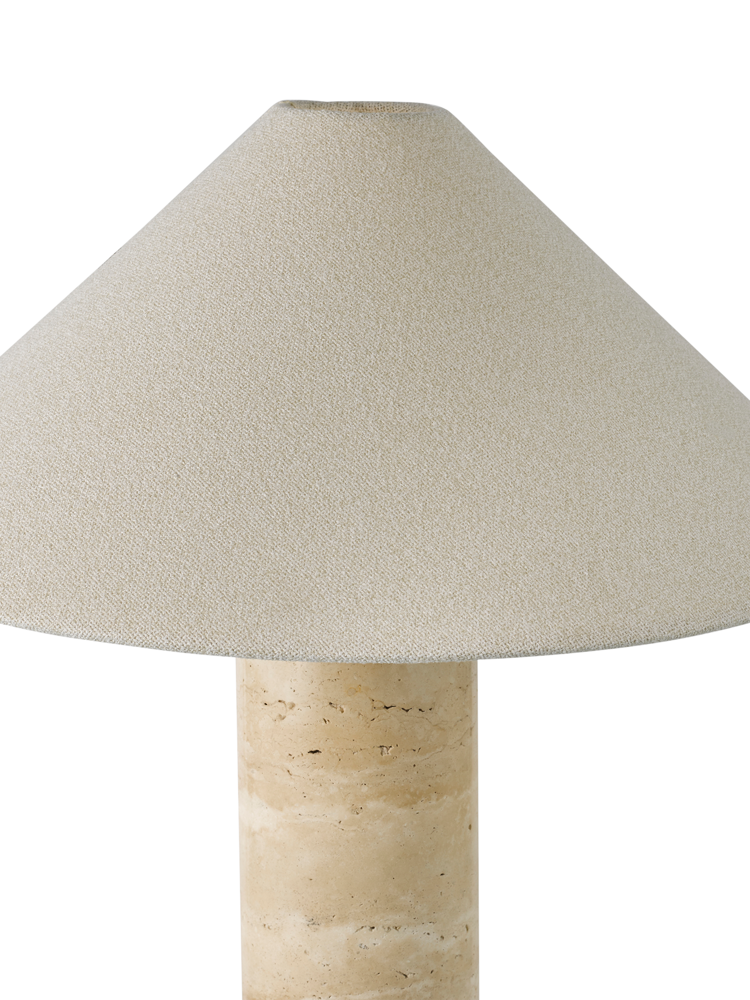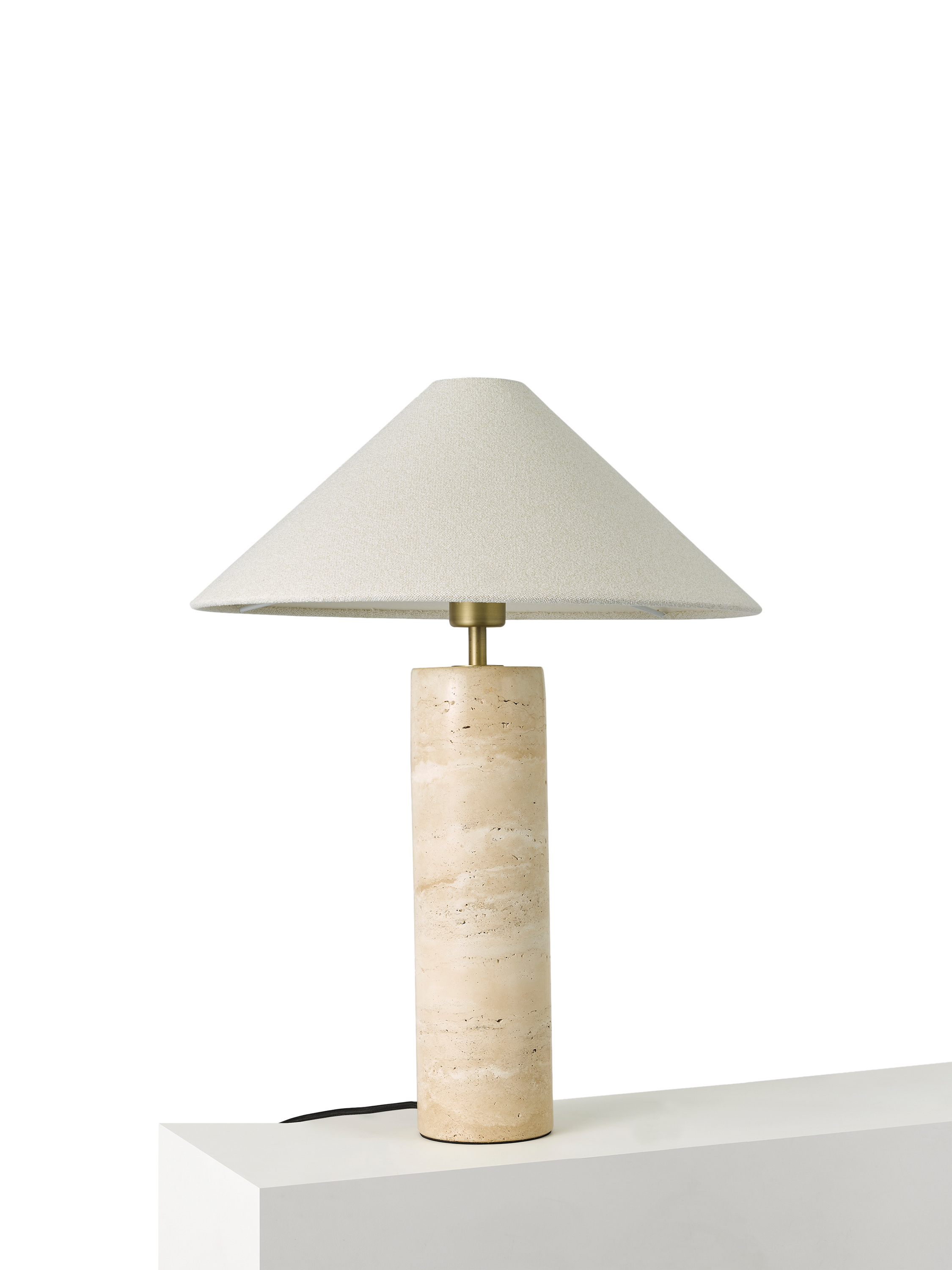 Natural matt travertine marble is used on this sensational table lamp. Hand finished and topped with a modern woven lampshade, with a braided cable.
