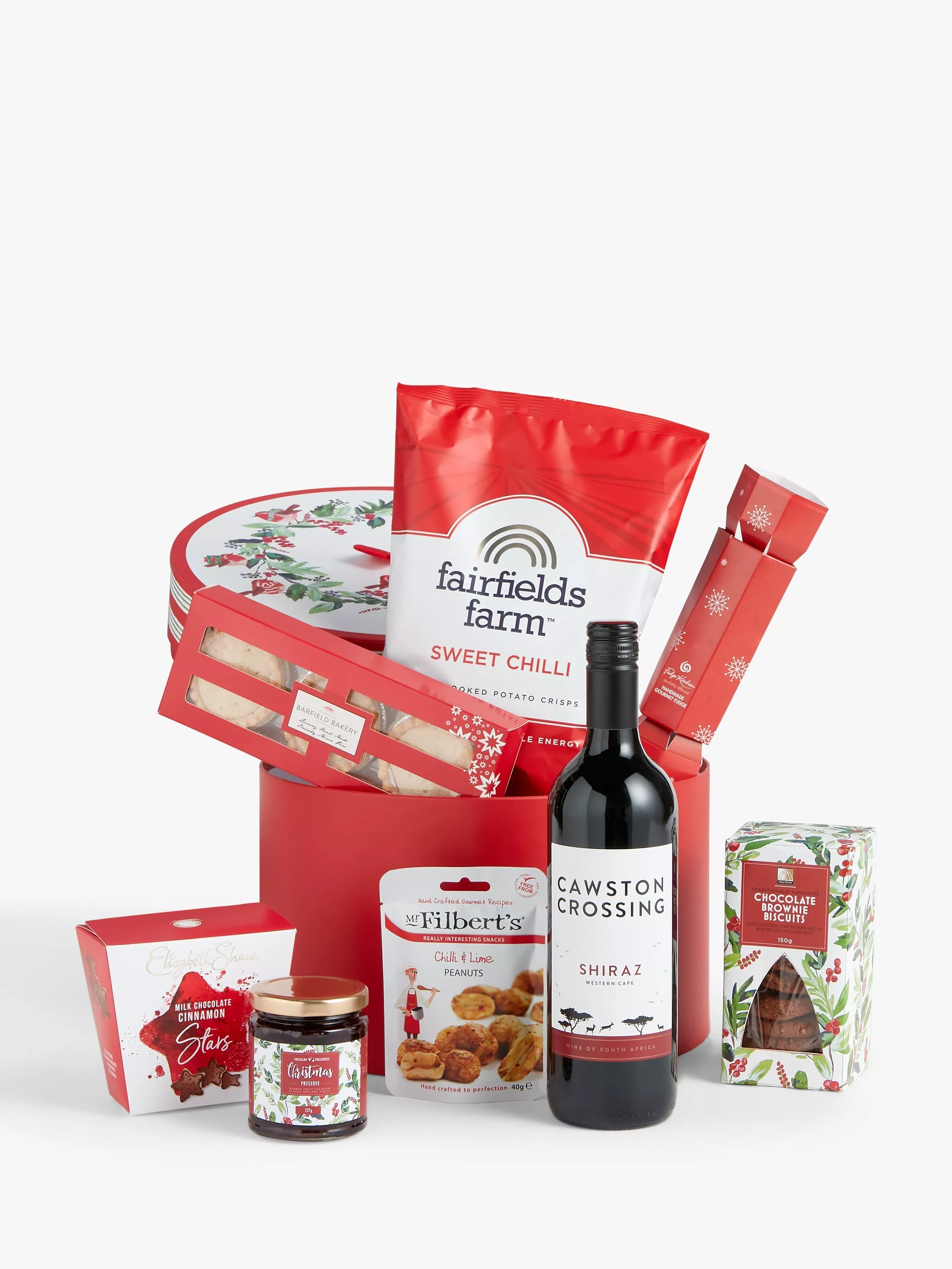 A selection of treats for Christmas, including mince pies and milk chocolate cinnamon stars for you to enjoy. There's a full bottle of South African Shiraz to wash it all down with.