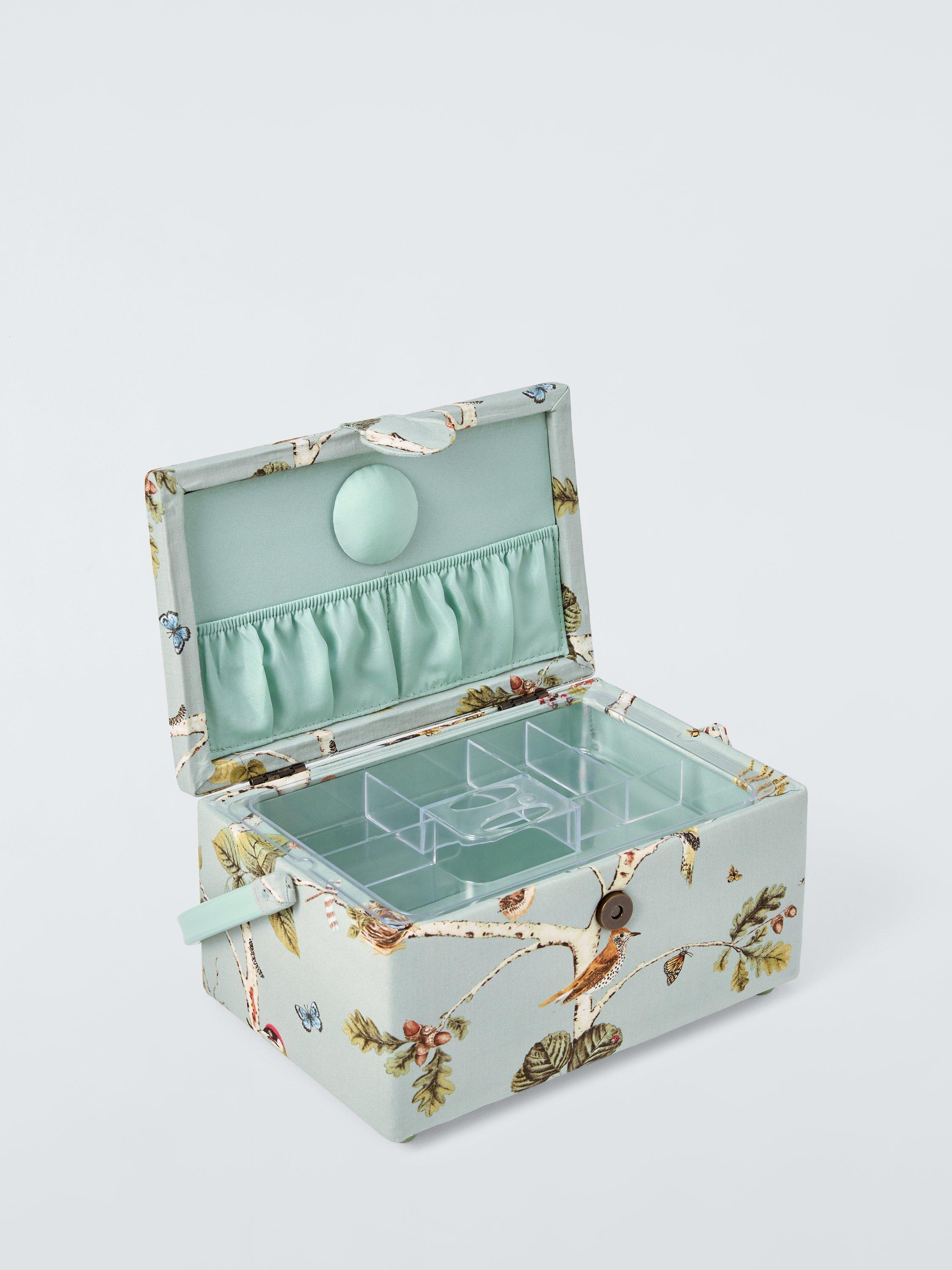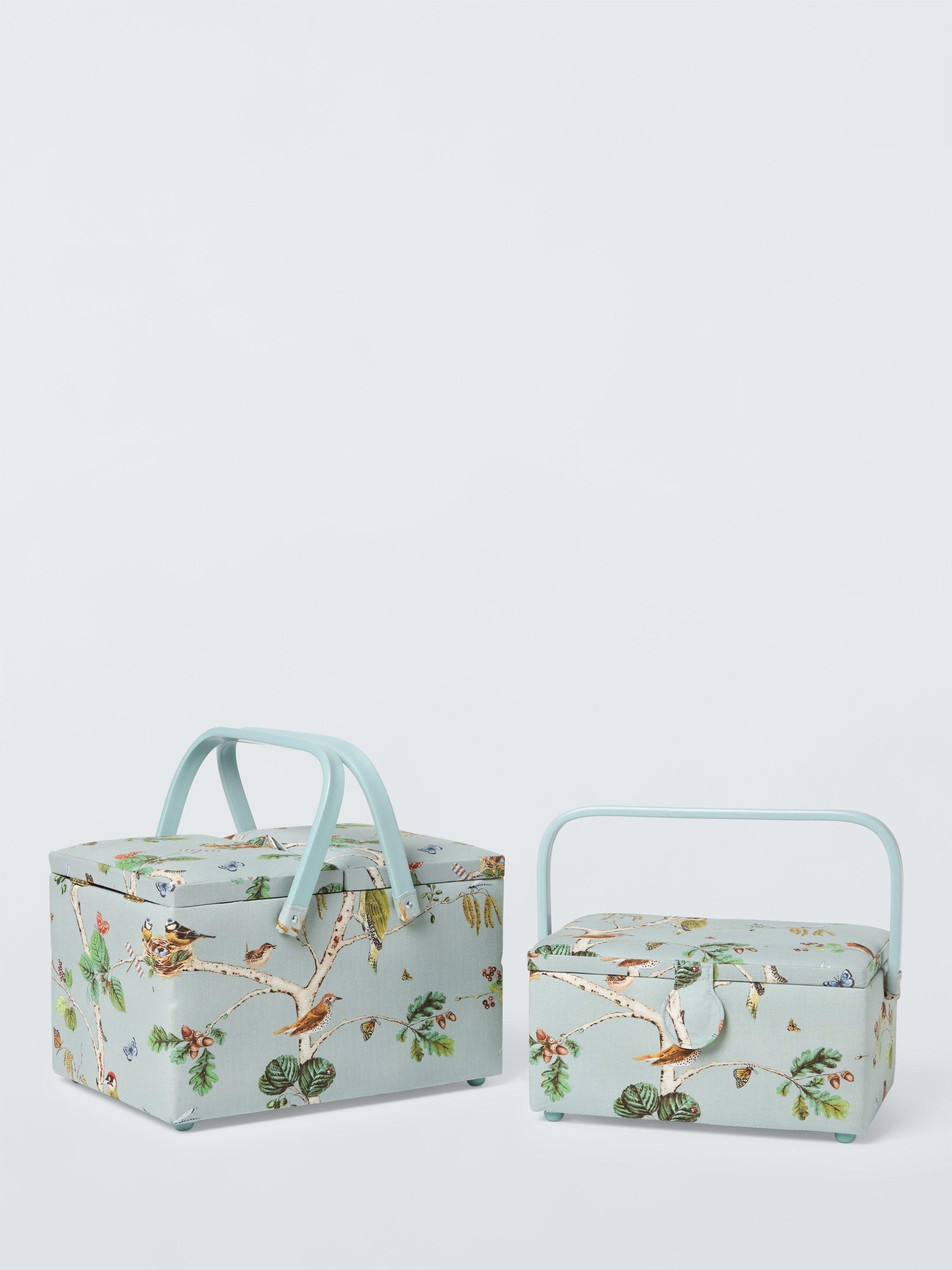 Covered in soft printed cotton, this rectangular sewing basket has a grab handle that allows for ease of transport enabling you to sew on the go. It also has a removable plastic tray with plenty of compartment space for needles, thimbles and threads allowing you to organise your sewing kit in preparation for your next project. The removable tray lifts to reveal a spacious compartment that can be used for storing fabrics and other essential equipment. Finished with a nature inspired print, this basket is an essential for serious sewers.