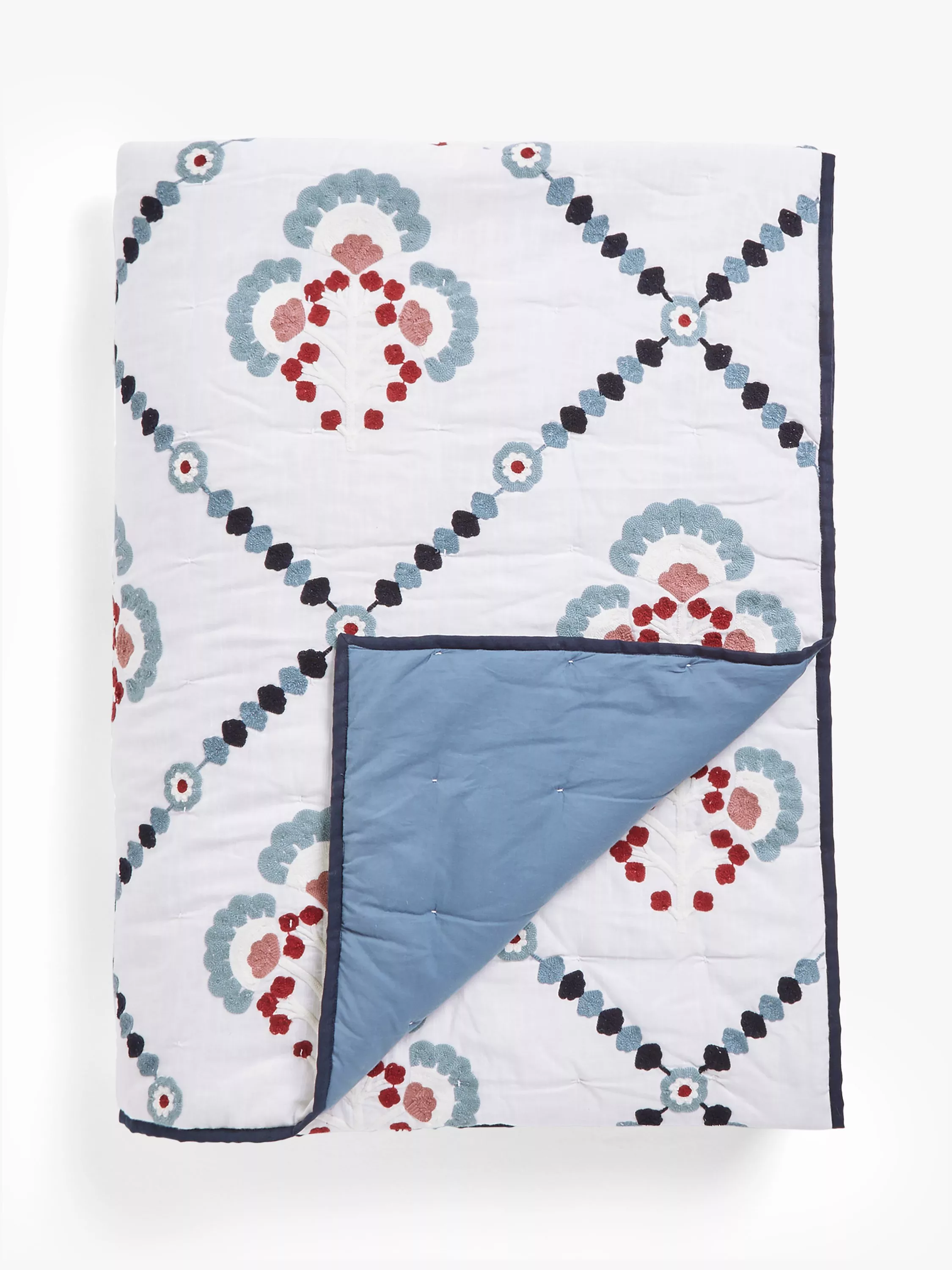 A trelliswork of embroidered abstract flowers adorns this pretty, hand-quilted cotton bedspread, giving your room a modern country look.